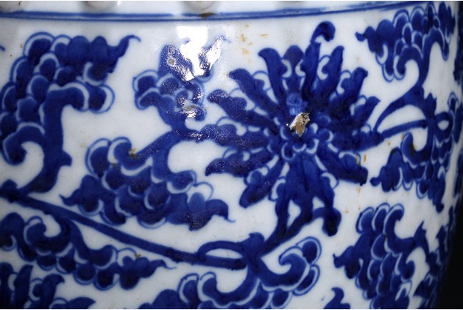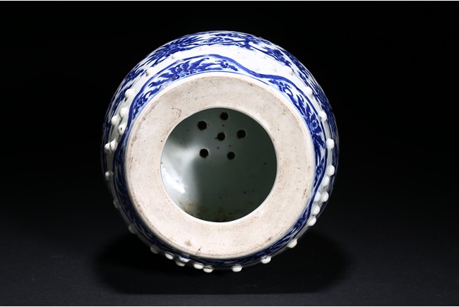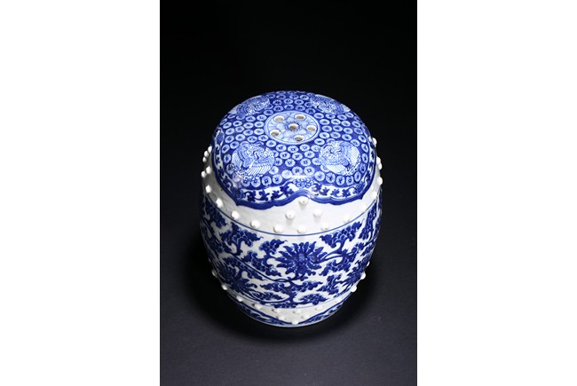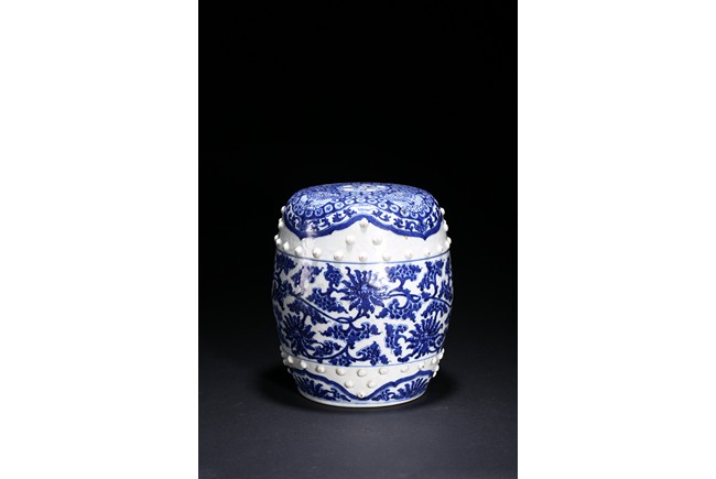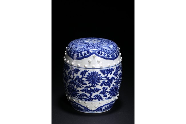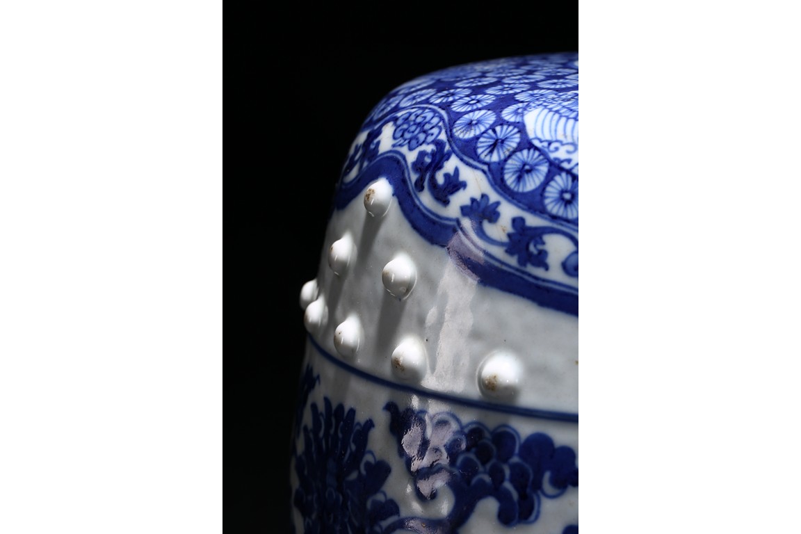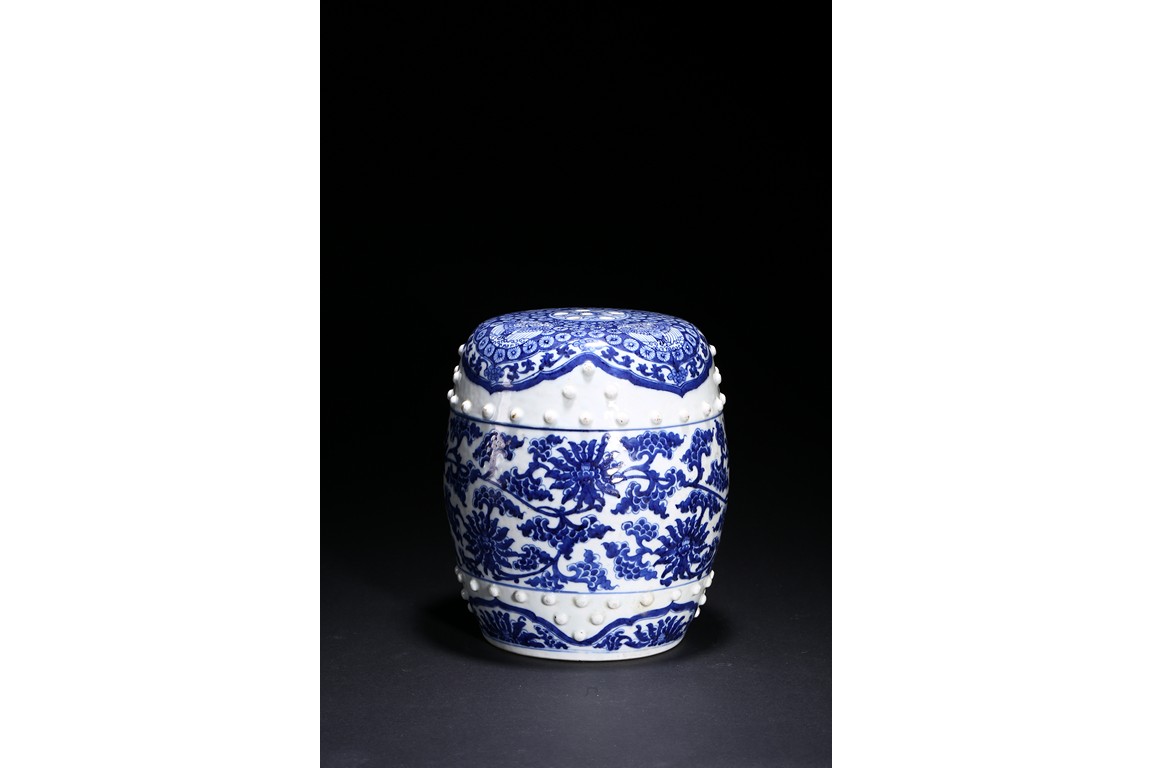 A SMALL BLUE AND WHITE STOOL 十七世紀 青花纏枝蓮紋文房小古墩