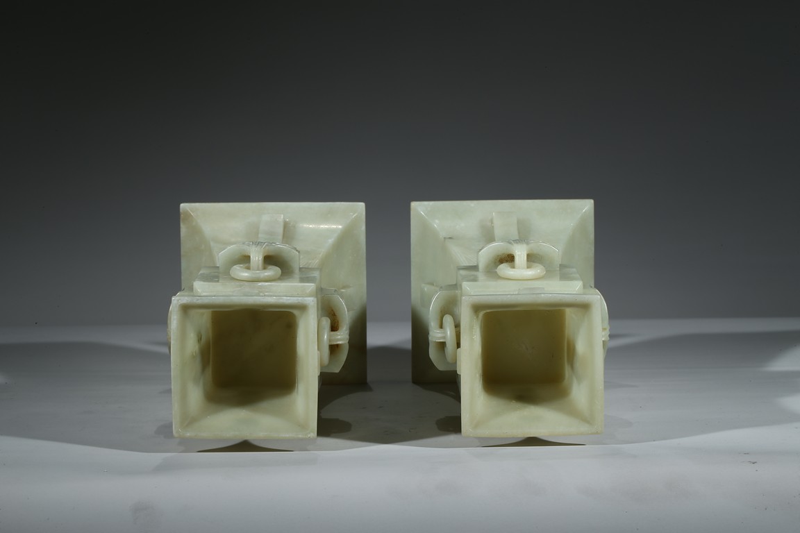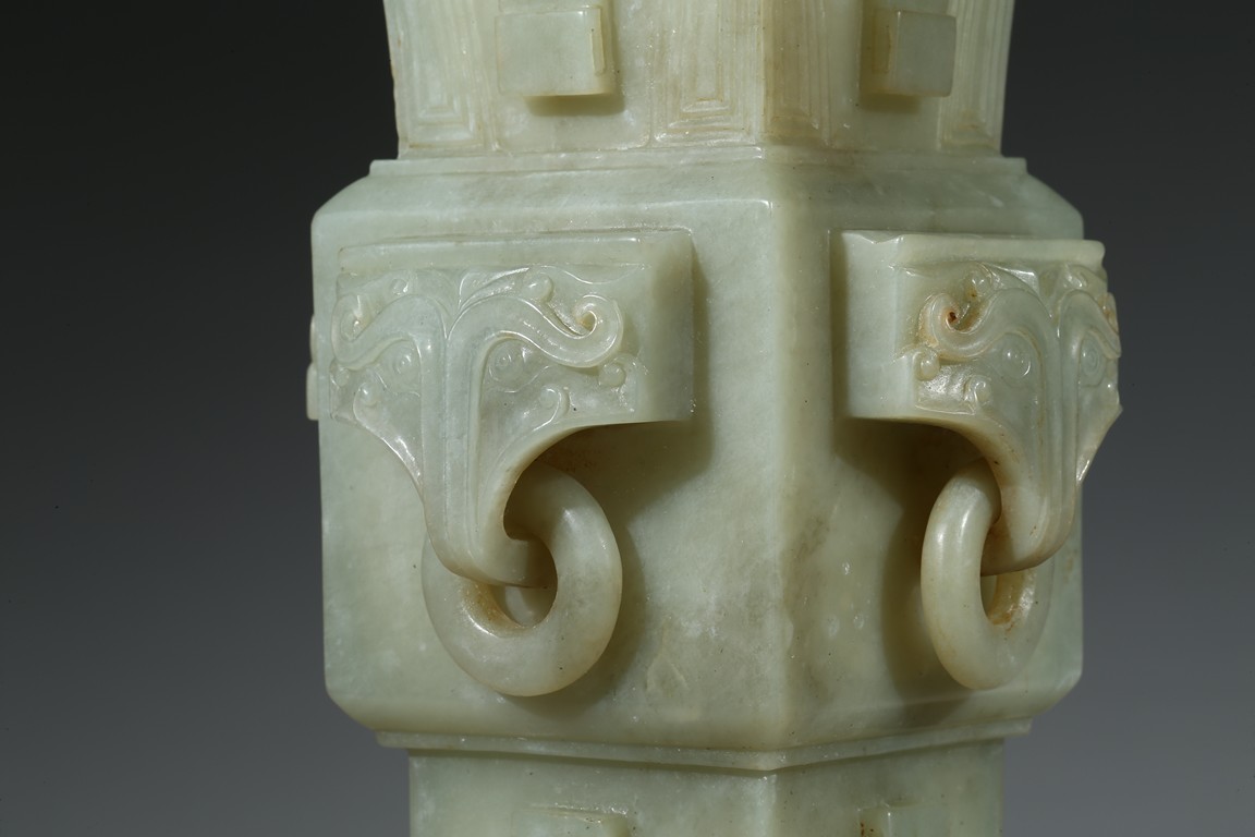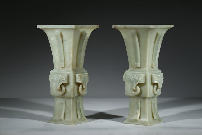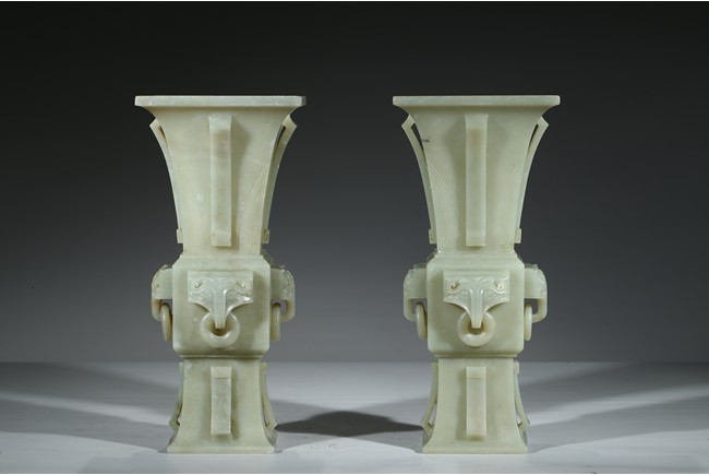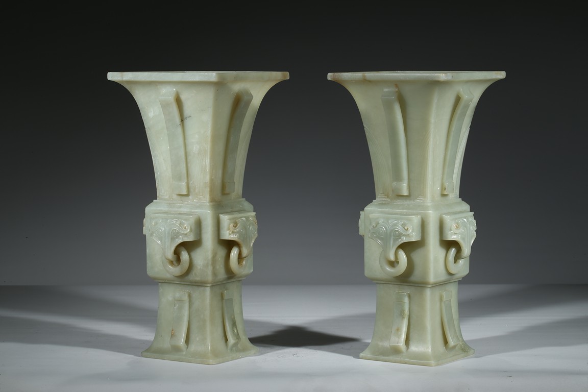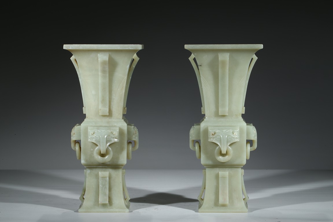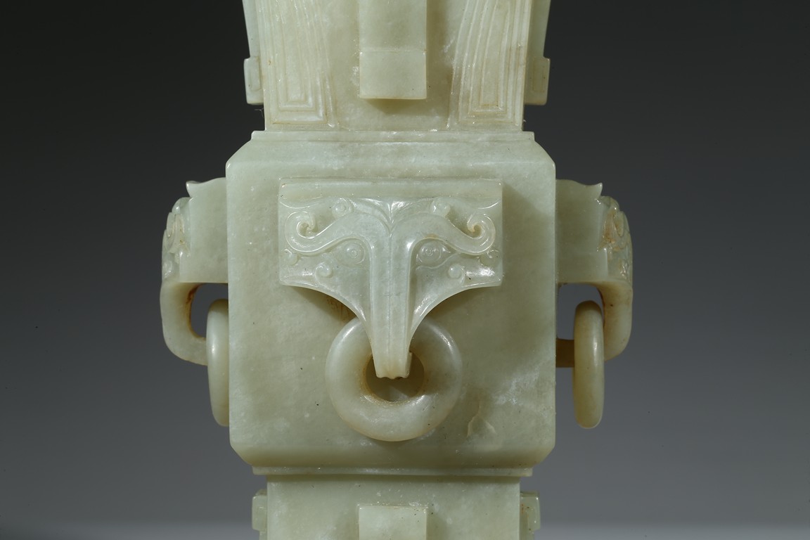 Of archaistic gu-form, each side of vase body carved with a mythical beast head suspended with loose ring. Qing Dynasty period.