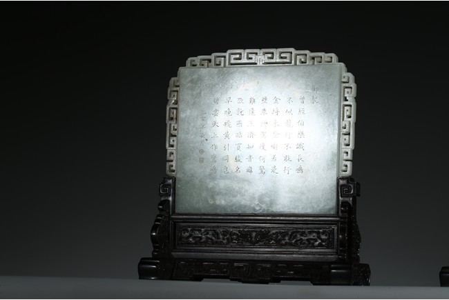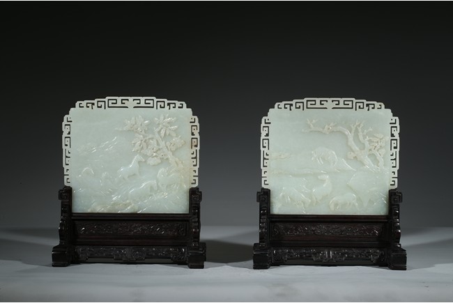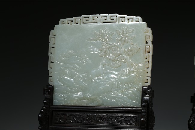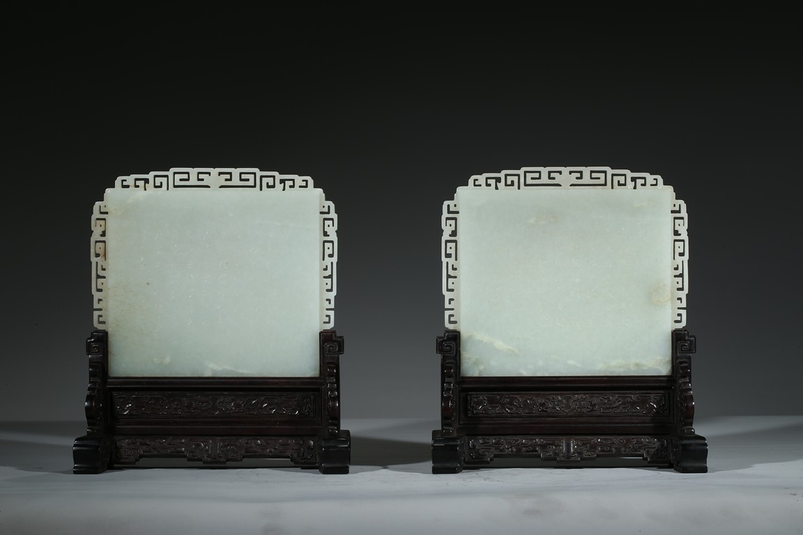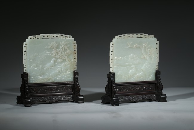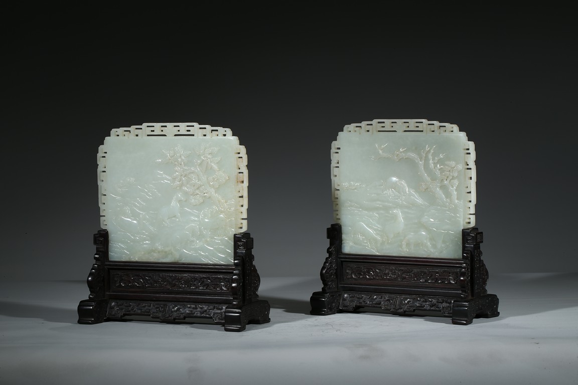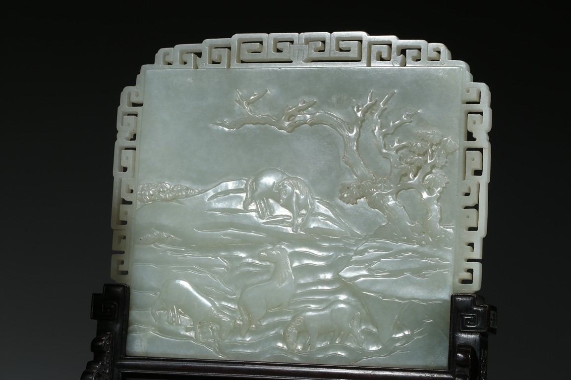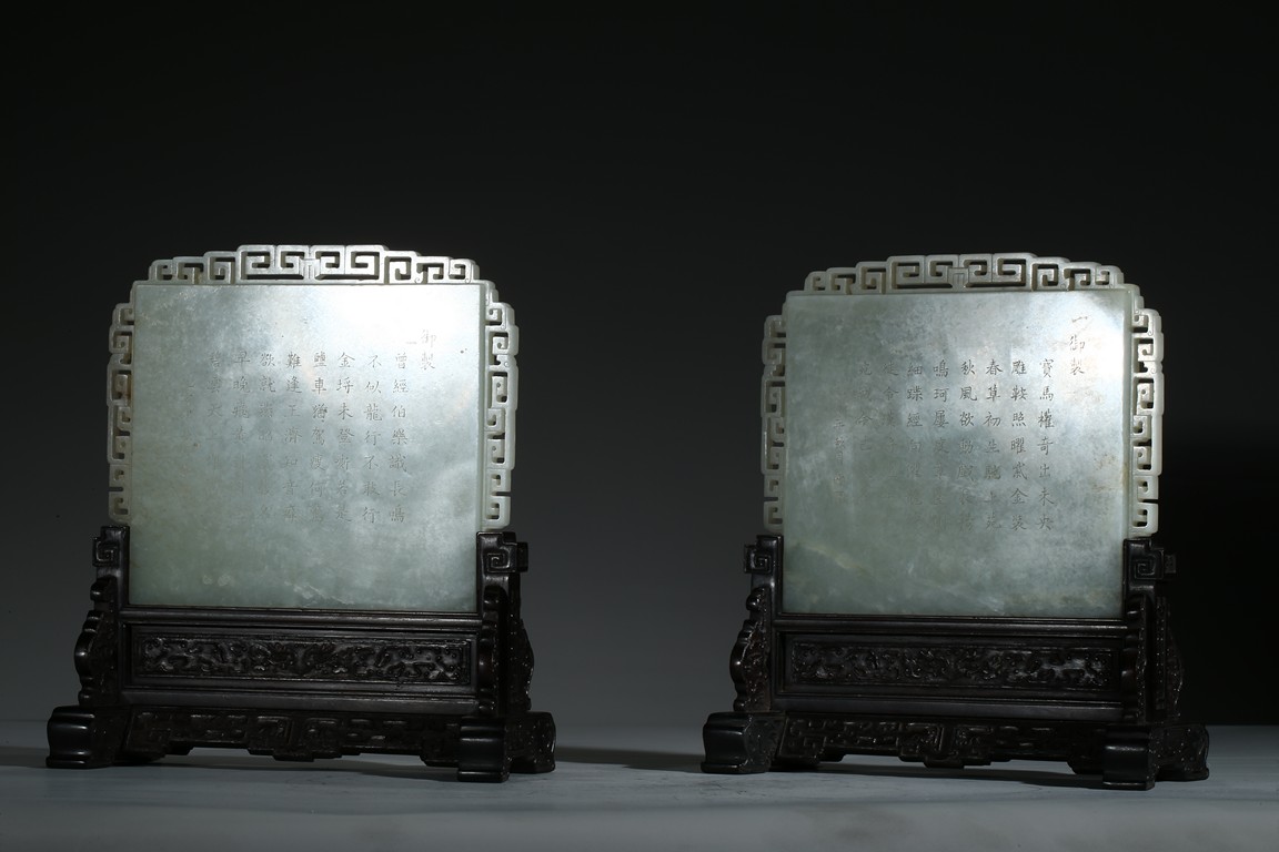 Each white jade table screen is carved to the front depicting horses in outdoor setting, the reverse finely incised with Imperial poem. Qing Dynasty period.