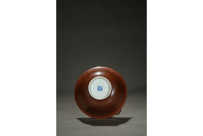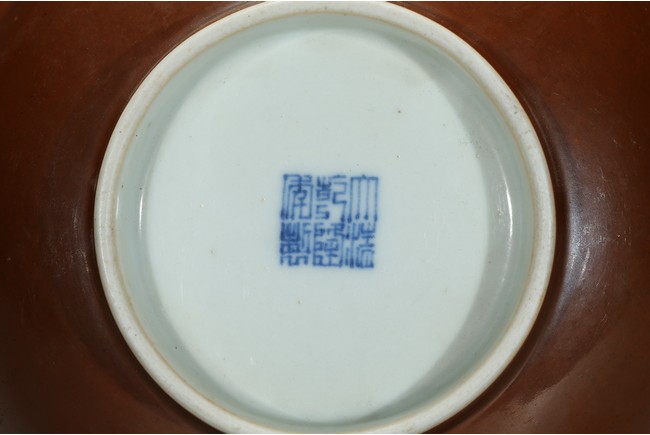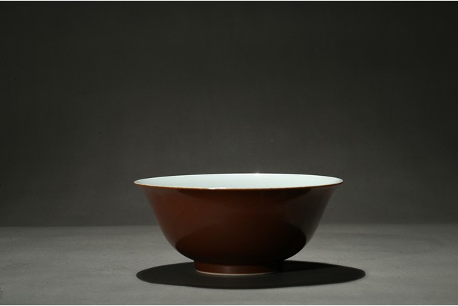 With rounded sides and raised to everted rim, covered to the exterior with glaze of russet-brown color, inside white, base with apocryphal six character QIANLONG mark. Qing Dynasty period.