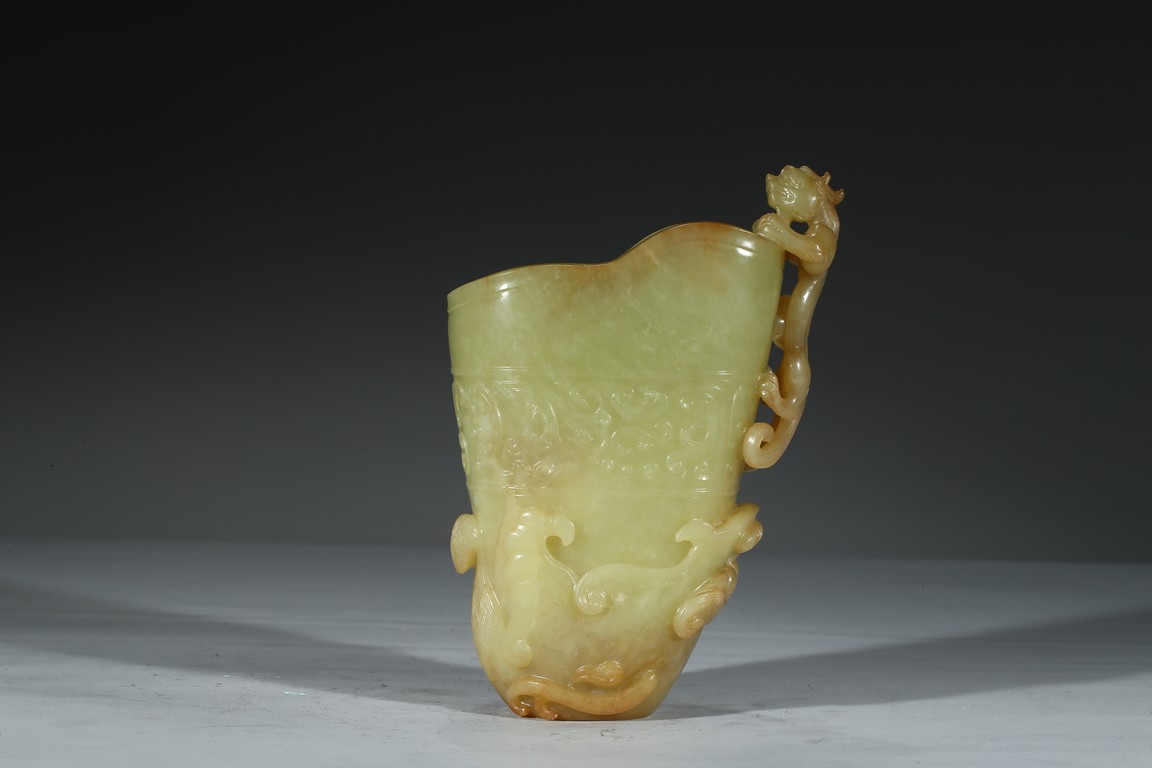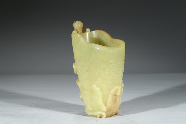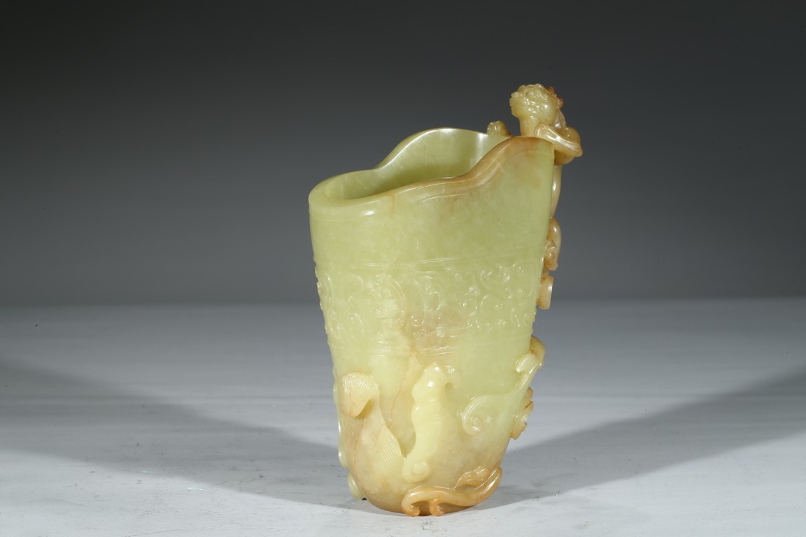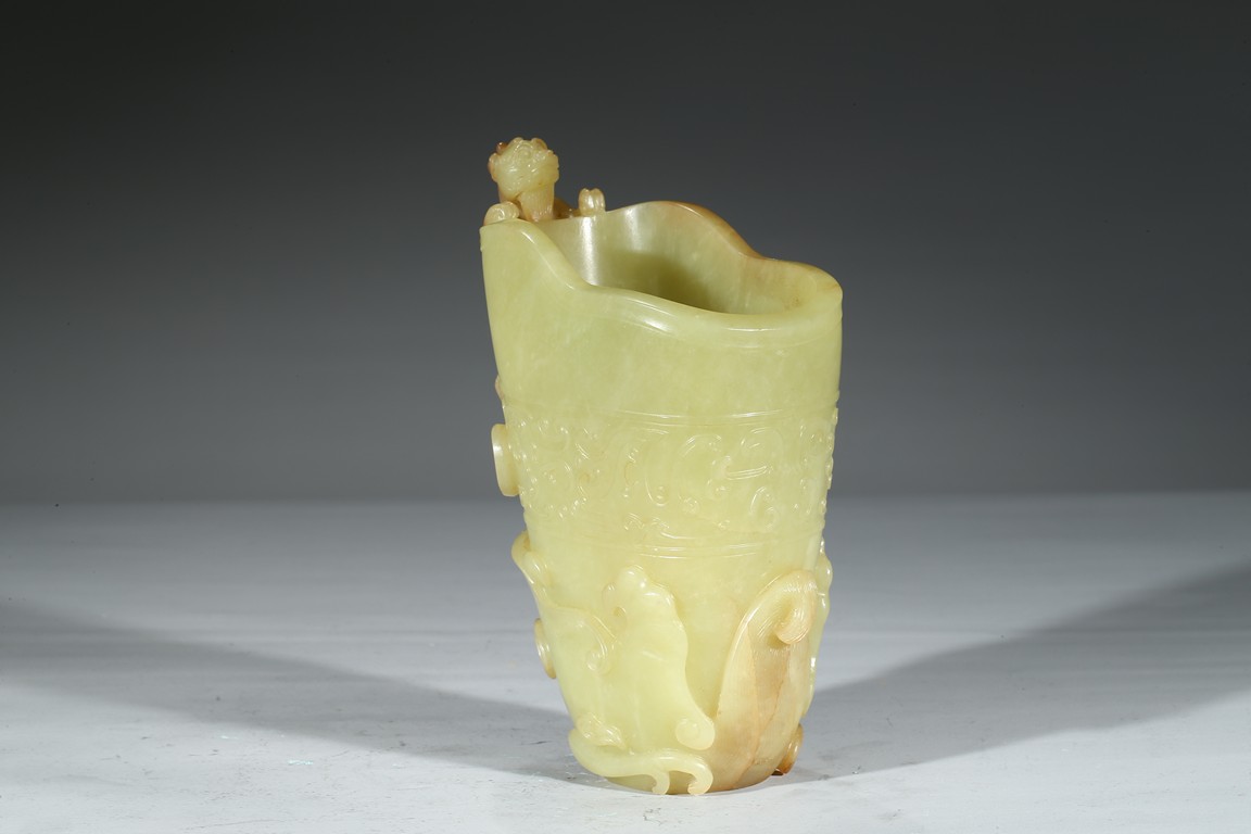 Modelled in the form a libation cup, the body decorated with a band of stylized curled pattern, the top carved and pierced in high relief with a chilong dragon with coiled body clambering on the mouth rim. The stone is of well polished and with attractive yellow and light beige tone. Qing Dynasty Qianlong Period.