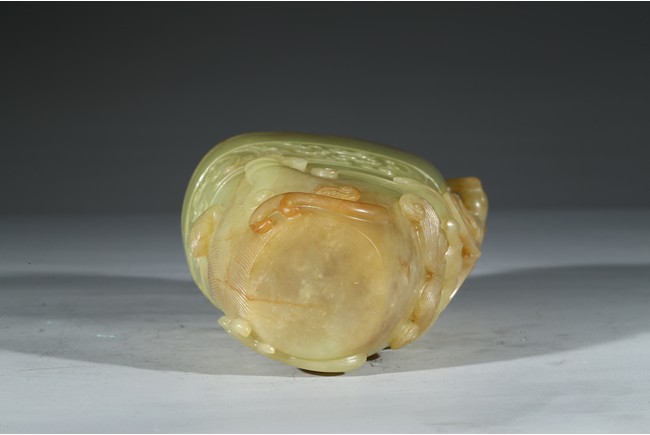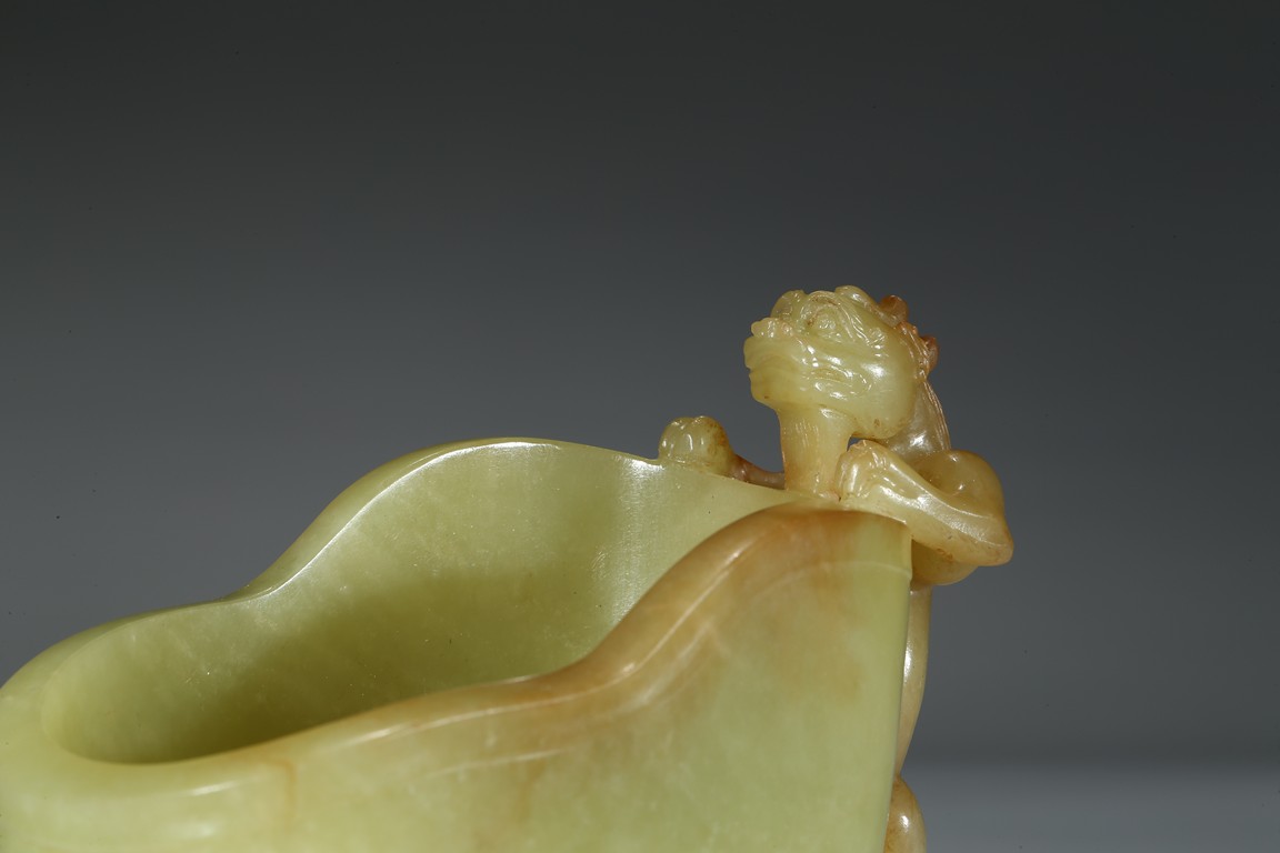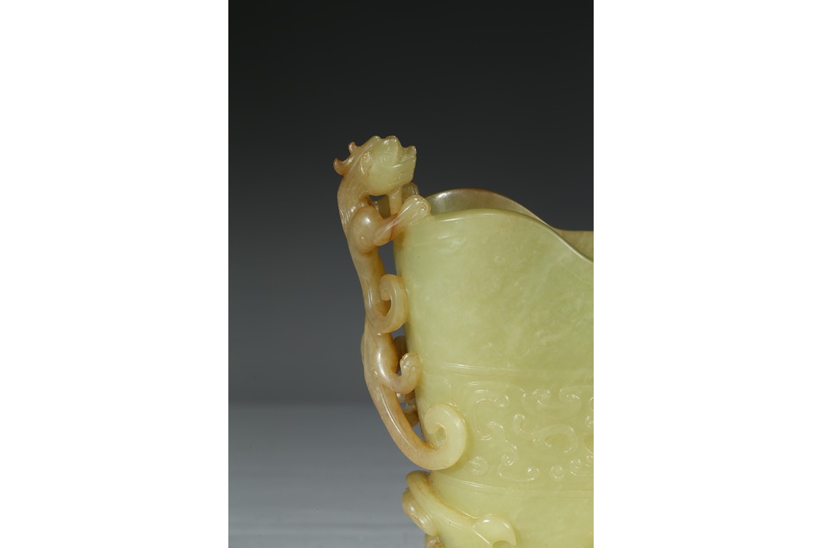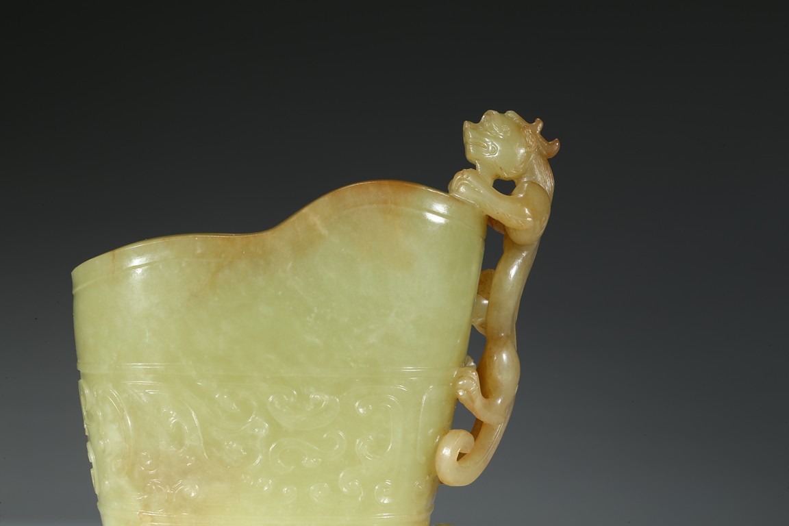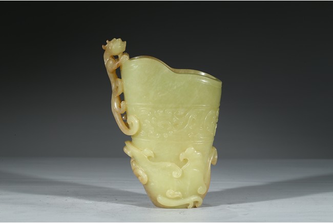 Modelled in the form a libation cup, the body decorated with a band of stylized curled pattern, the top carved and pierced in high relief with a chilong dragon with coiled body clambering on the mouth rim. The stone is of well polished and with attractive yellow and light beige tone. Qing Dynasty Qianlong Period.