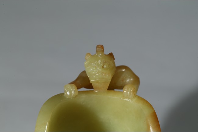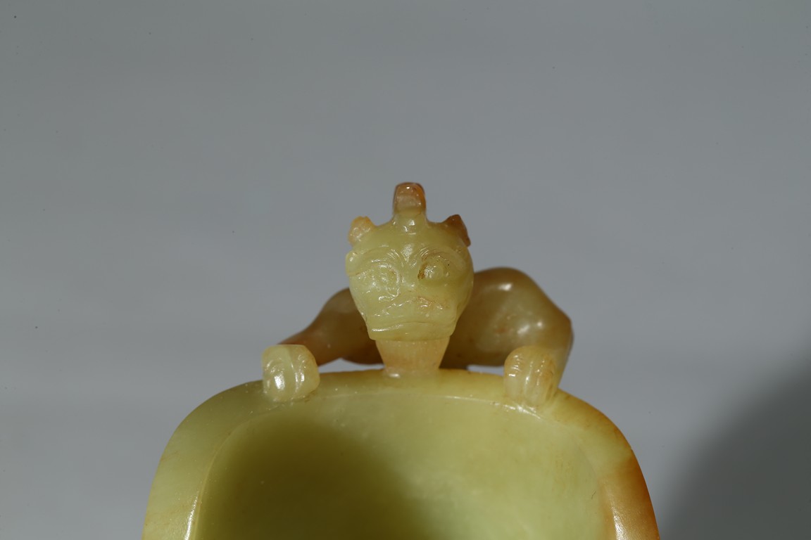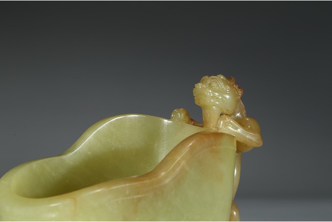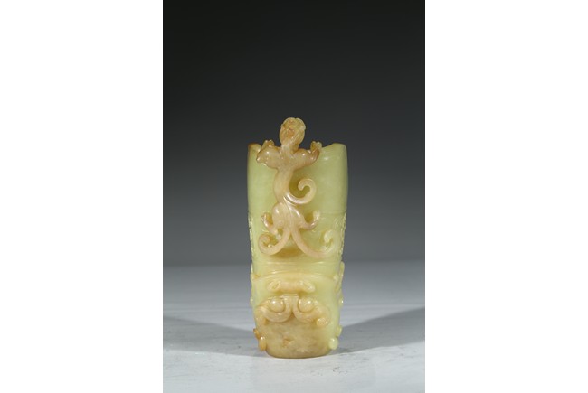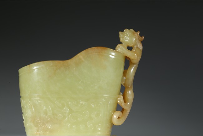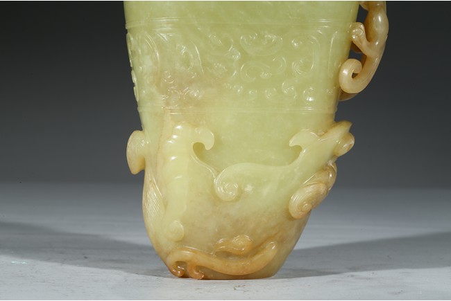 玉如凝脂,色彩柔和,甘青如柳,手感溫潤,其色如新剝熟粟,非常罕貴,高濂《遵生八箋》曾論黃玉「黃為中色,且不易得」,同時指出:「然甘黃如蒸粟色,佳,焦黃為下。甘青色如新柳,近亦無之」。此可見黃玉珍罕至極,更曾比羊脂白玉矜貴。器呈羊角形,掏膛中空,打磨光滑。杯口斜削,上粗下細。器身飾鳳鳥紋、夔龍紋、獅面紋。立體雕飾一螭龍伏於口沿,紋飾密而不亂。整器雕工精美,紋飾層次感強,極富藝術感染力。 (參閱香港蘇富比拍賣有限公司2013年秋季拍賣會3201 號拍品成交價:HKD 1000000,參閱《故宮博物院藏文物珍品全集玉器下》136 玉夔龍紋活環觥)