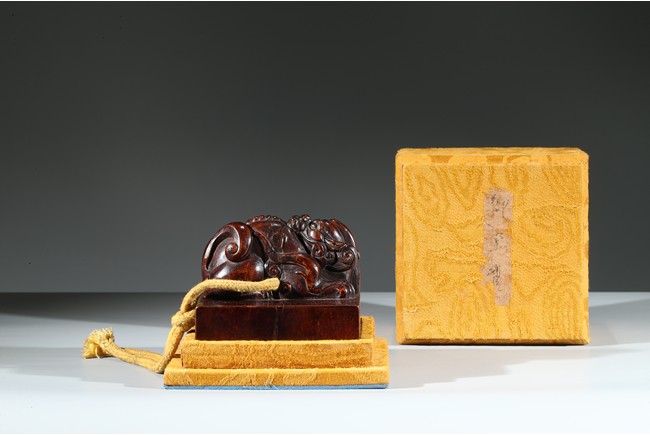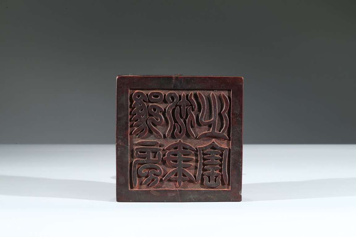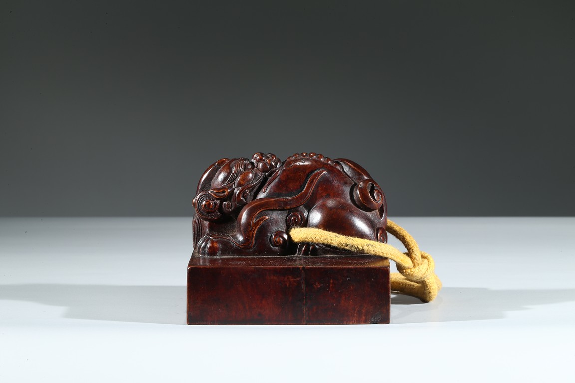 The square seal finely carved to the top with a recumbent mythical lion, with head turned back, the mane and eyebrow finely detailed with incised lines, the seal face carved with six characters. Qing Dynasty period.