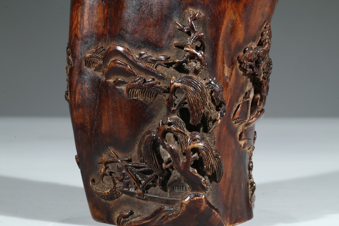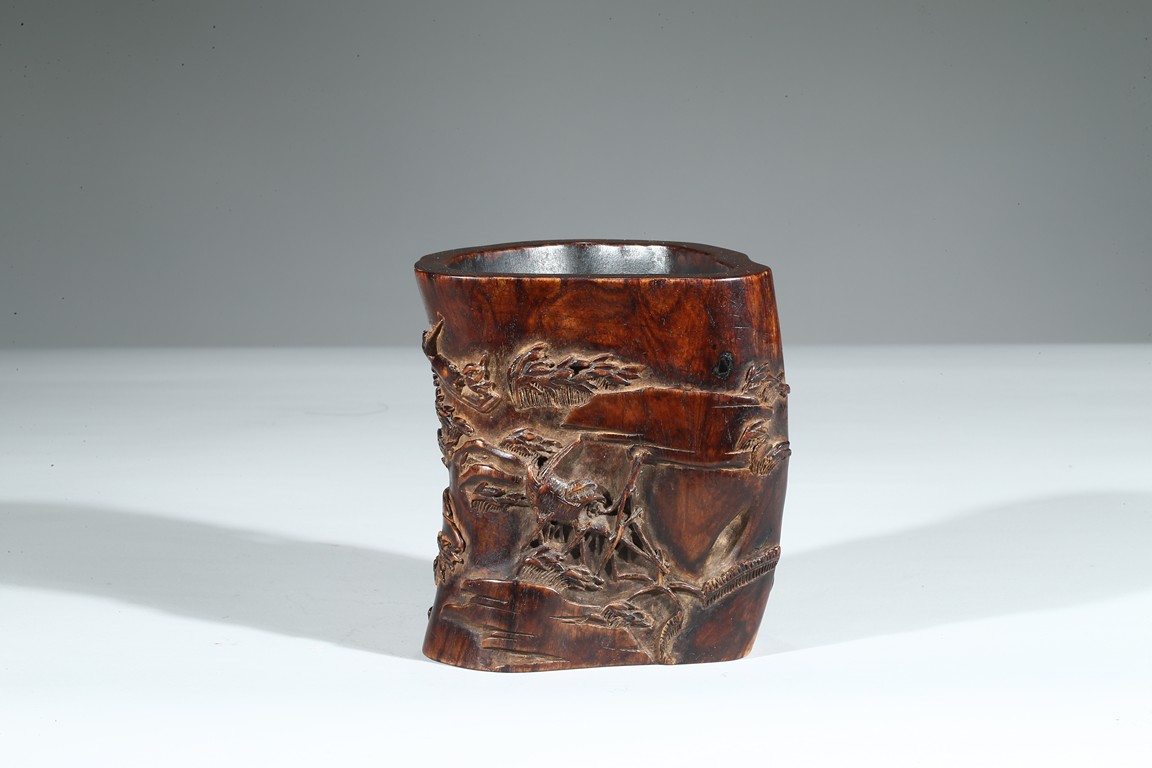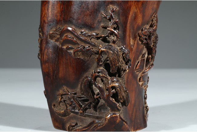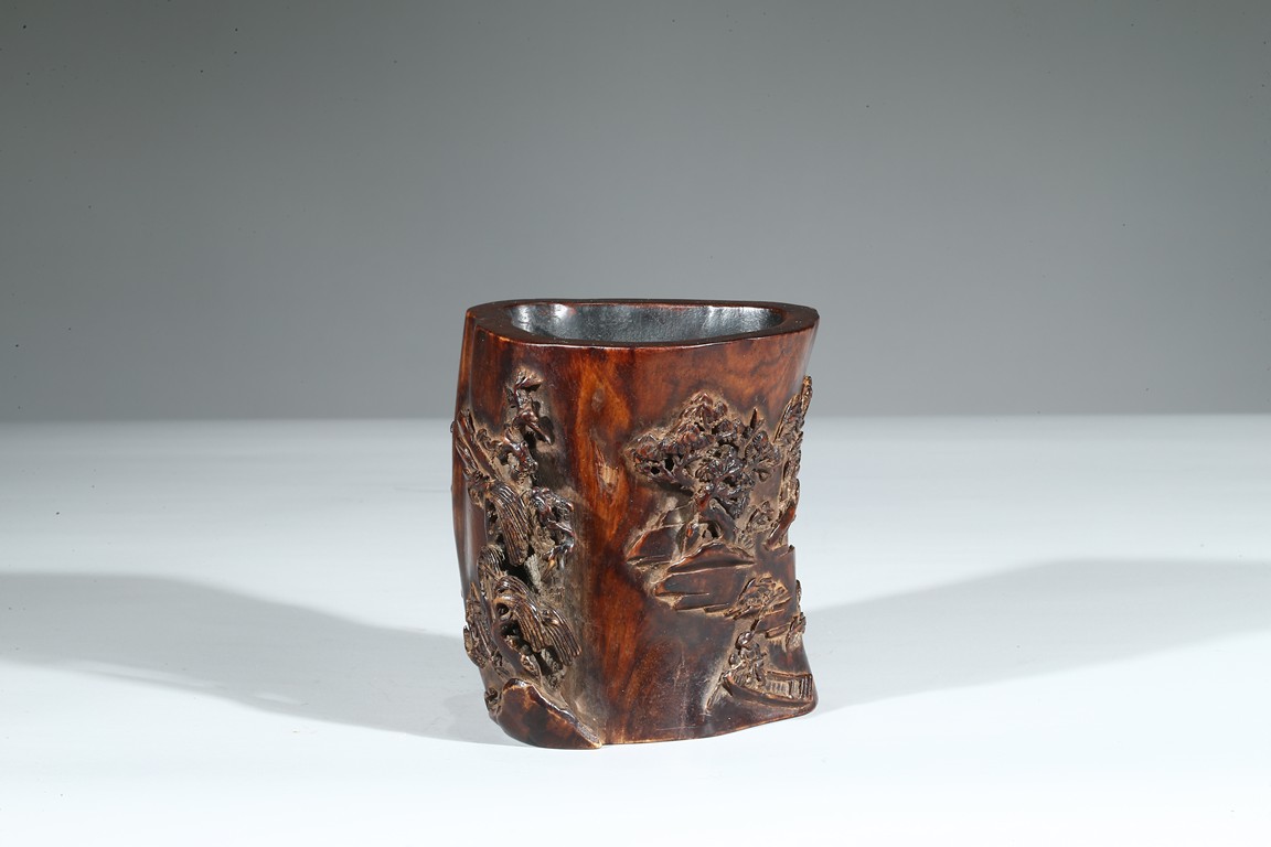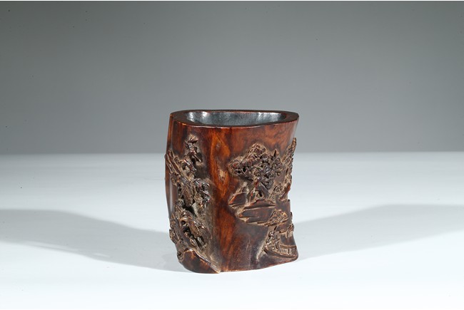 Carved to the exterior with riverscape scene. Qing Dynasty period.