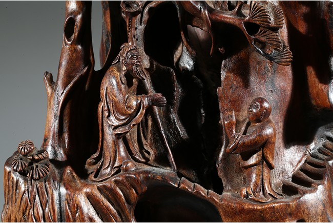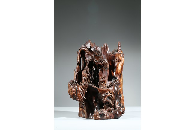 The brushpot carved and pierced in openwork and high relief to depict two figures on a mountain path along the cliff. Qing Dynasty period.