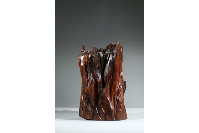 自明清以來眾多墨客崇尚自然,講究品味,齋頭清玩之器,多以黃花梨為上品,以展示自己的卓爾不凡;有的甚至親力親為,以製作上等選材的黃花梨筆筒為幸事,從而極大地推動了筆筒的製作與發展。本拍品“ 黃花梨鏤空浮雕山水人物大筆筒”34. 5cmX24. 5cm,筆筒包漿溫潤,所雕山水、松樹、人物及佛塔清晰自然,雕工精細,栩栩如生,黃花梨用料大方,歷經時間洗禮而有了歲月滄桑感,蘊含了花梨。文化的特有品質,備受藏家追捧,值得收藏。來源: 聖地亞哥著名藏家陳昌師先生提供