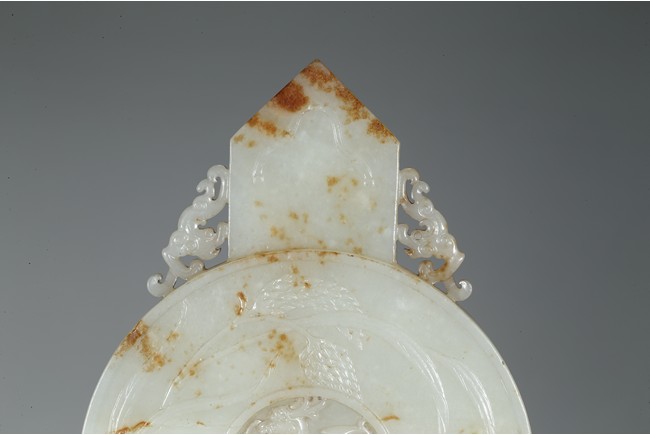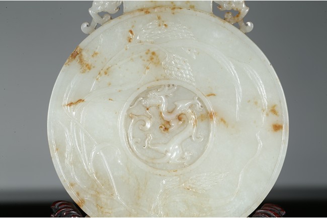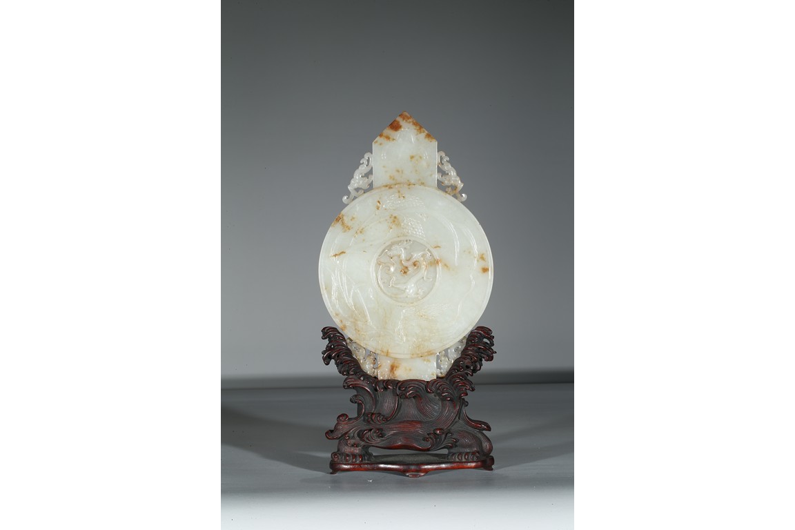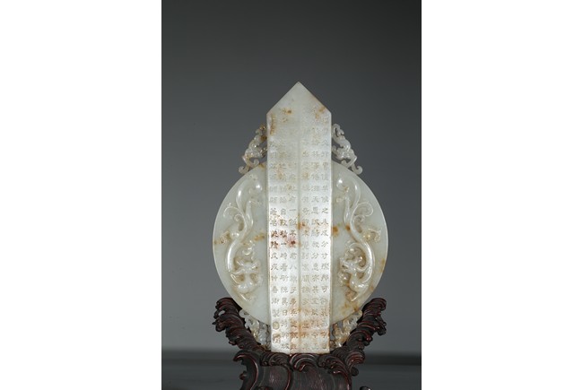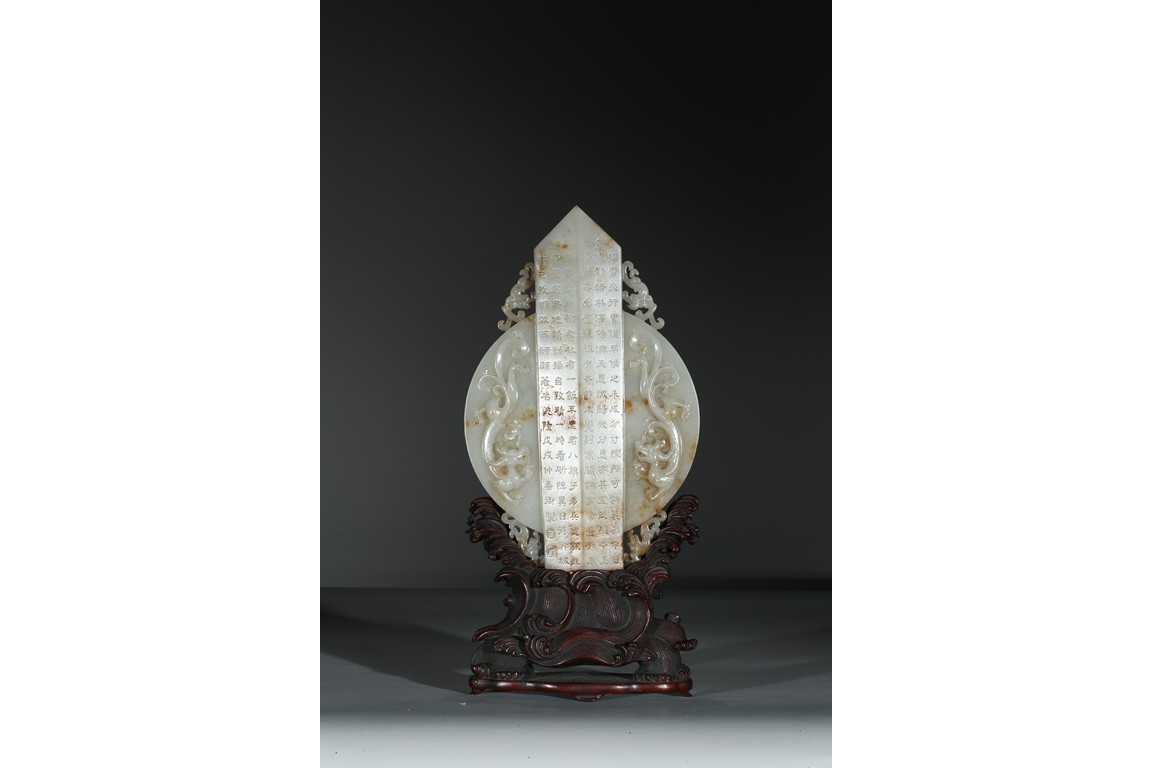 Carved in the form of a gui scepter combined with a bi disc, with inscribed inscription to the tablet flanked by two sinuous dragons, all supported on hardwood stand. Qing Dynasty period.