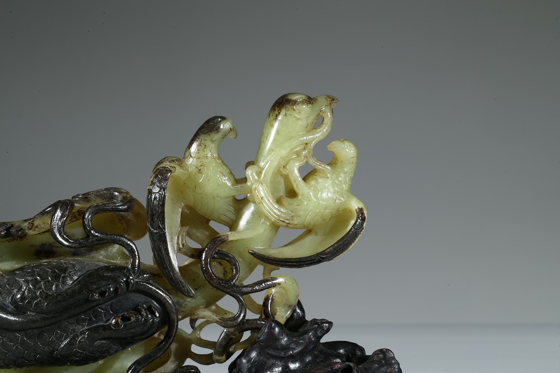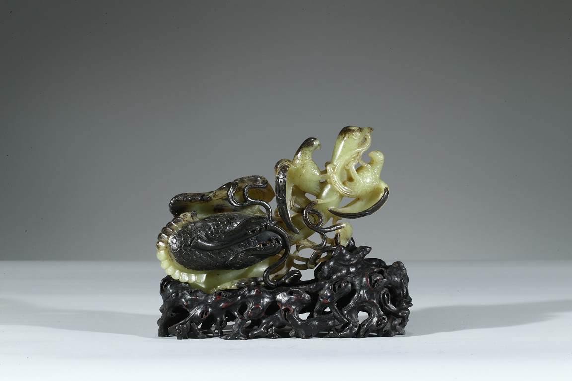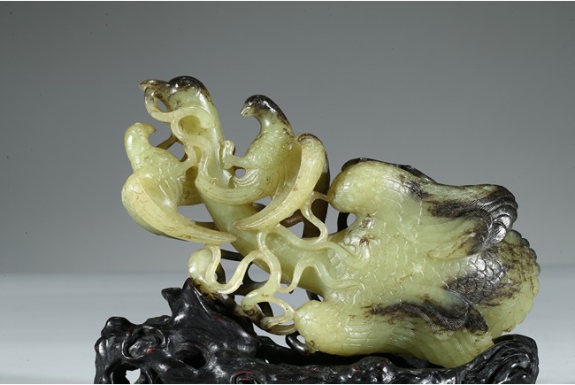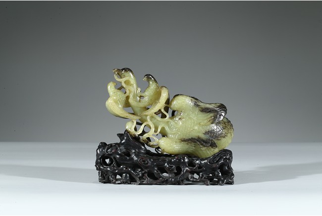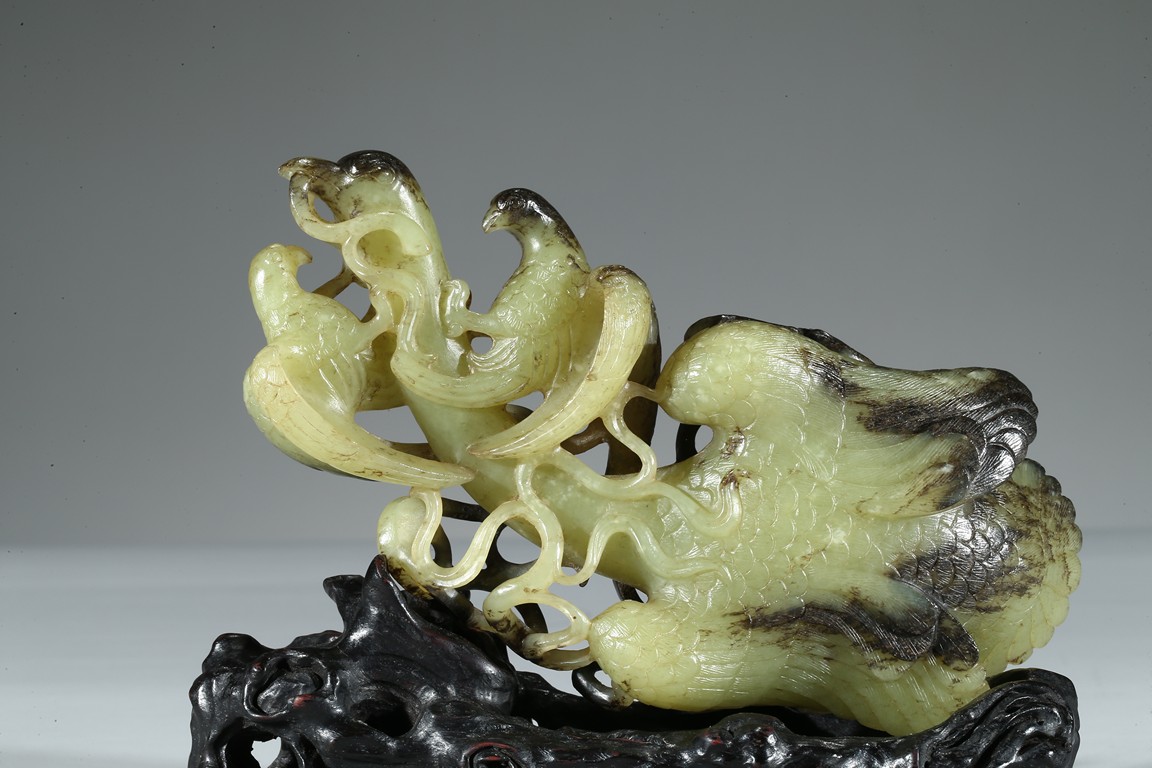 The carving depicts a large phoenix with two small birds, the stone is of mottled celadon and black tone. Wood stand. Qing Dynasty period.