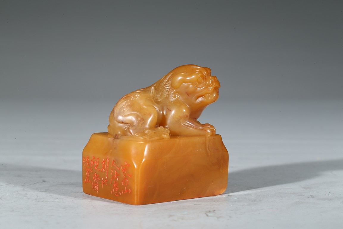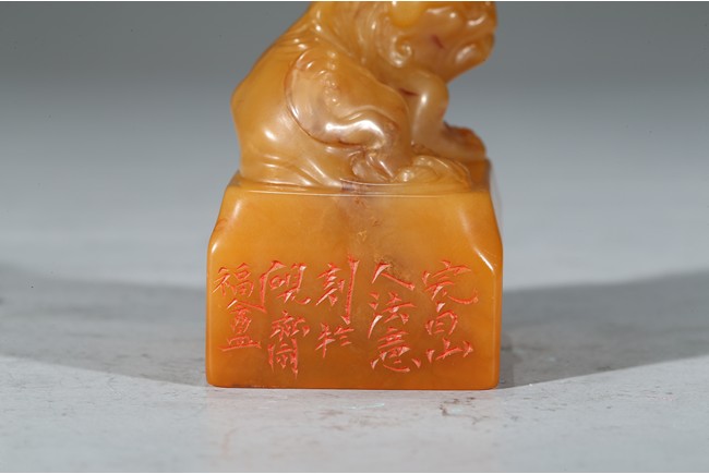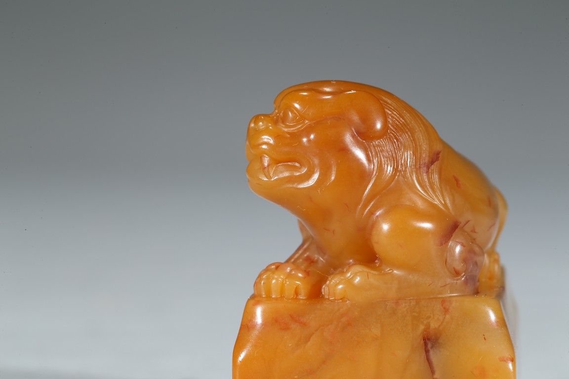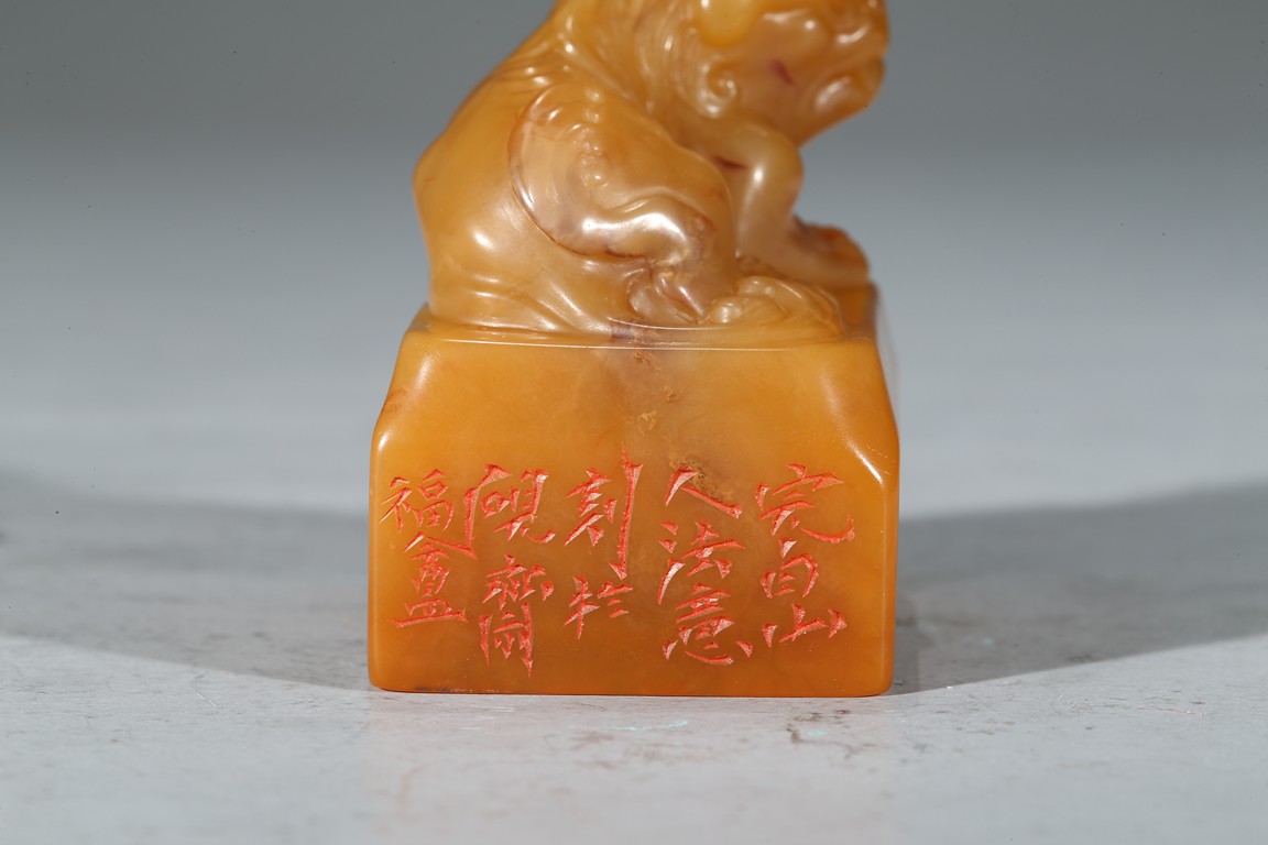 Of rectangular section, the top carved in high relief with a recumbent buddhist lion, the seal side carved with calligraphic inscriptions. Qing Dynasty period.