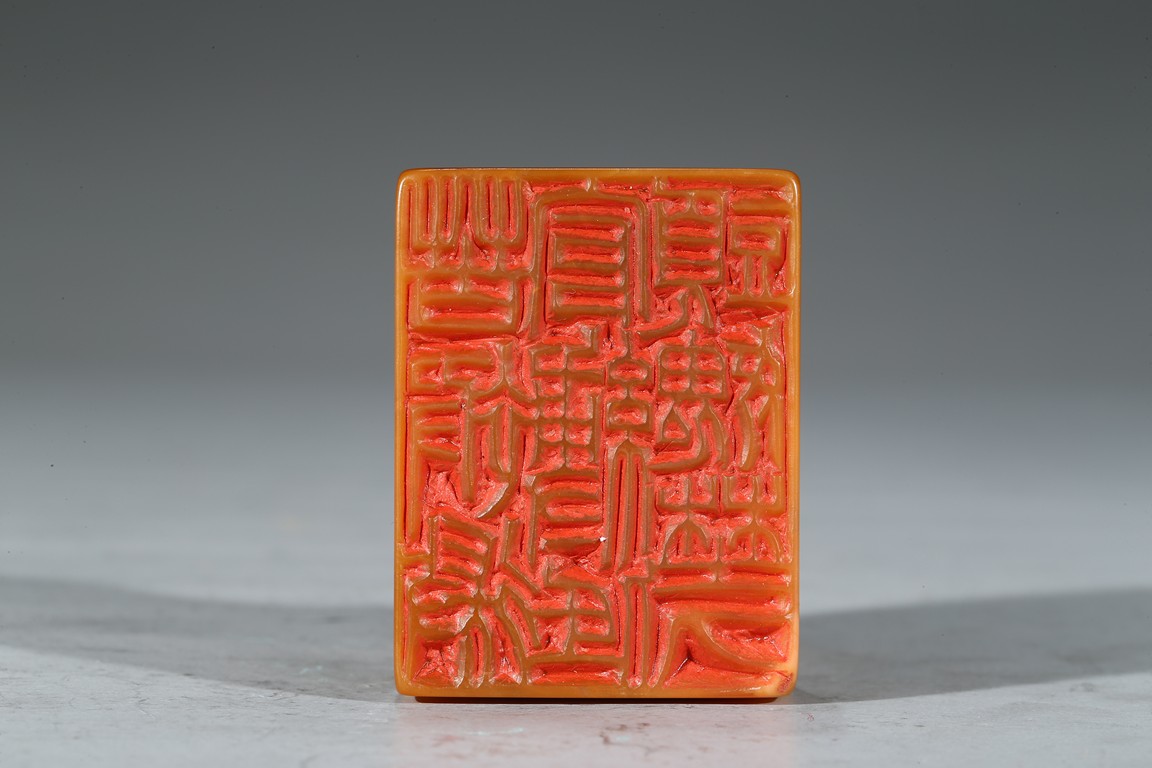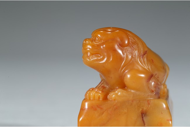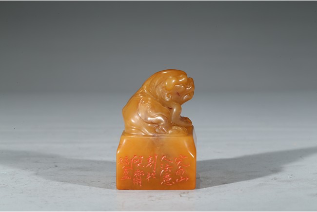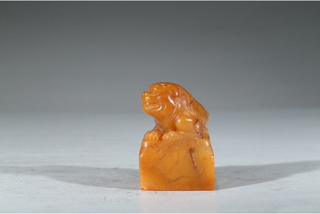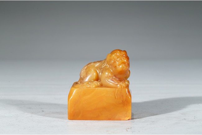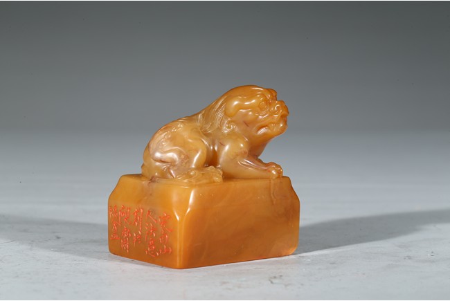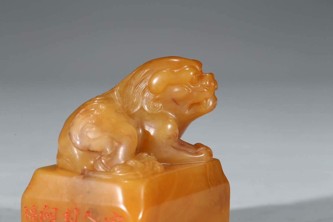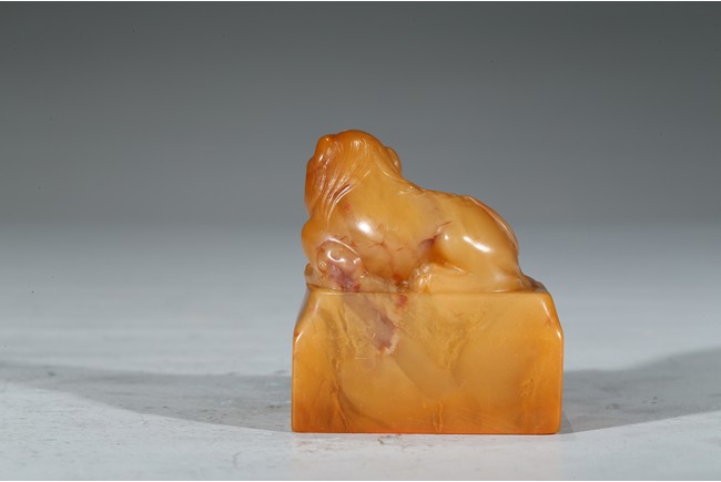"邊款:完白山人法意刻於硯齋福痷。印文:共被微官縛低頭愧野人。王福庵,原名壽祺更名褆,字維季,號福庵,以號行,70 歲後自號持默老人。浙江仁和(杭州)人。近代篆書大家,隸書也寫得不錯。精篆刻,是西泠印社創始人之一。田黃石乃"石中之帝",十分少見,而黃金黃田黃石更是稀罕珍貴。此件雄獅印章毫不吝材,以求造型之美態,實令人嘆為觀止。其色澤金黃,表面一層古樸的包漿,內裡蘿蔔絲紋隱現,石質緊密密通靈,溫潤細膩,如脂似玉,又比美玉顯得更加"粘人",質感絕佳。來源: 聖地亞哥著名藏家陳昌師先生提供"