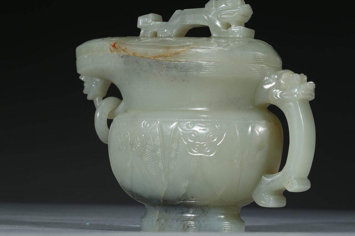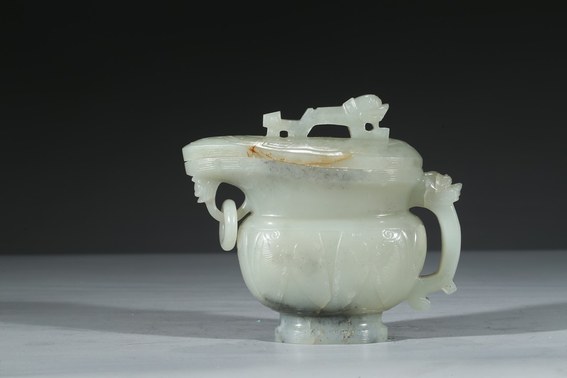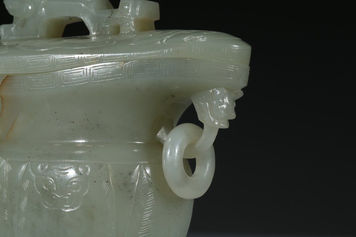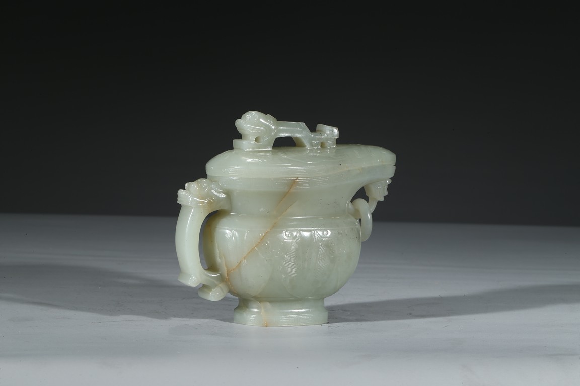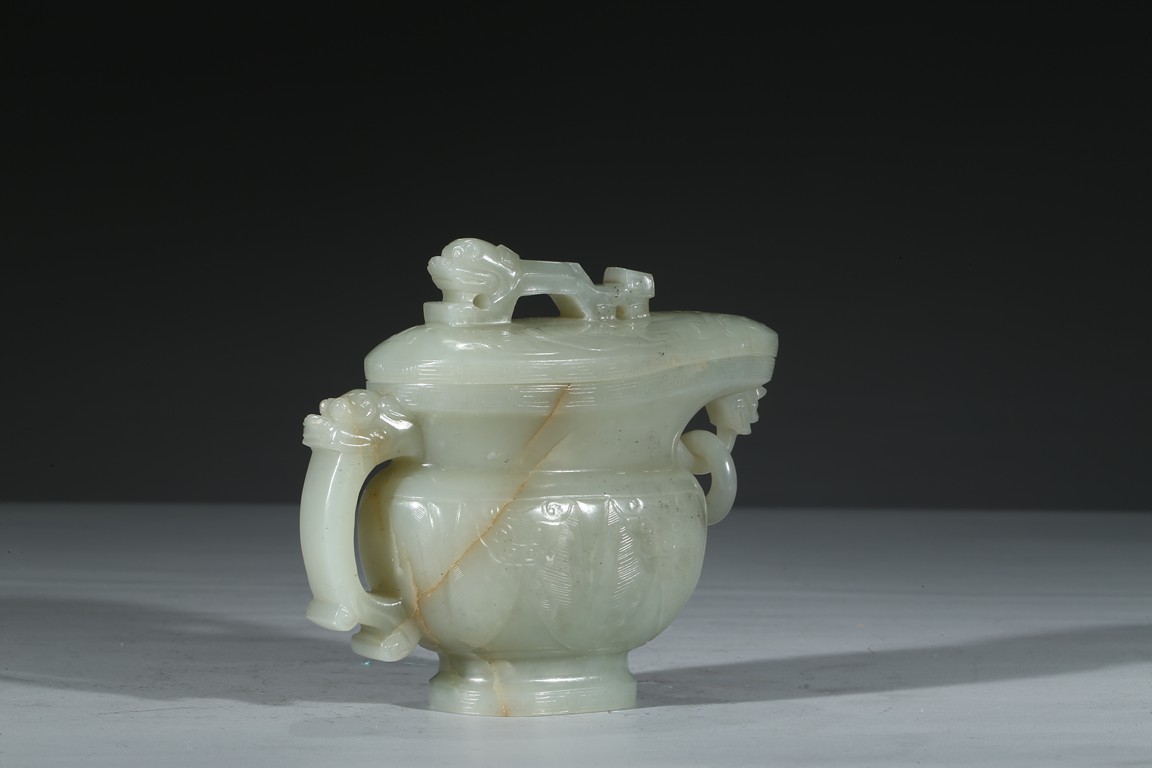Modelled in the form of archaistic wine vessel Guang, the body decorated with a band of lappets and mythical beast heads, fitted with a cover topped with an arched mythical animal. Qing Dynasty Period.