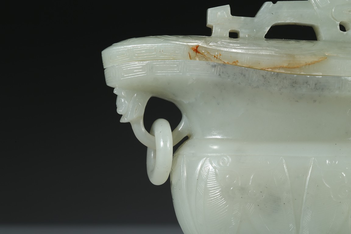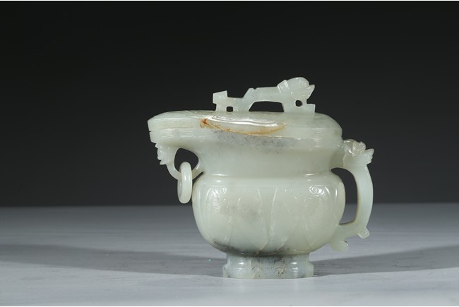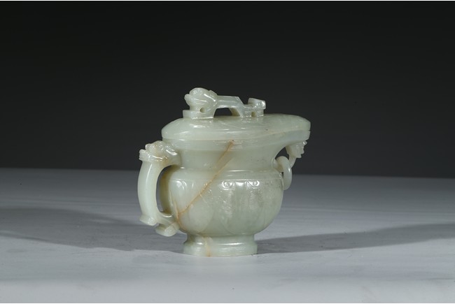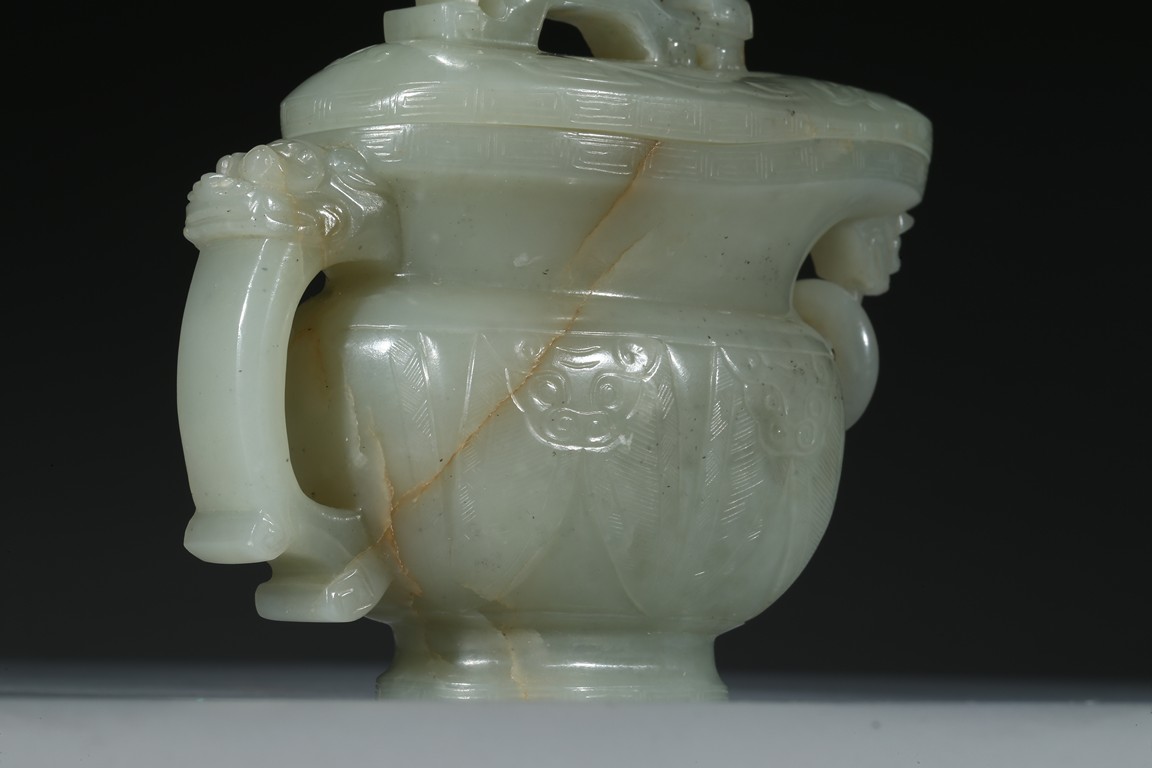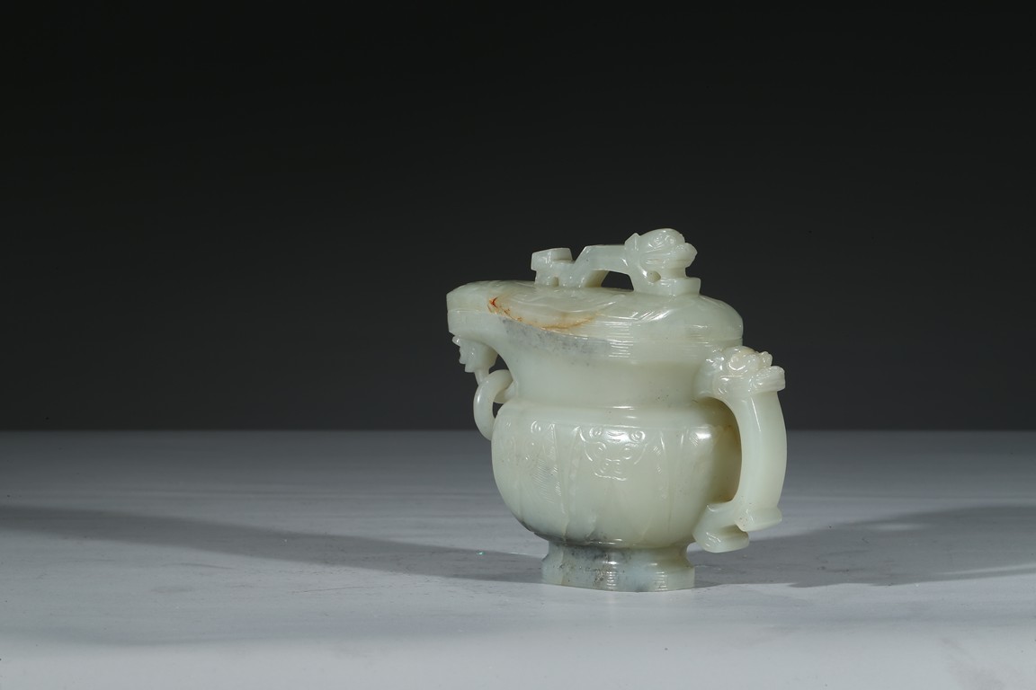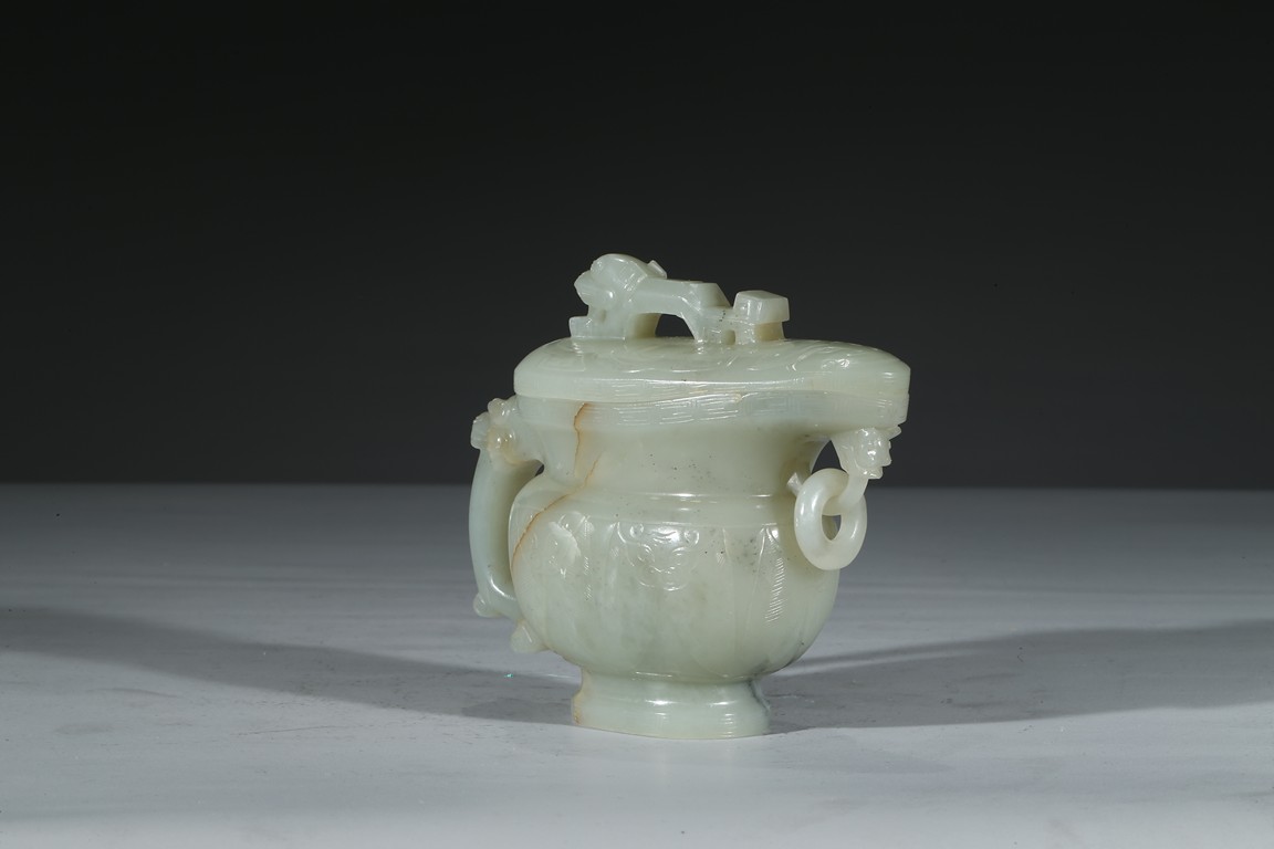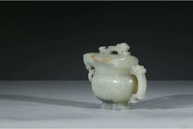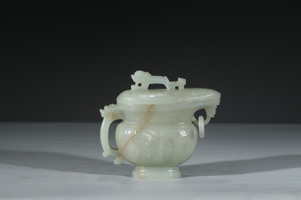 Modelled in the form of archaistic wine vessel Guang, the body decorated with a band of lappets and mythical beast heads, fitted with a cover topped with an arched mythical animal. Qing Dynasty Period.