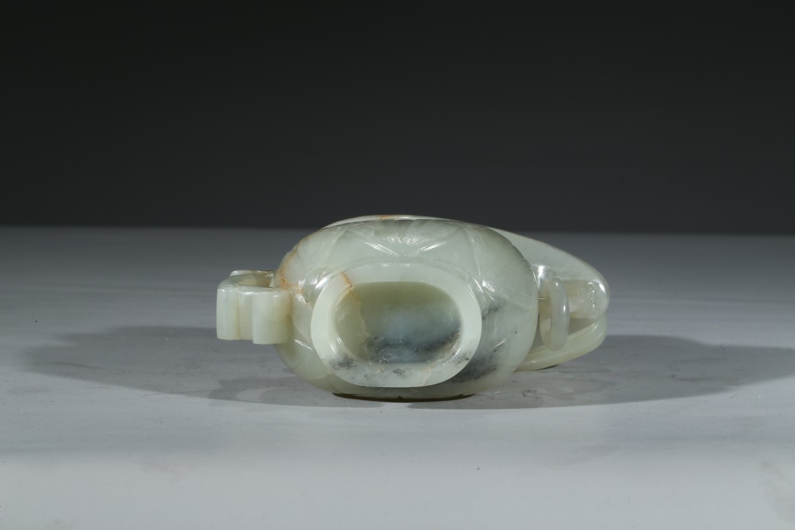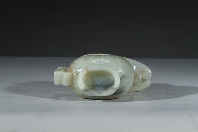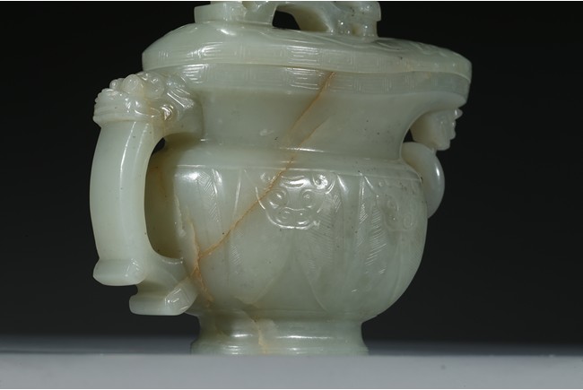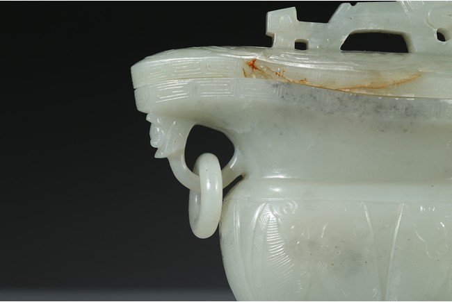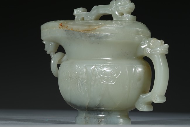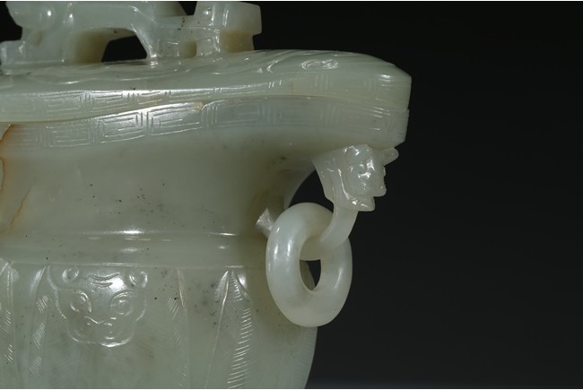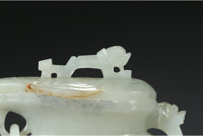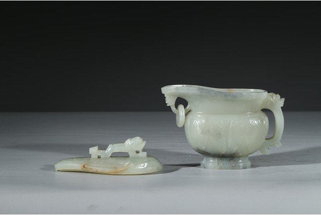 玉質溫潤,器形及紋飾皆仿商周之際青銅器,古樸華美,蘊含裝飾趣味,是明清仿古玉的一個重要器形。玉觥略呈長方形,寬流,蓋面做有角的獸頭狀,口沿及圈足均陰線刻雲雷紋一周,器身下腹部淺浮雕螭龍紋帶飾。其一側鏤雕夔龍為柄。蓋面圓雕一螭虎趴伏其上,目視前方,長尾後卷,鬢毛鬚髮均細細刻琢。構思巧妙,雕工精細。參閱《故宮博物院藏文物珍品全集玉器下》139 玉獸面紋觥 來源: 聖地亞哥著名藏家陳昌師先生提供