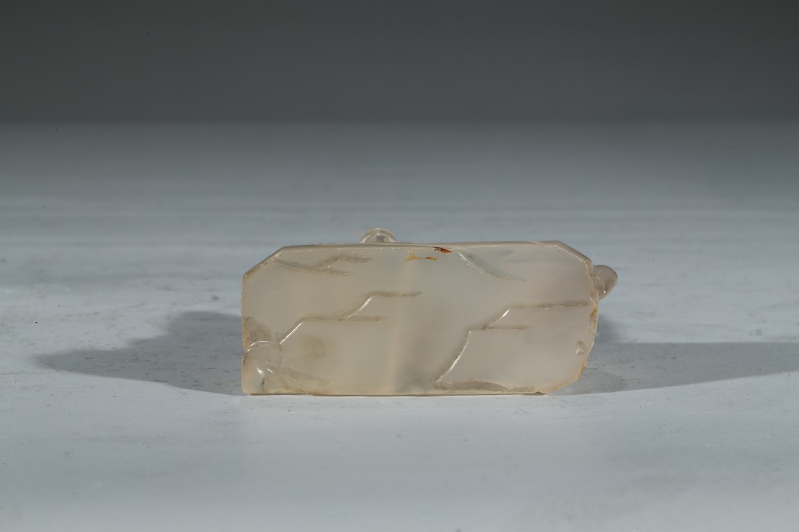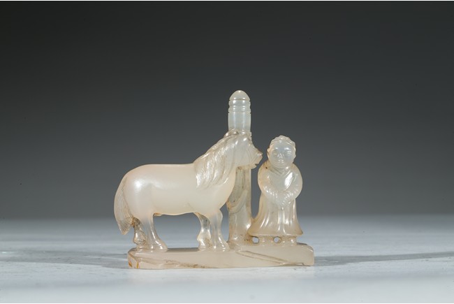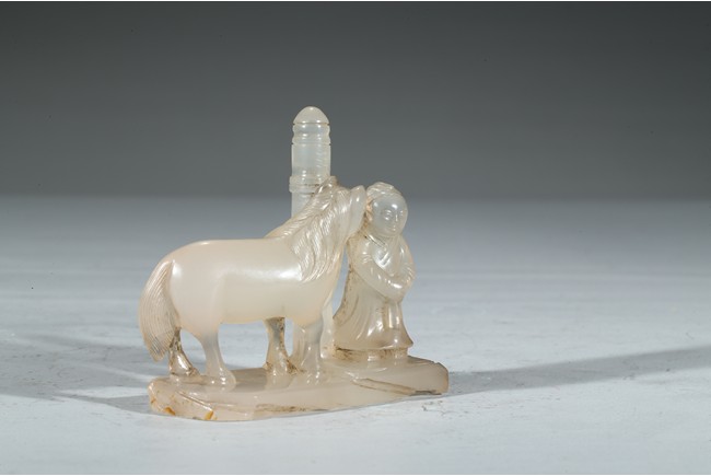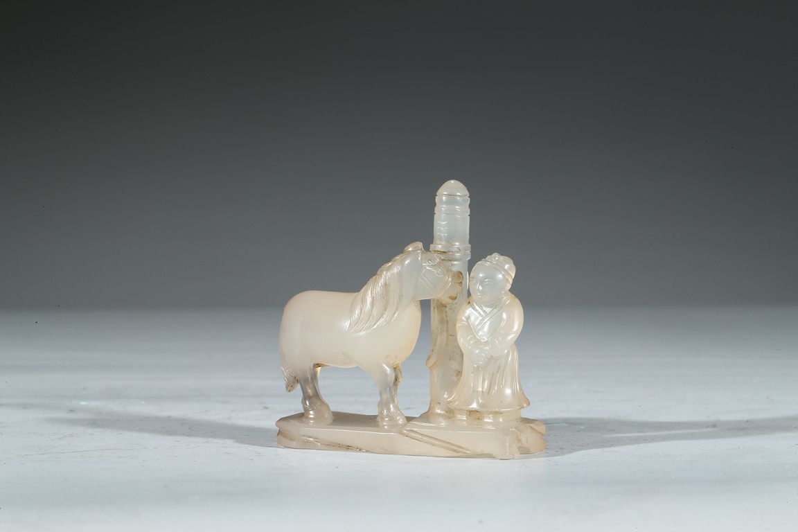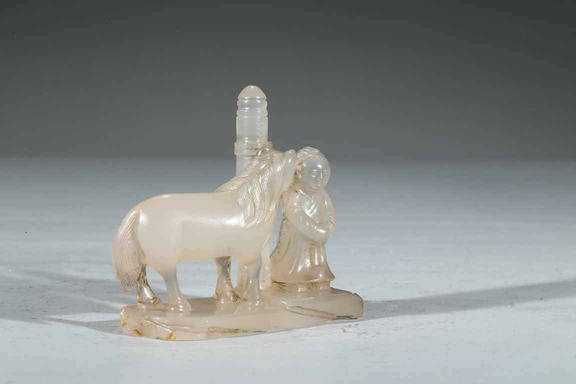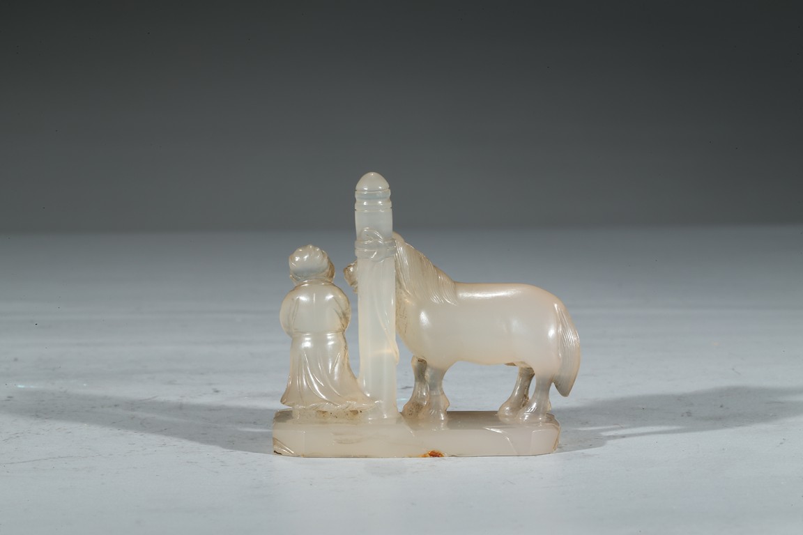 此件器物為冰糖瑪瑙雕製而成,材質細膩、溫潤,晶瑩剔透。圓雕童子浴馬圖,童子麵容慈祥可愛,衣紋飄逸自然。栓一匹駿馬,身形矯健,腹部滾圓,鬃發飛揚。底部也刻畫精細,是一件特殊的器物。 (參閱佳士得拍品) 來源: 聖地亞哥著名藏家陳昌師先生提供