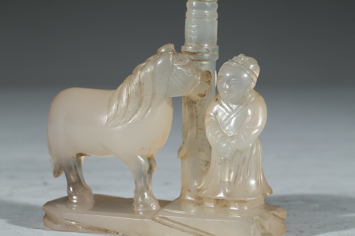 Carved in the form of a figure and a horse tied to a post. Qing Dynasty period.