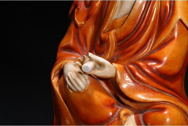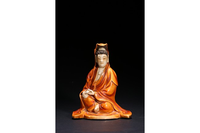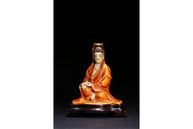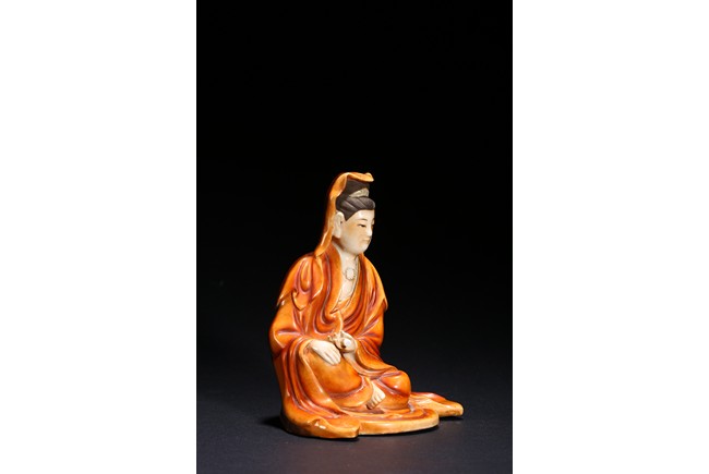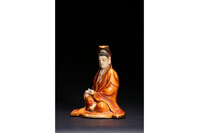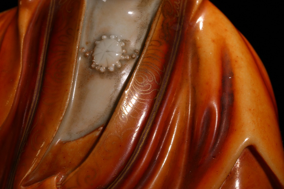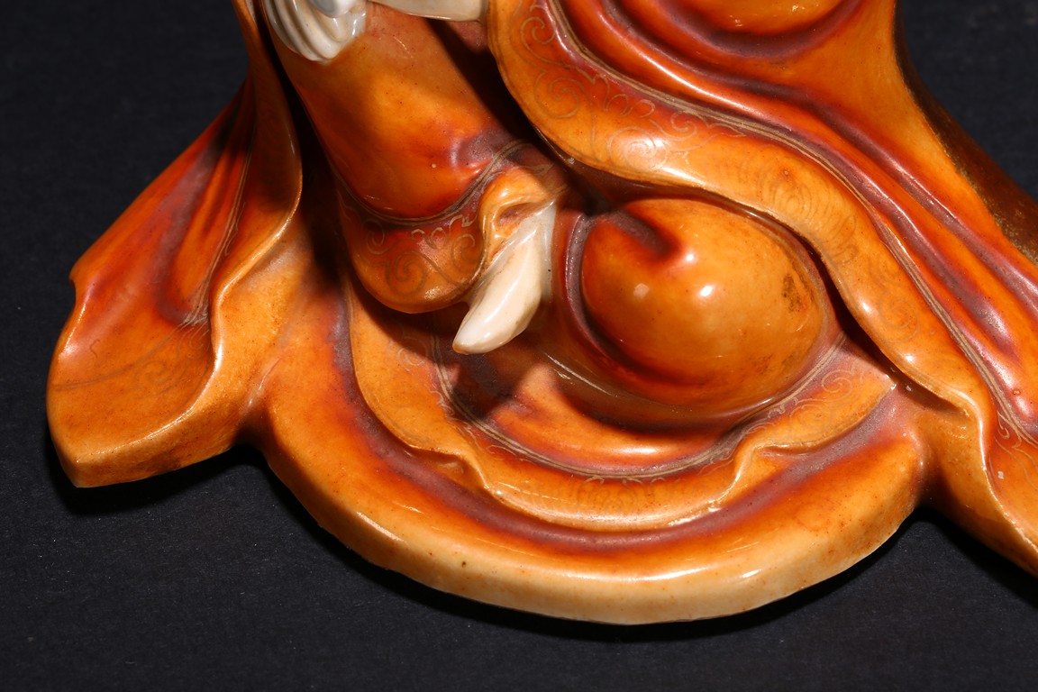 Portrayed seated lalitasana, holding a scroll in one hand, covered in orange red glaze. Qing Dynasty period.