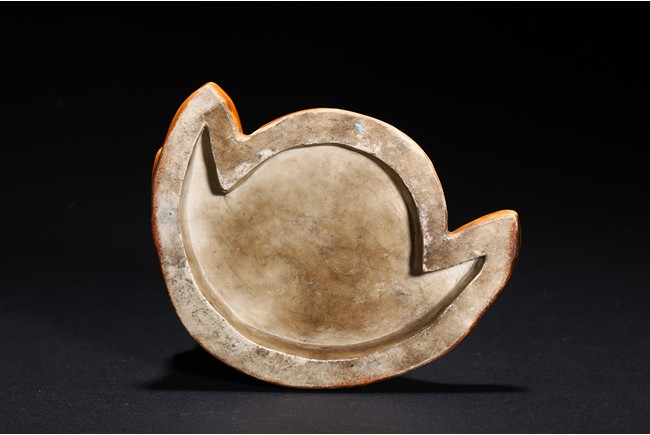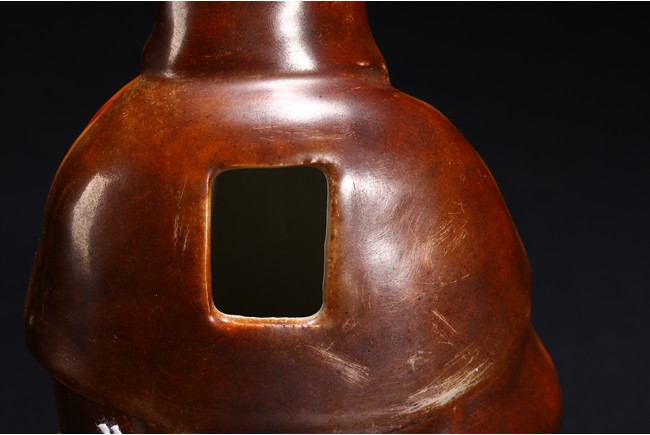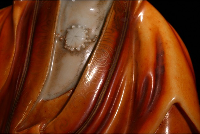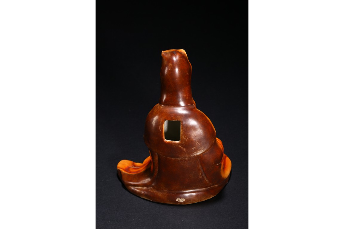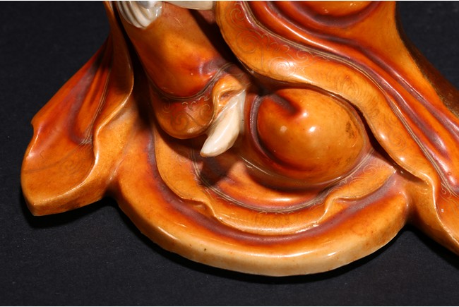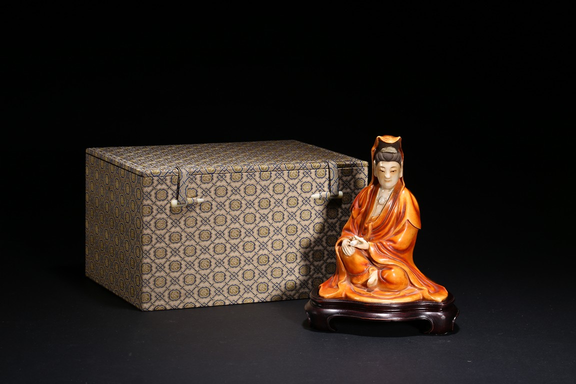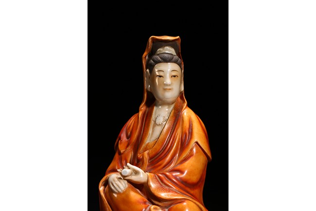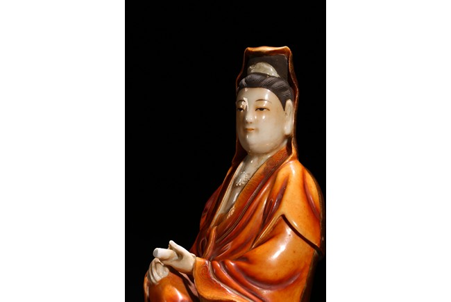 Portrayed seated lalitasana, holding a scroll in one hand, covered in orange red glaze. Qing Dynasty period.