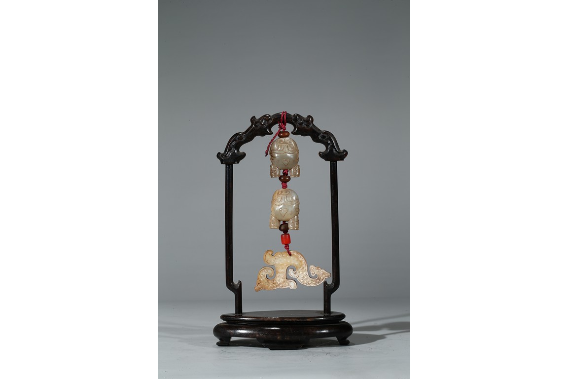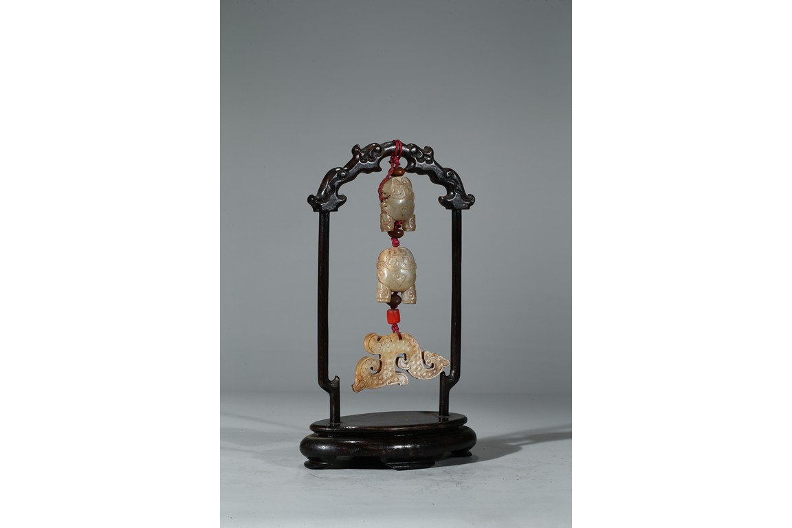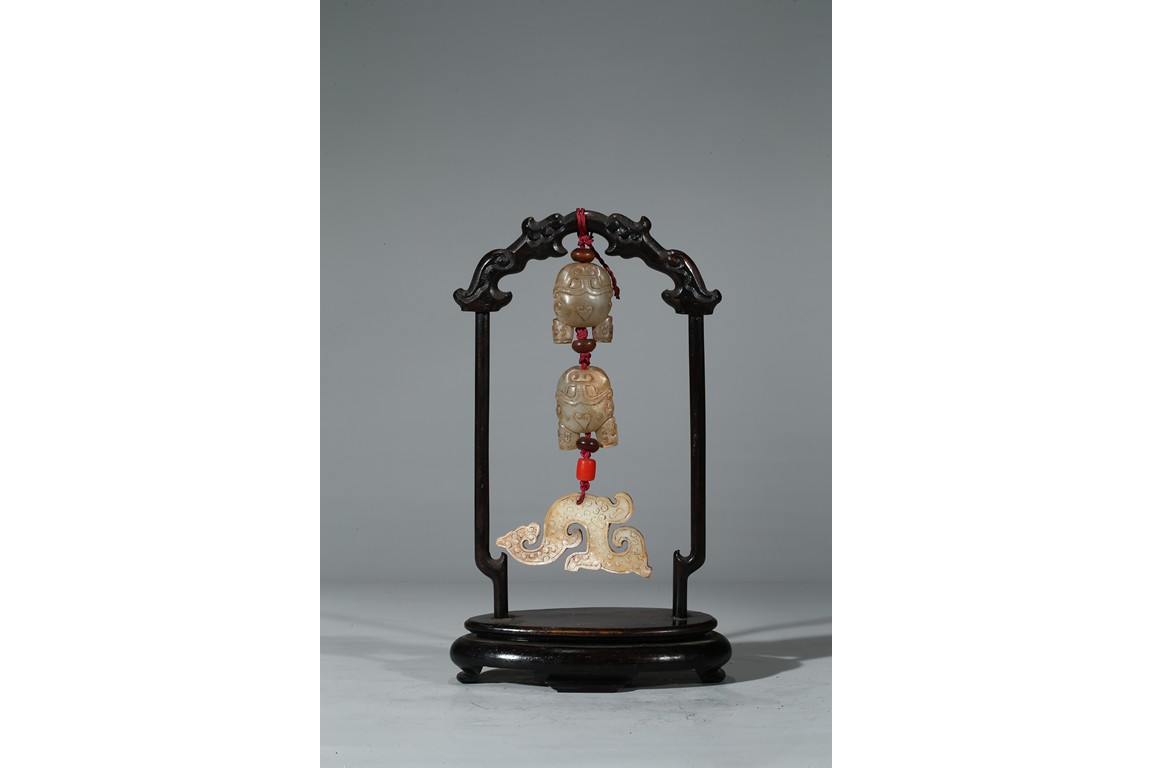The set including a coiled dragon shaped pendant and two jade carvings, tied together and hanging on a carved wood frame as table display. Han Dynasty period.