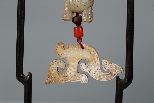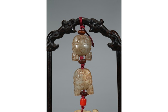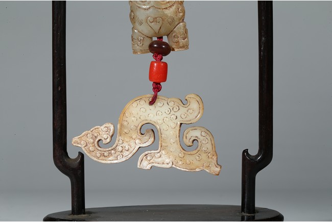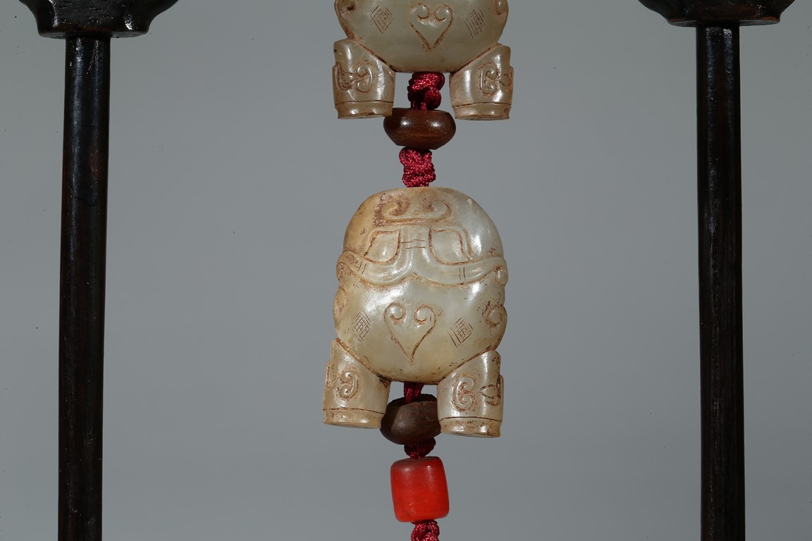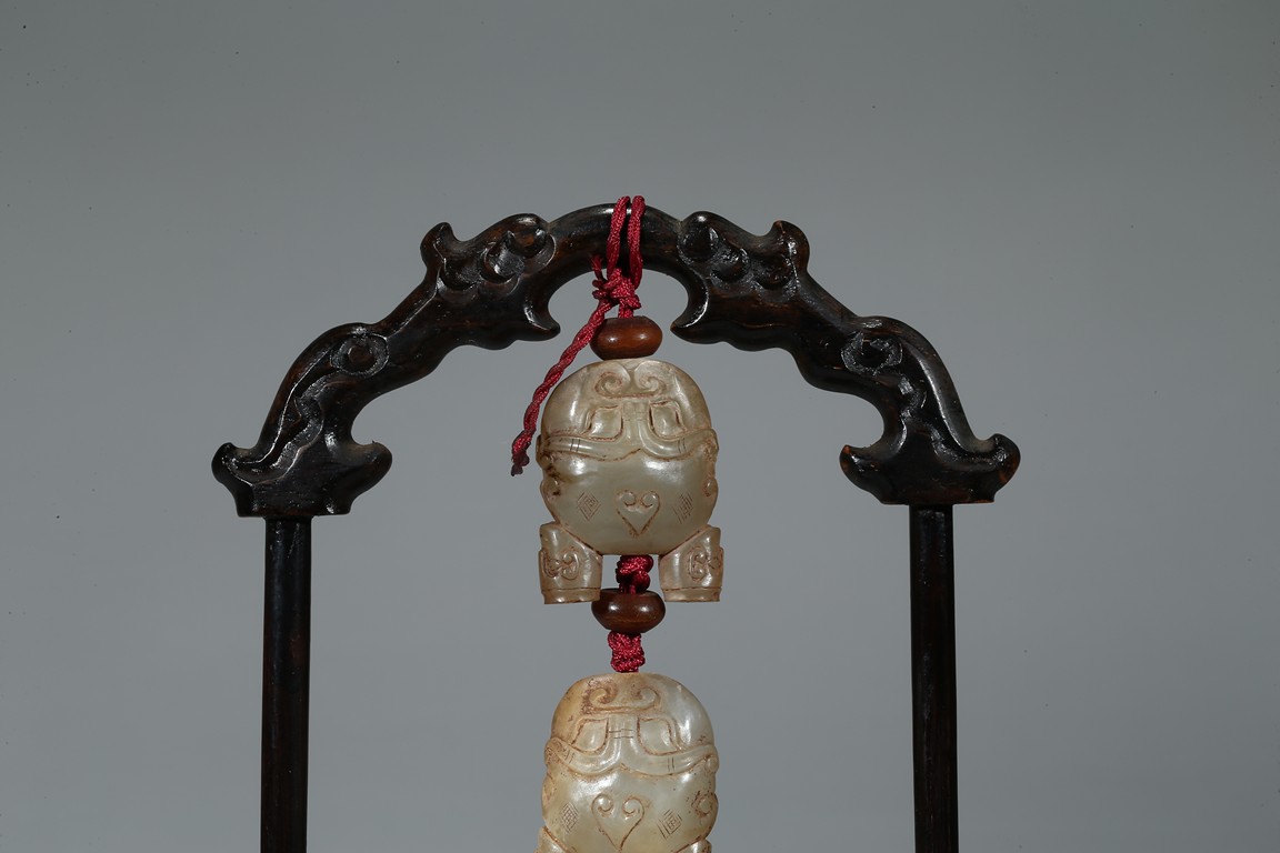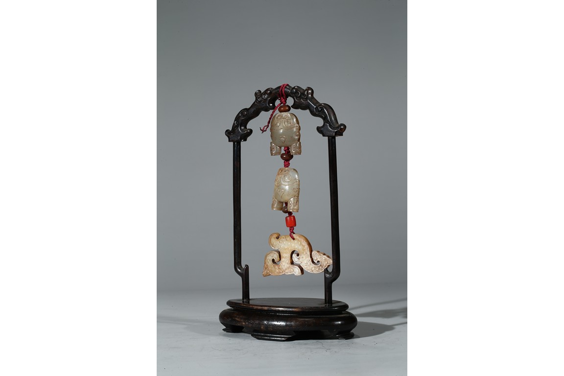 The set including a coiled dragon shaped pendant and two jade carvings, tied together and hanging on a carved wood frame as table display. Han Dynasty period.