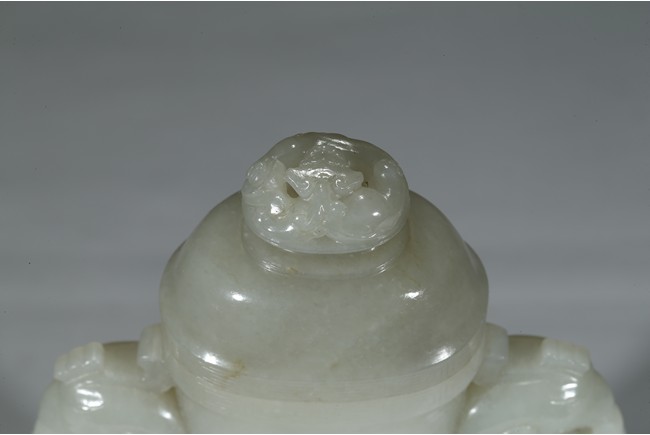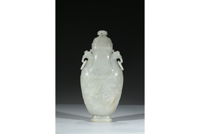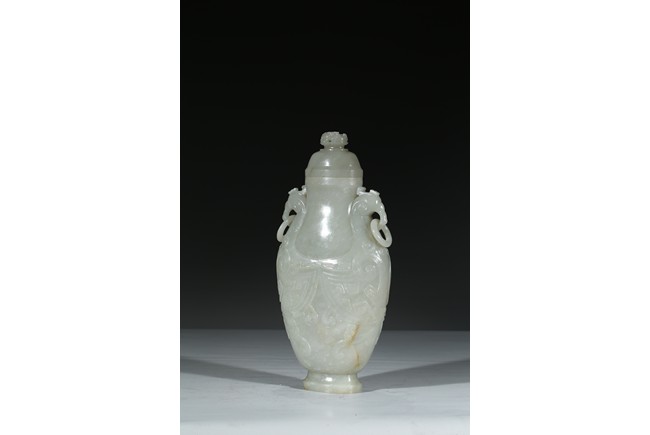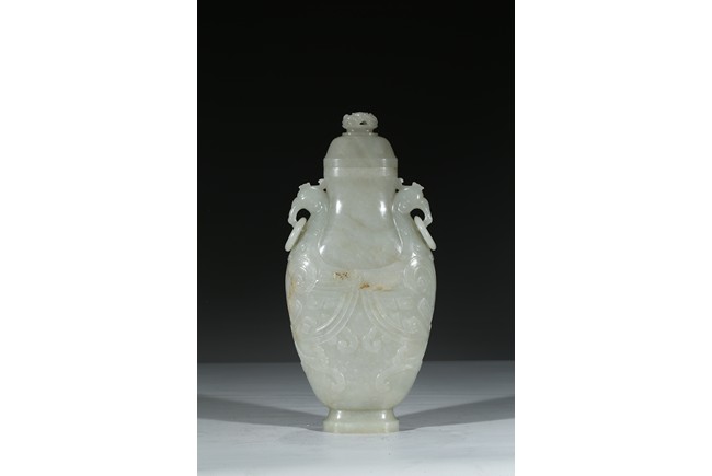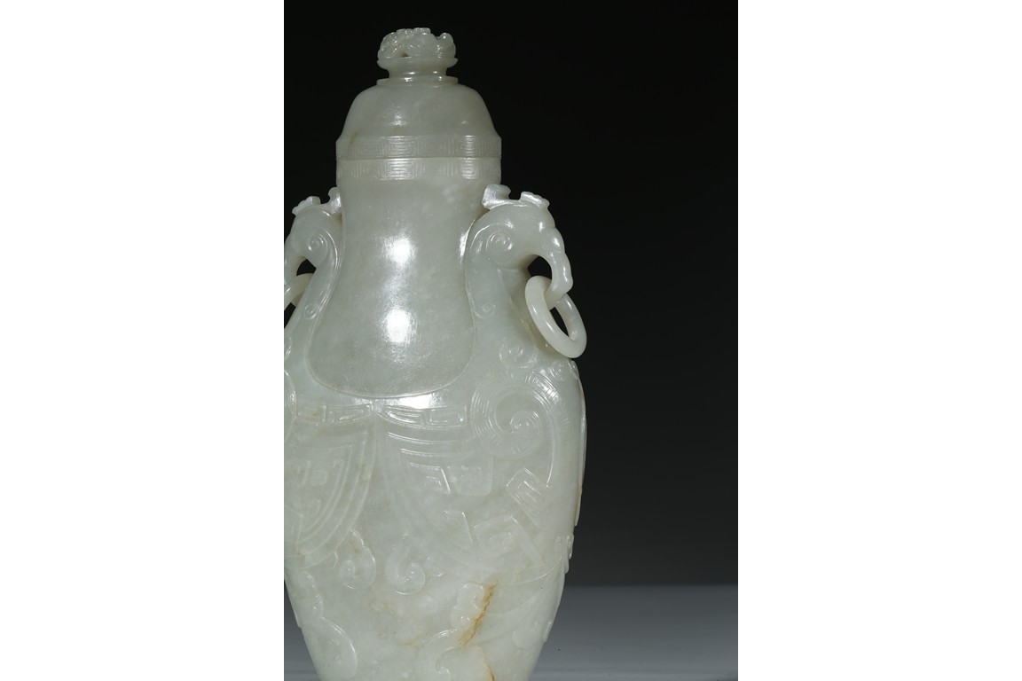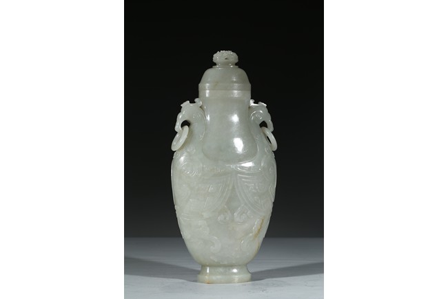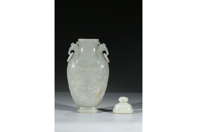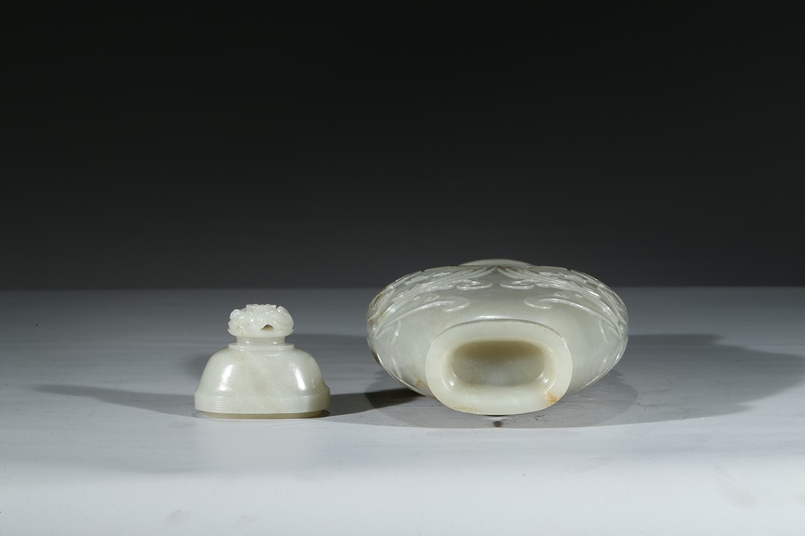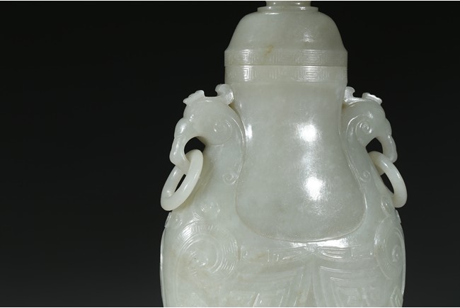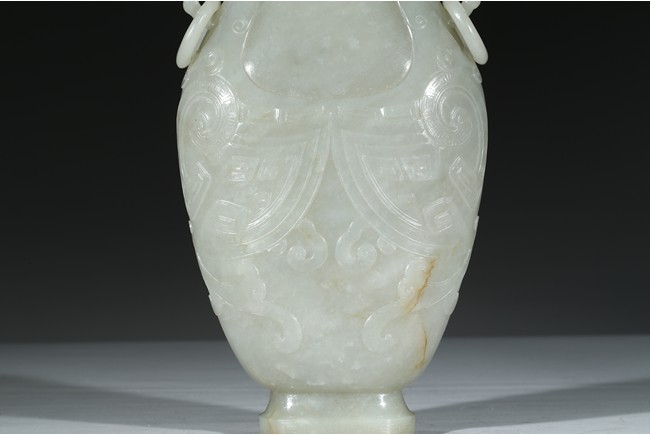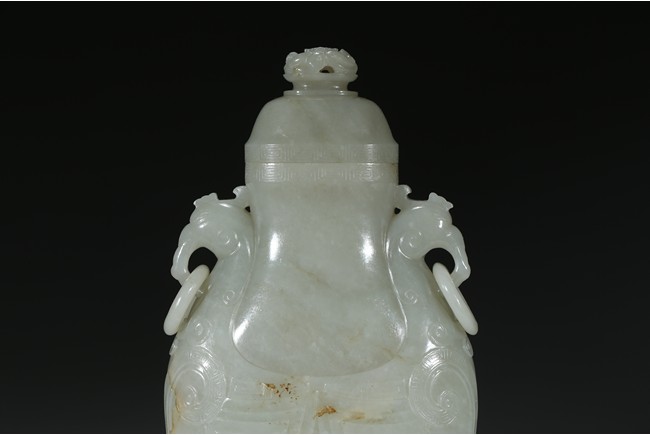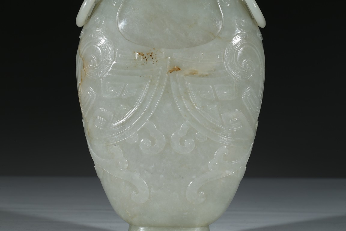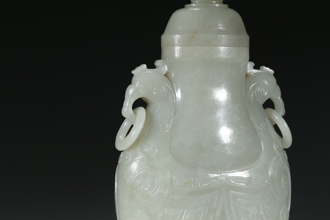 整體呈扁圓形,長頸,兩側飾對稱銜環鳳耳,鼓腹,二層台式圈足。蓋頂橢圓狀,浮雕雙鳳紋。蓋鈕扁環形,飾螭龍紋。蓋與瓶口沿裝飾一周迴紋。此瓶為陳設用器,優雅端莊,皇家氣韻十足。玉質純淨,形製規整,素雅秀美。參閱香港 Bonhams 邦瀚斯拍賣行2012 年秋季拍賣會0232 號拍品,成交價:HKD 1340000