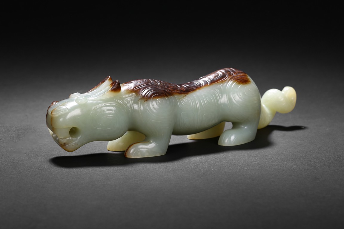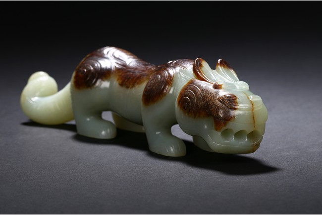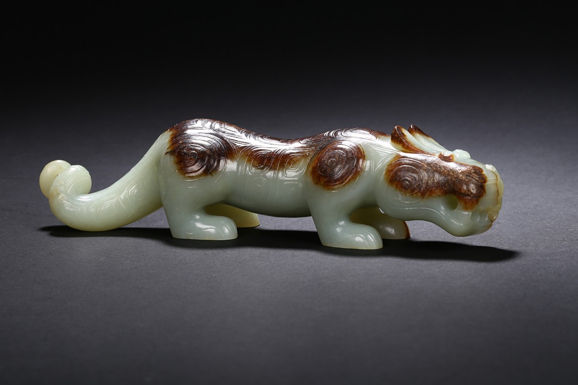Carved standing tiger with square broad head with protruding rounded eyes, powerful nose, alert ears and sharp fangs, its long tail scrolled to form a small hole, the body carved with leiwen or spiral pattern, the stone of pale celadon tone with large patches of brownish and russet inclusion. Qing Dynasty period.