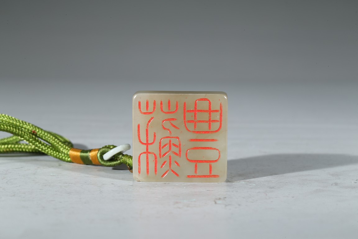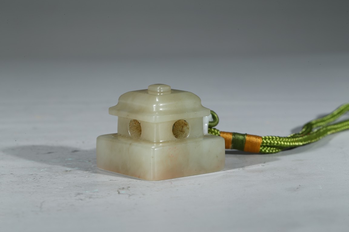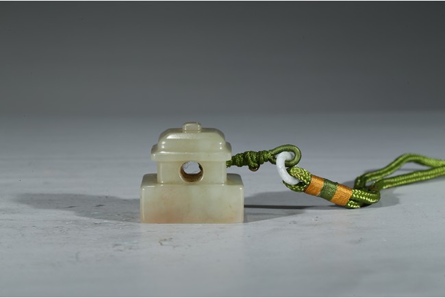青白玉雕製而成,玉質溫潤,包漿渾厚,印紐作塔形狀,橫穿孔。印文:蘇豐(蘇豐)。