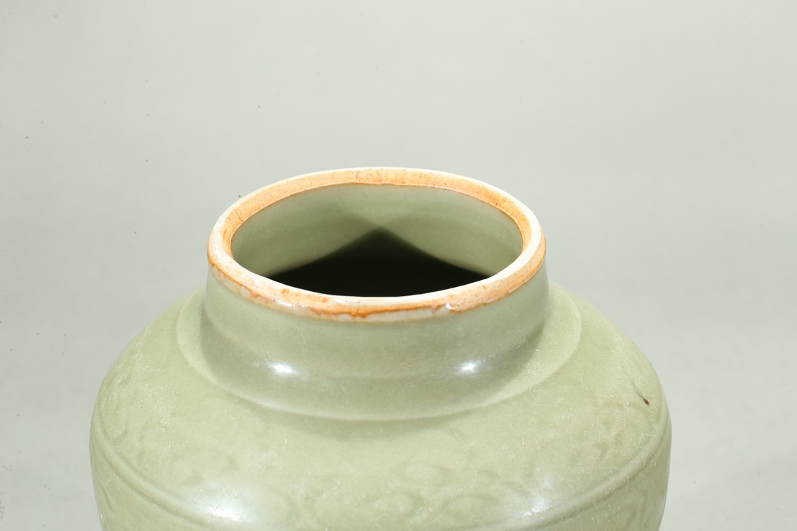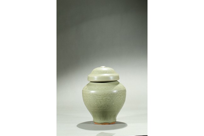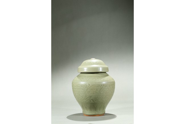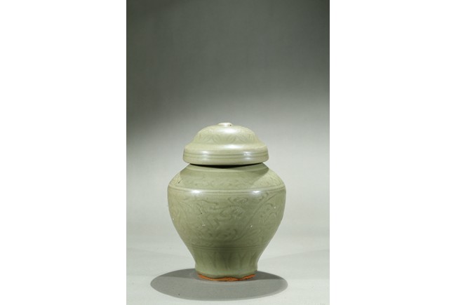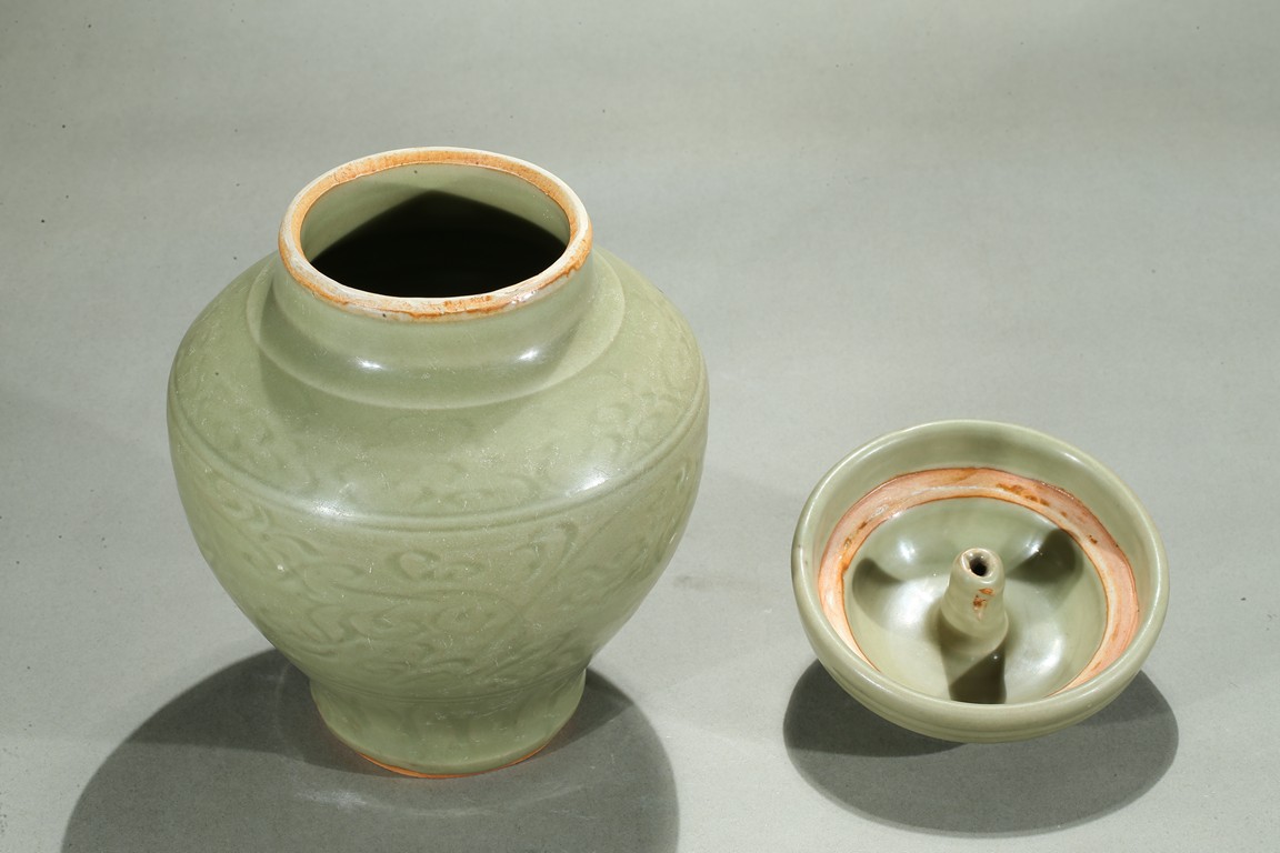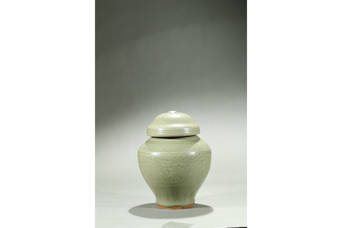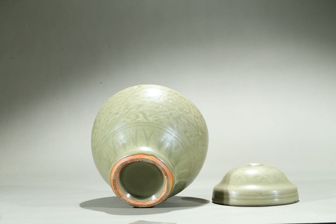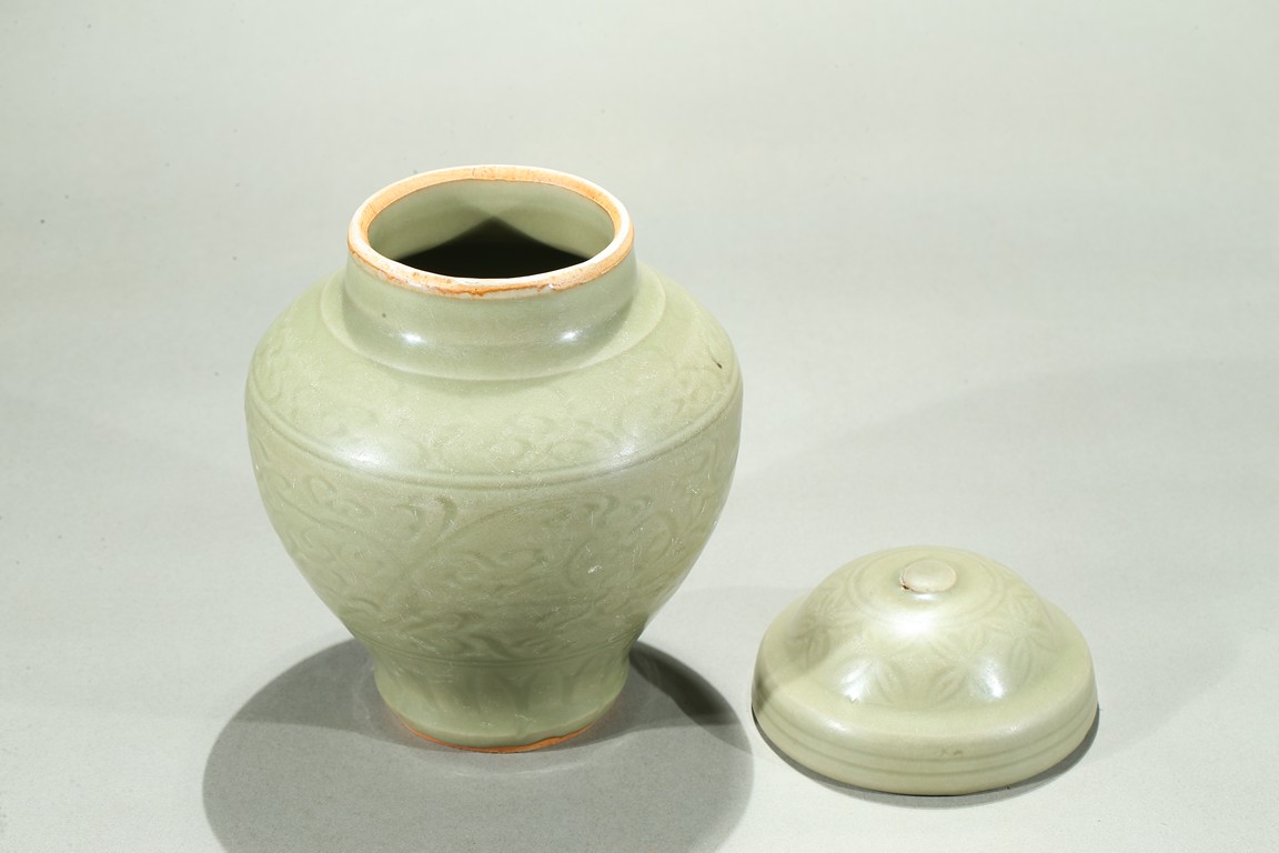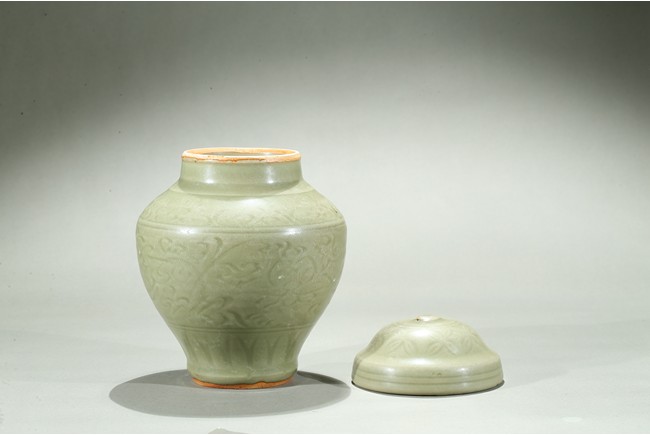 The jar is potted with ovoid tapering body carved with floral scrolls pattern, rising from countersunk base to broad shoulders, fitted with a domed stepped cover, overall covered in olive green glaze. Ming Dynasty period.