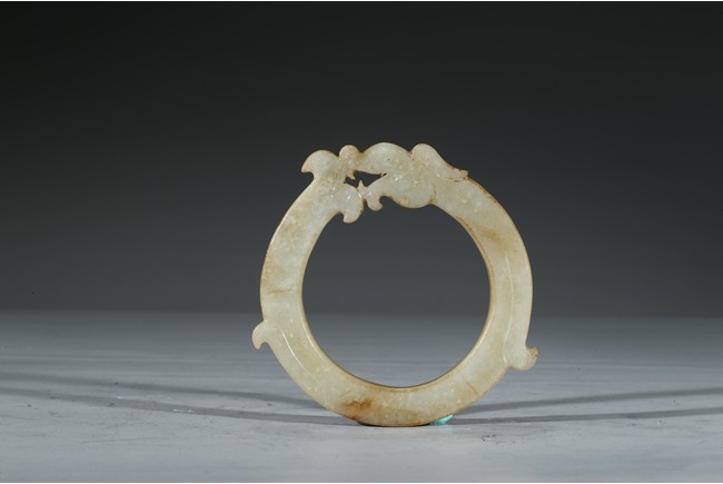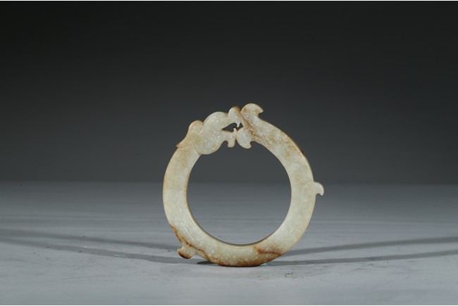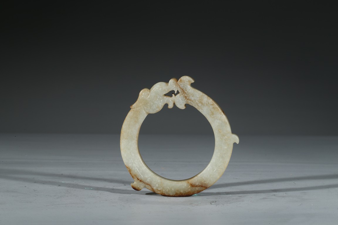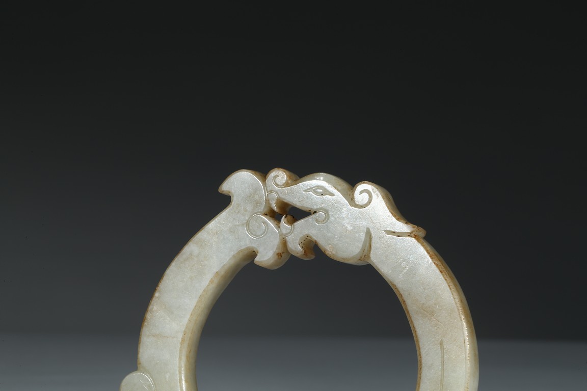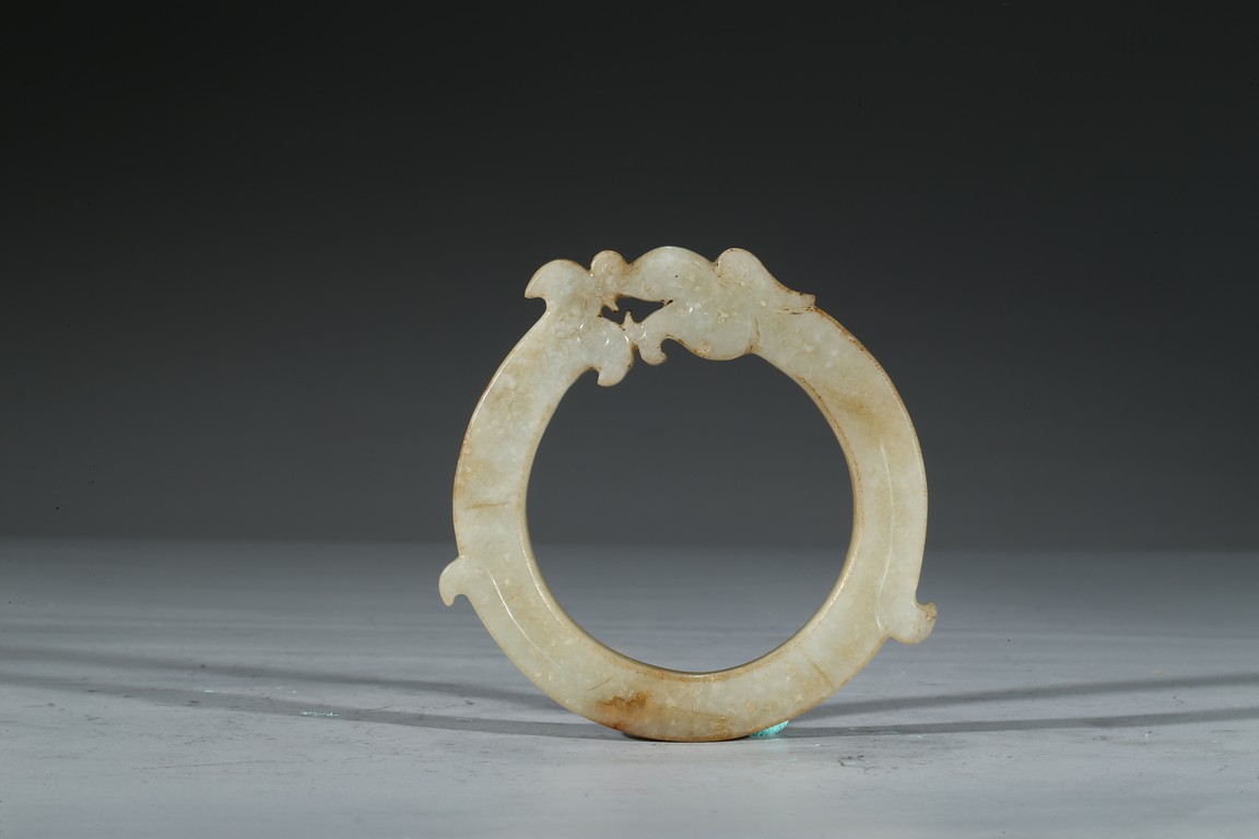 Carved with a coiled dragon with its head against the tail forming a closed circle. Han Dynasty period.