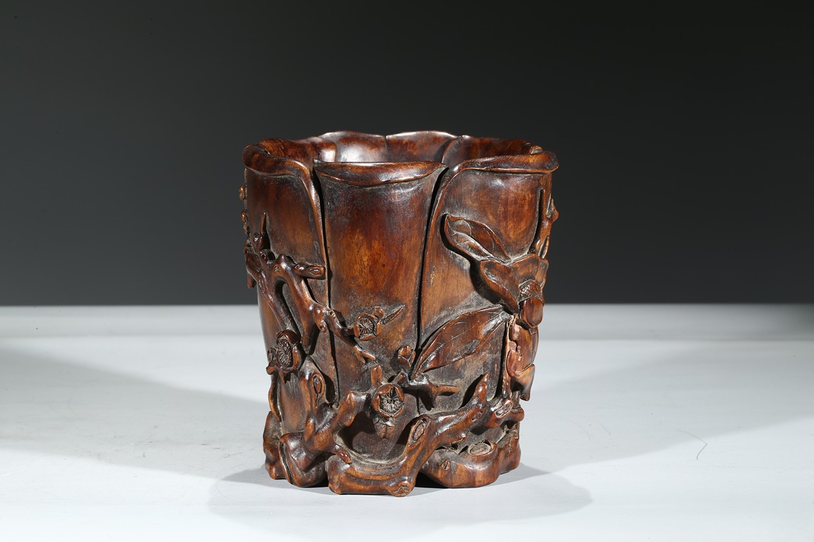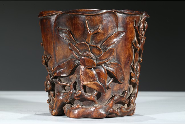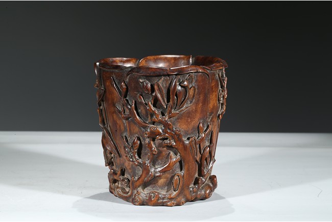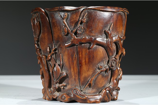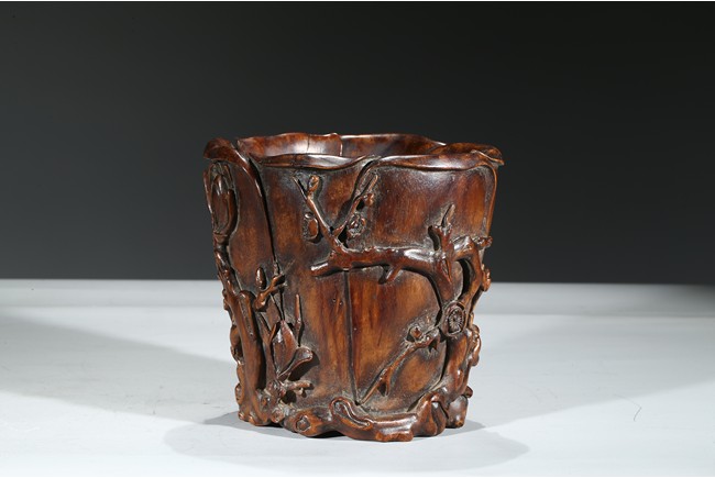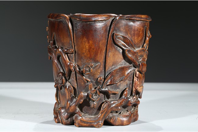 The brushpot carved around the body with various flowers and plum blossom branches. Qing Dynasty period.