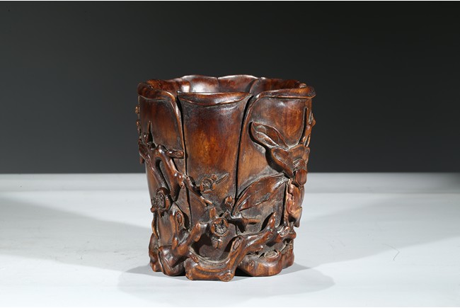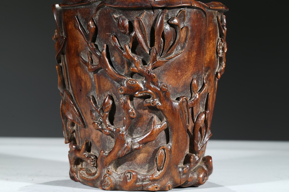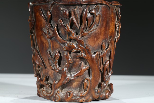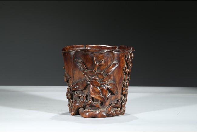 此拍品“黃花梨雕花卉筆筒”14cmX15.2cm,雕工精美,用料講究,端莊大方,包漿溫潤。可參考紐約蘇富比、佳士得2008-2010的黃花梨筆筒拍賣。