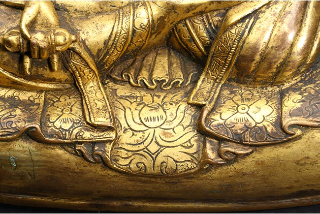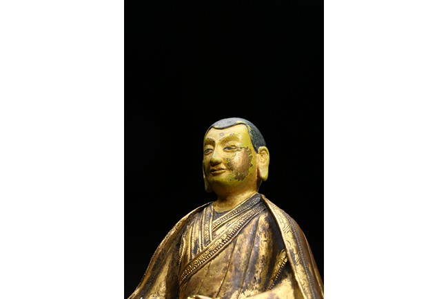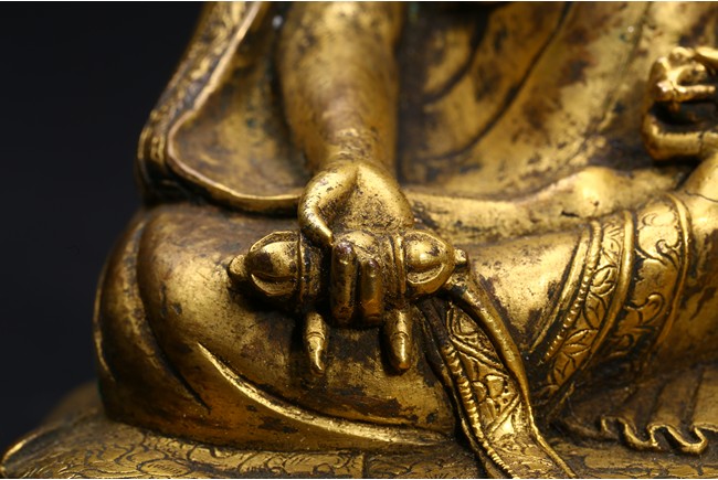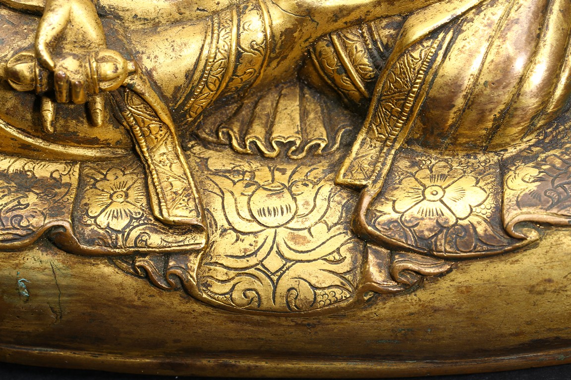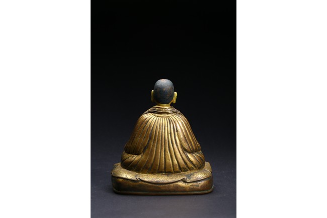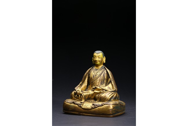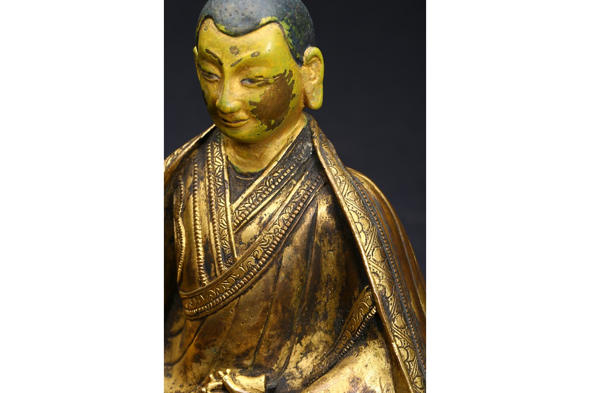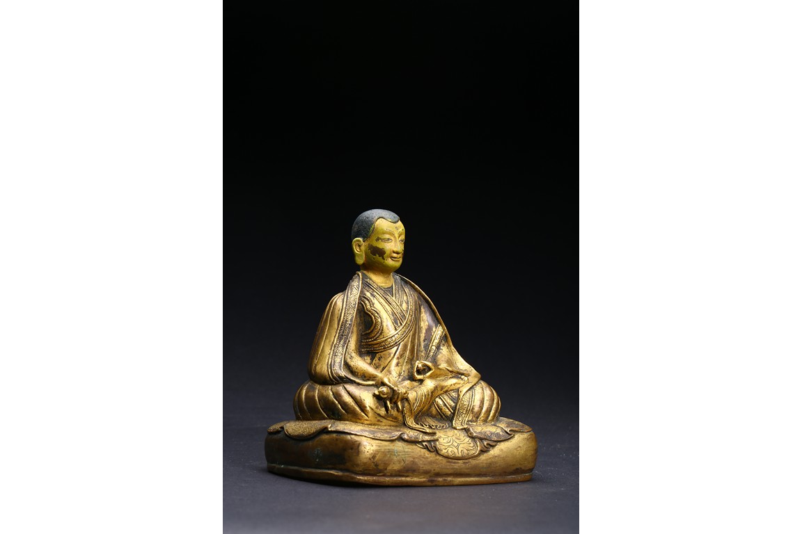 The Lama is seated on cushion, with his right hand resting on his knee holding a vajra, and his left hand rested in front of belly holding vajra. He is clad in heavy robes with foliate-incised hems, and holds his cold-gilt face in a serene expression with steady gaze. Ming Dynasty period.