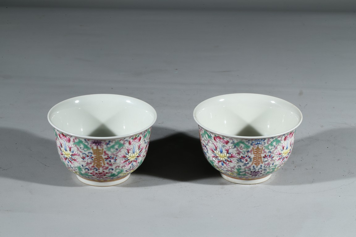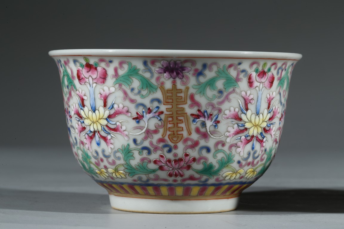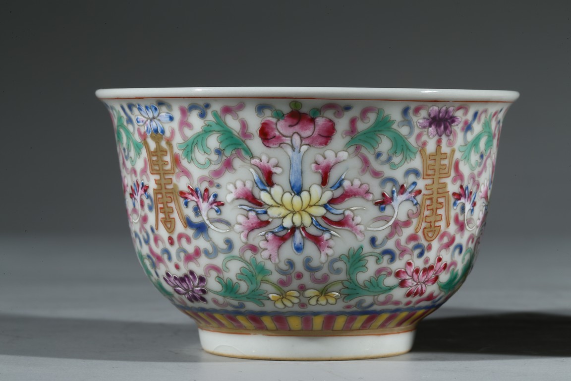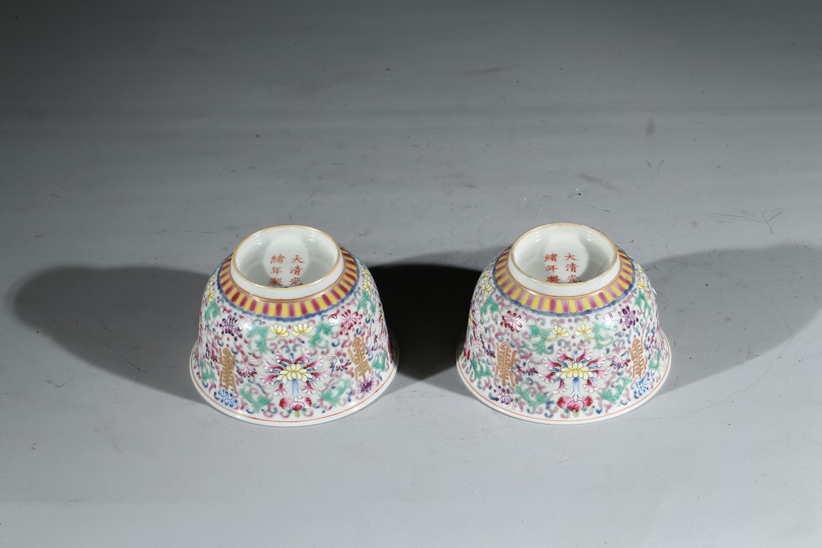 Each bowl enamelled with scrolled lotus pattern alternated by shou character, the base with Guangxu reign mark. Qing Dynasty period.