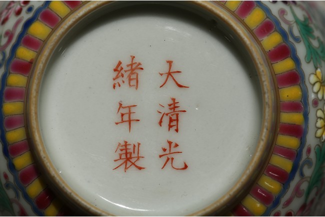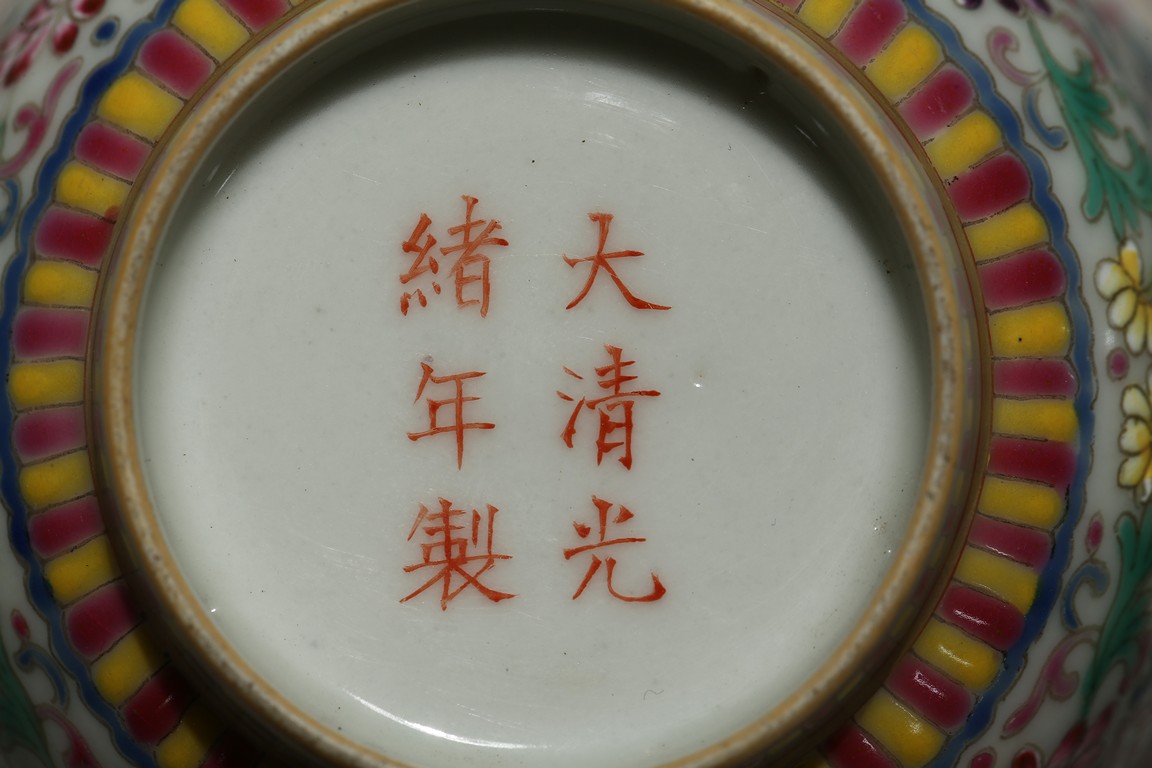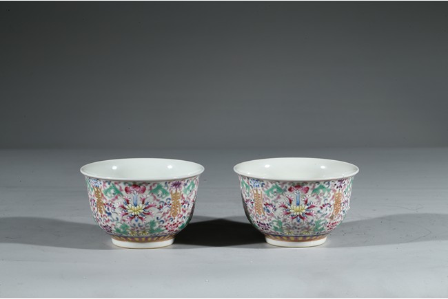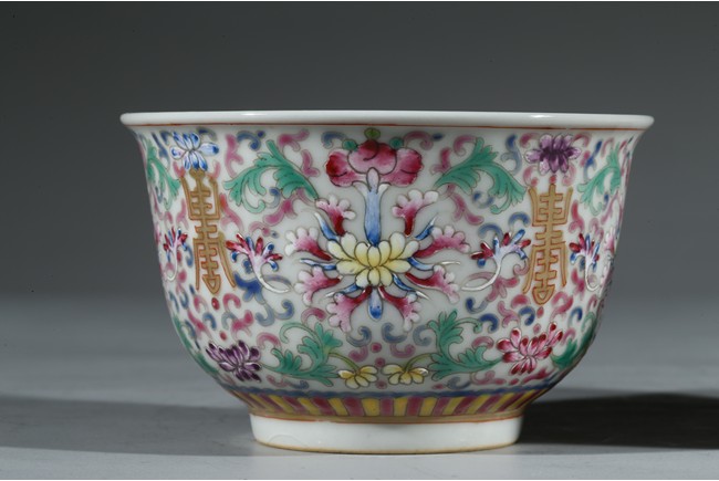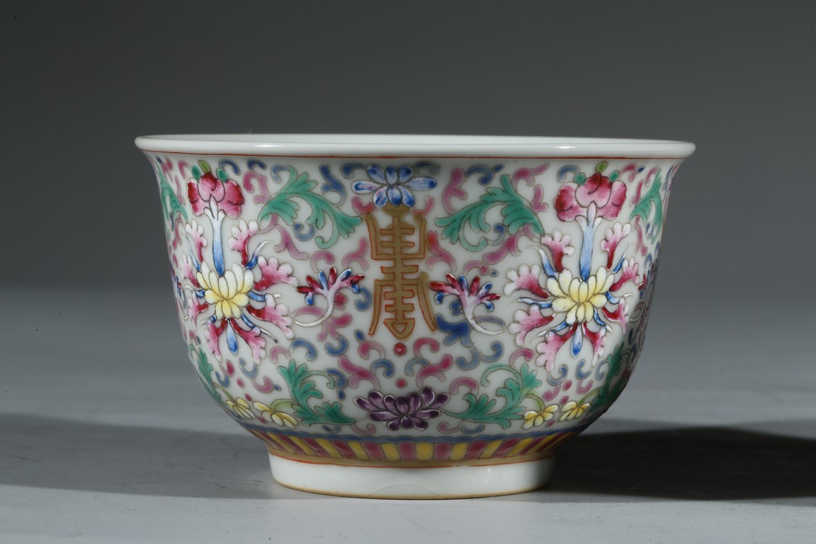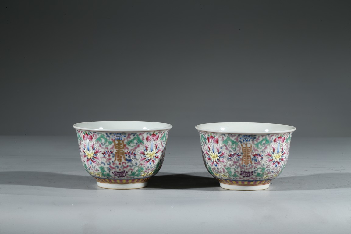 Each bowl enamelled with scrolled lotus pattern alternated by shou character, the base with Guangxu reign mark. Qing Dynasty period.