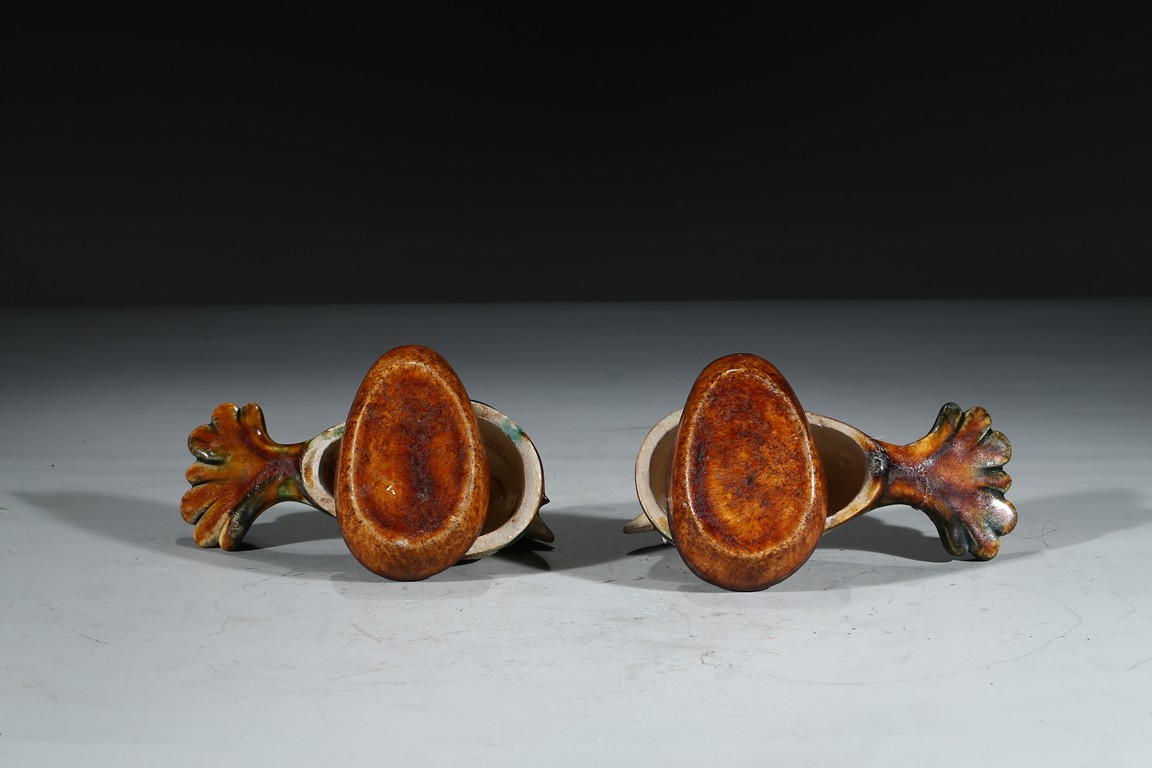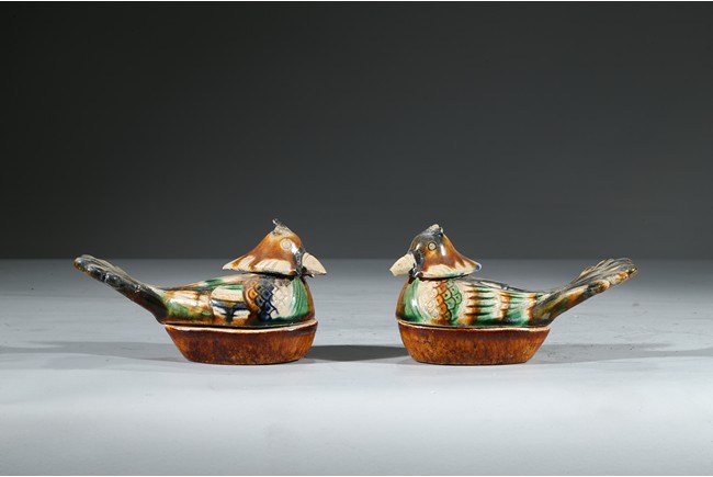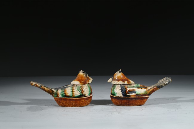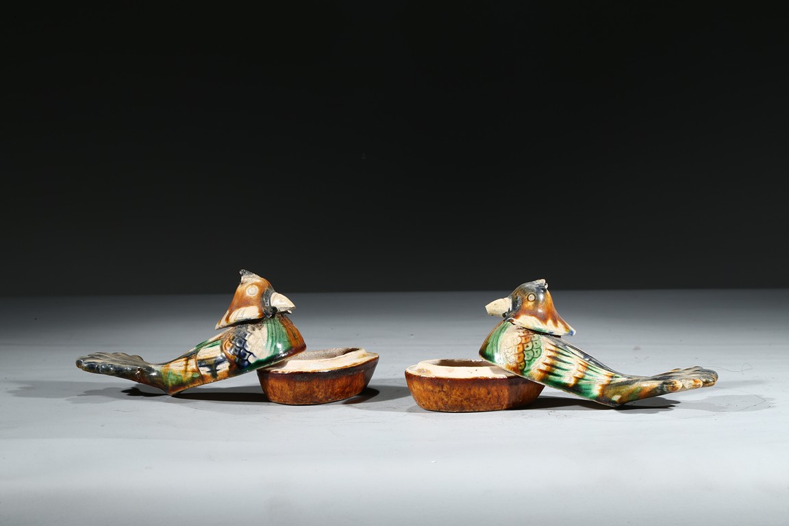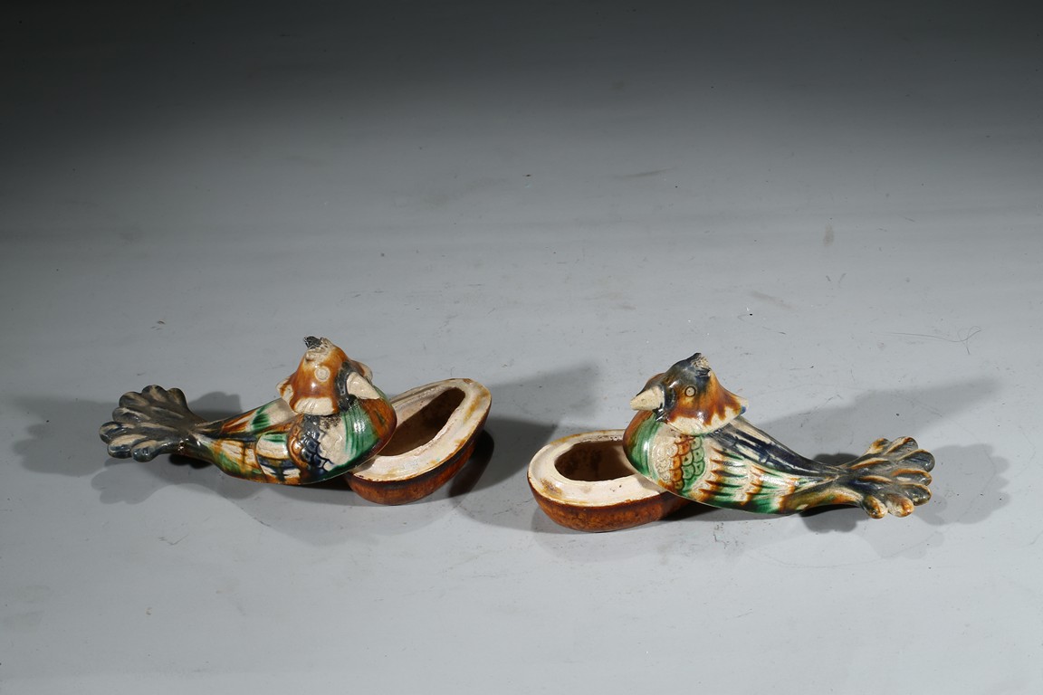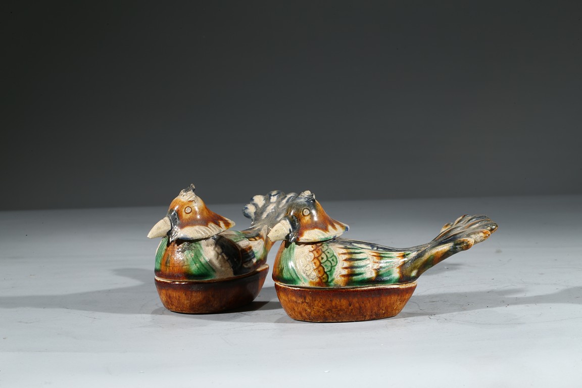 A PAIR OF SANCAI GLAZED POTTERY 'MANDARIN DUCK' BOXES 唐 三彩鴛鴦蓋盒一對