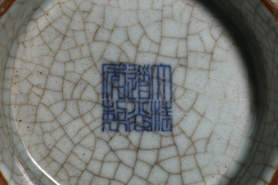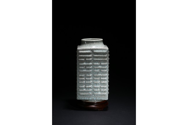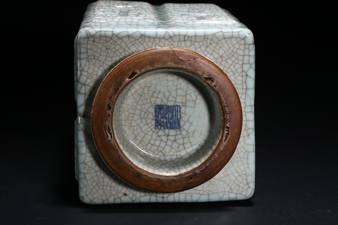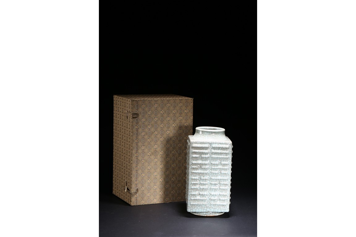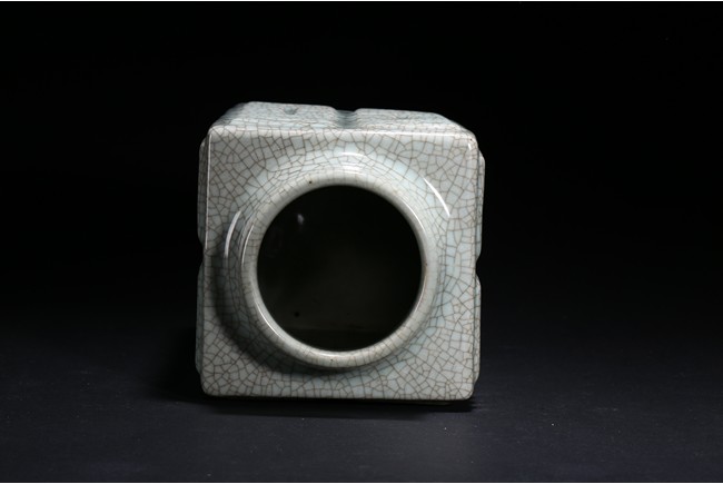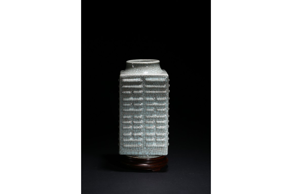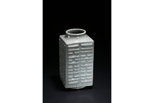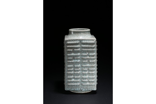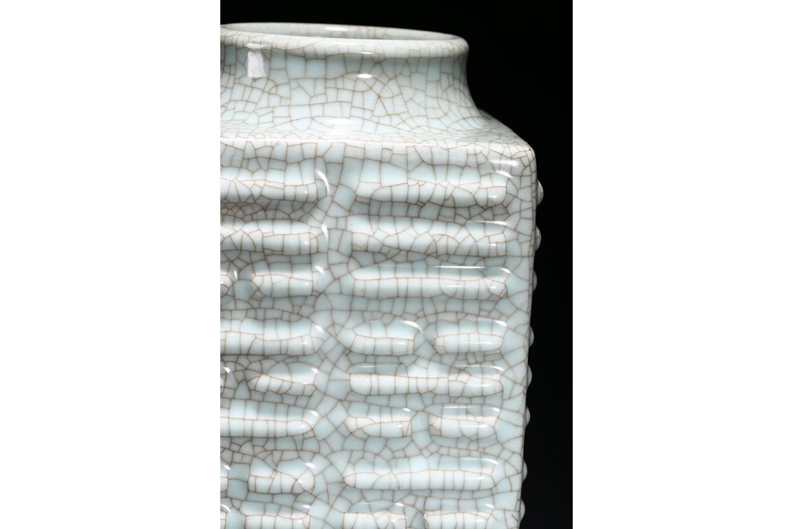 Modelled after the archaic jade prototype, of square section with a short cylindrical neck, each side moulded in relief with two columns of short dashes representing the 'Eight Daoist Trigrams', covered overall with an even ash-grey glaze suffused with a fine network of black-stained crackles. Mark and period of Daoguang.