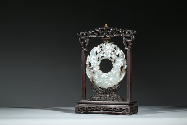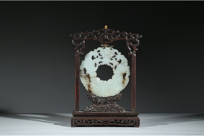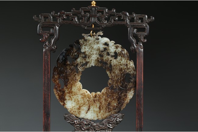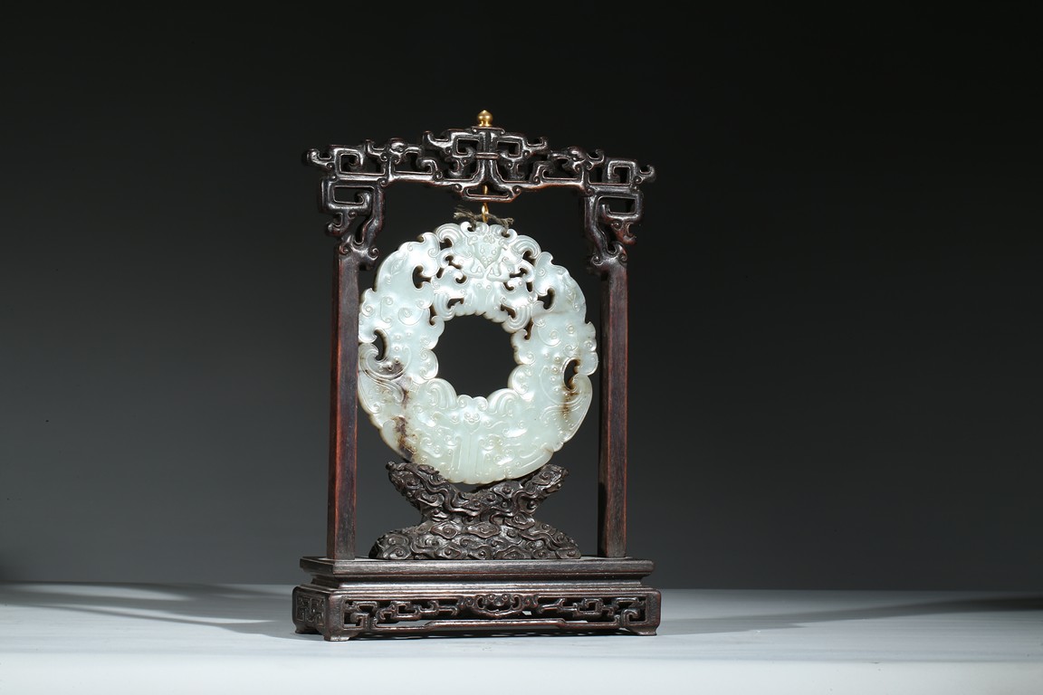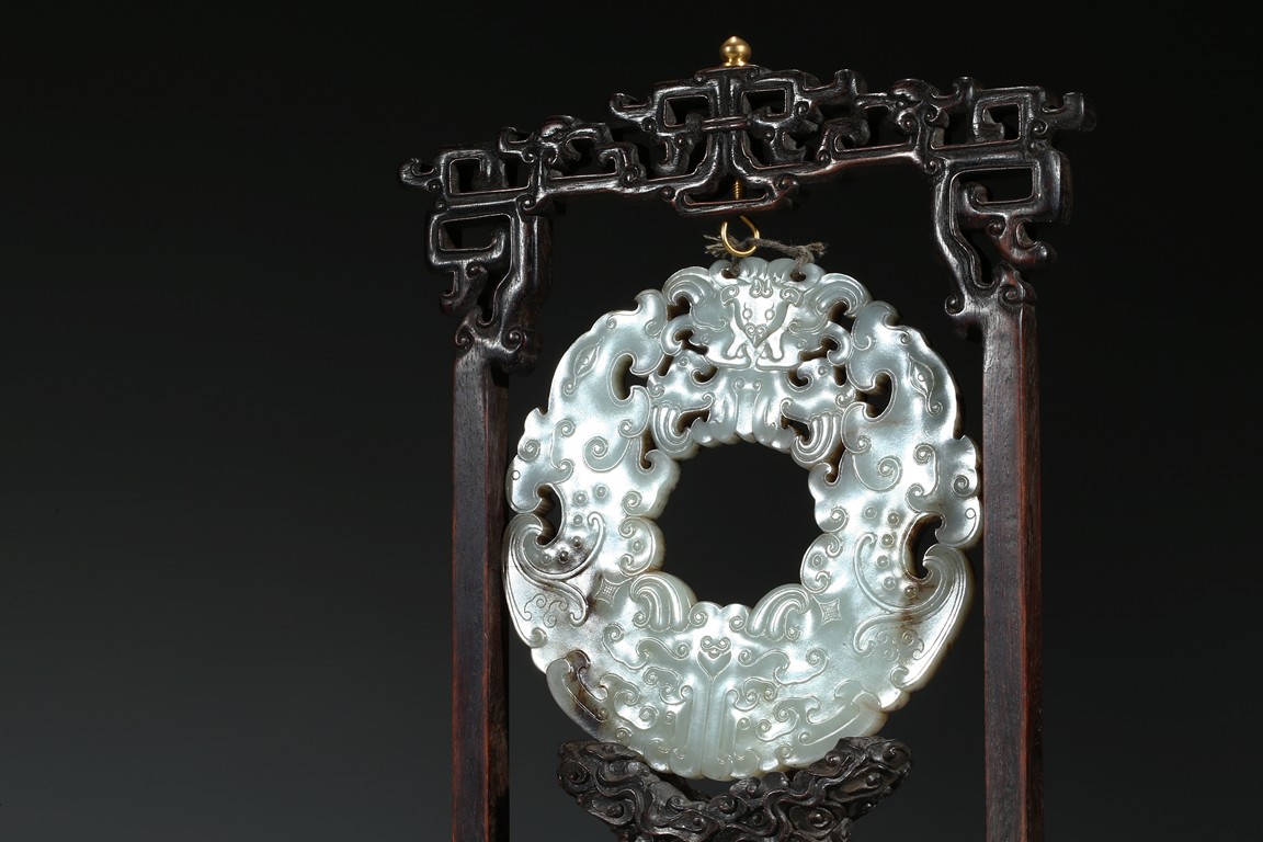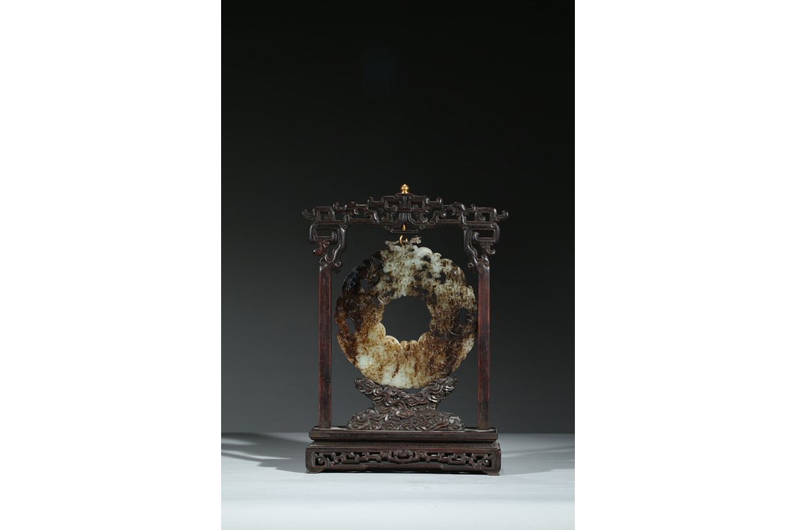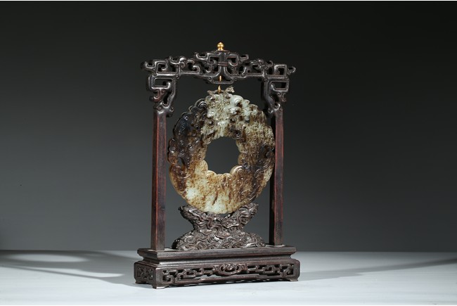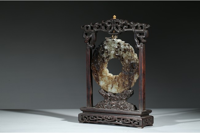 The jade bi disk modelled in the form of two coiled mythical beasts confronting each other, hanging on a wood frame and stand. Ming Dynasty period.