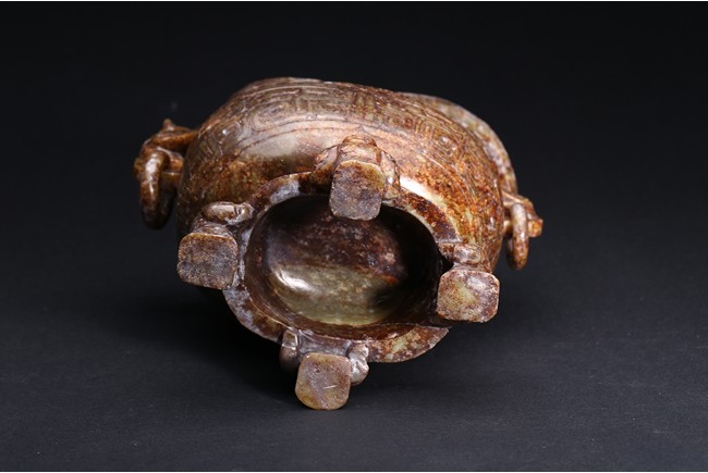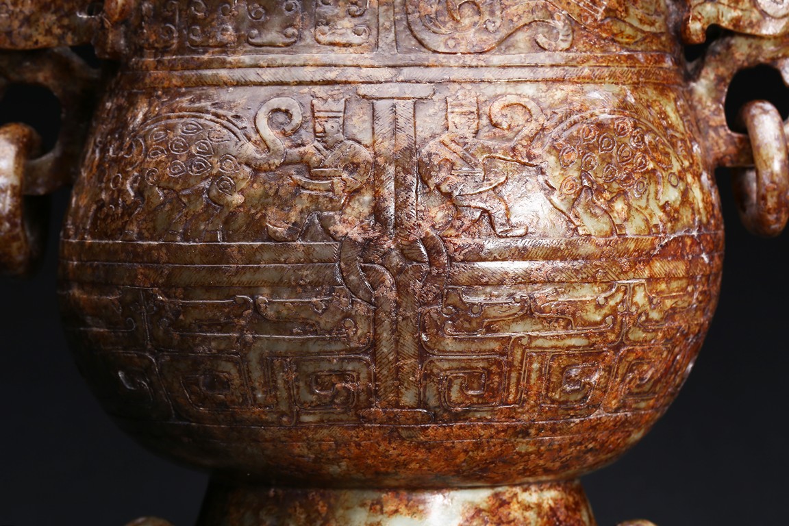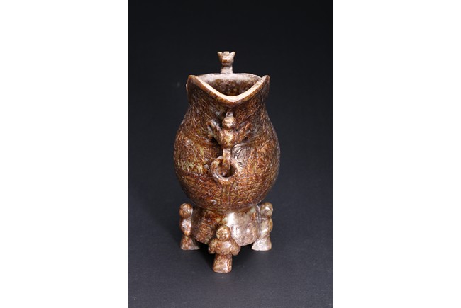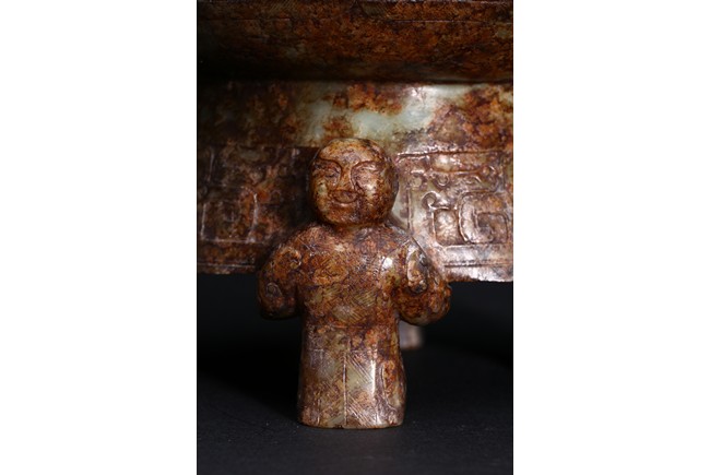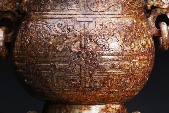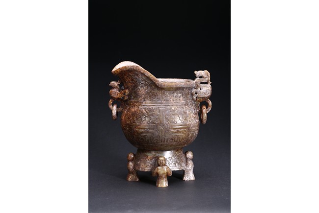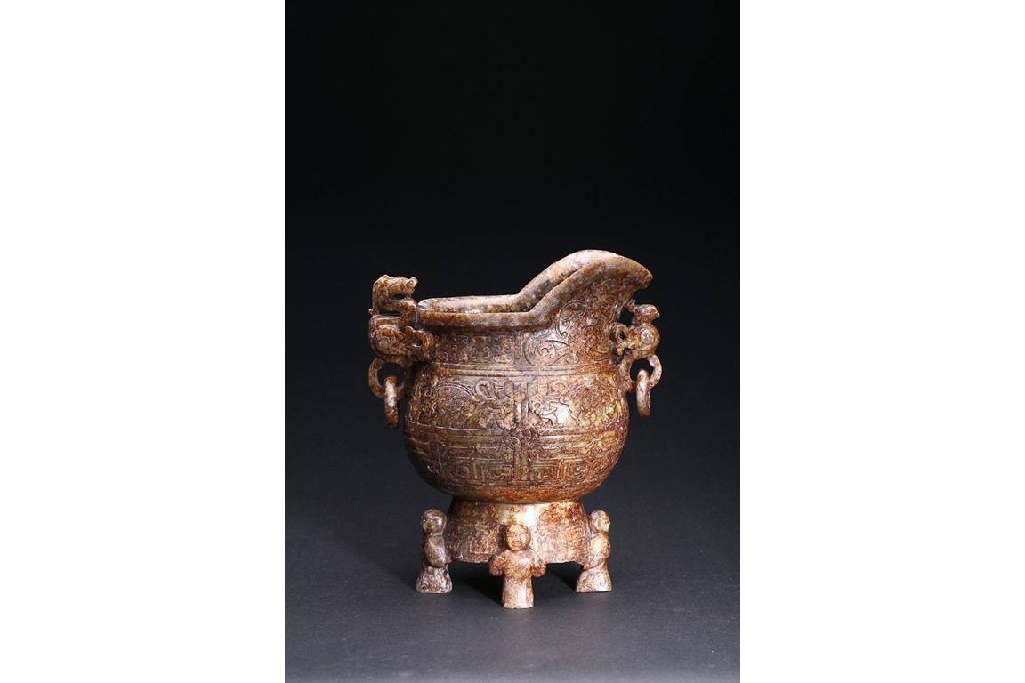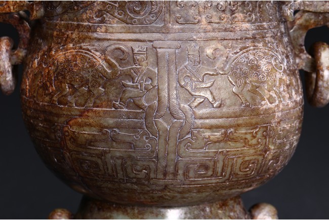 The vessel carved with archaistic figures and buffalo pattern around the body, all supported on figure feet.