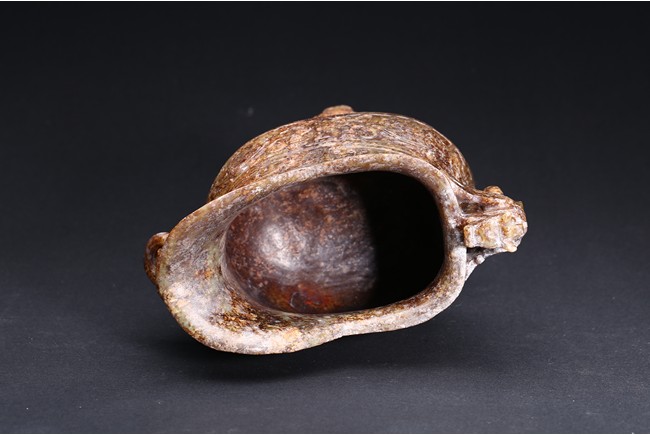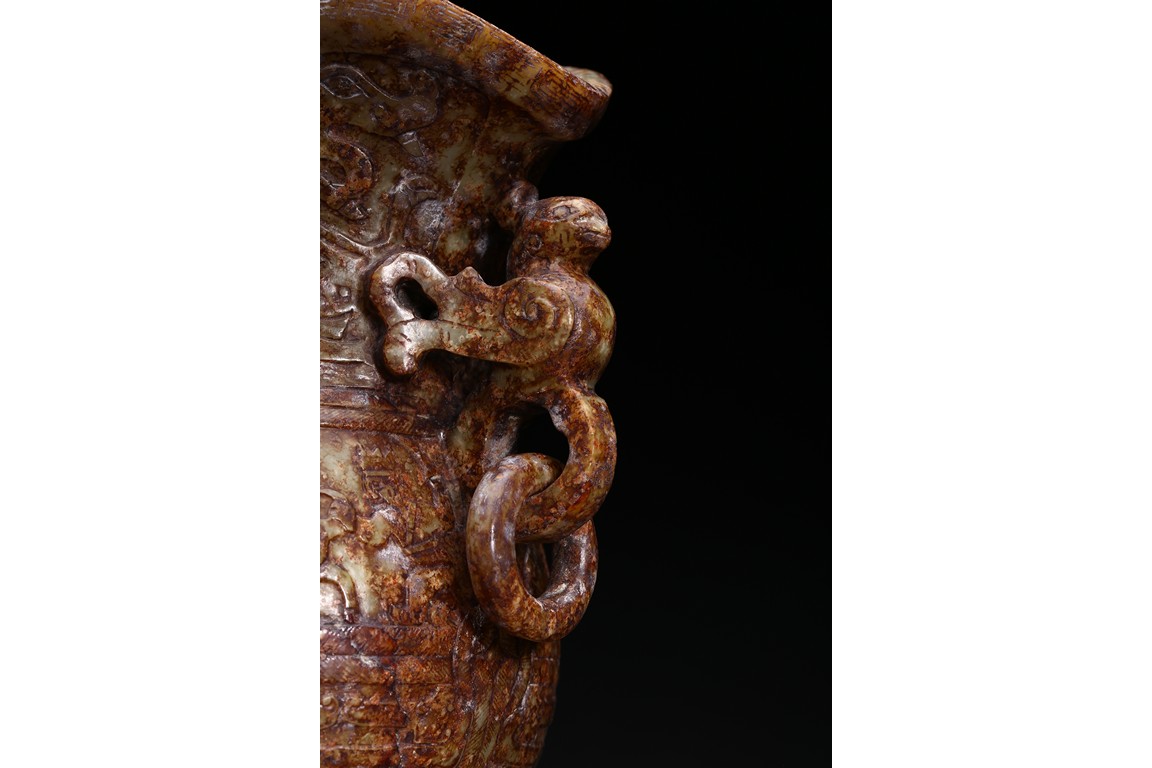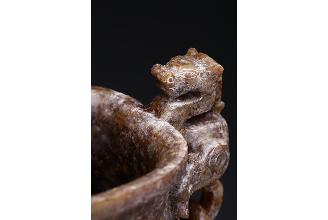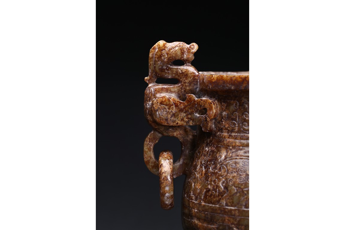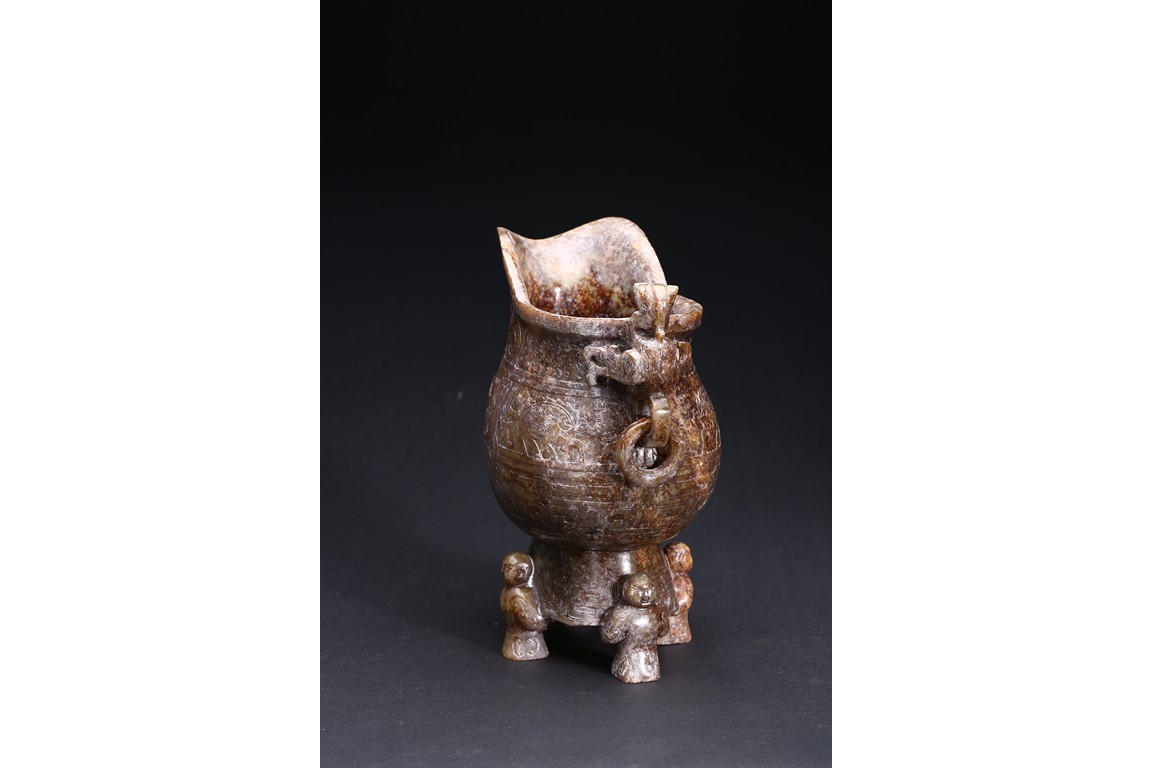 The vessel carved with archaistic figures and buffalo pattern around the body, all supported on figure feet.