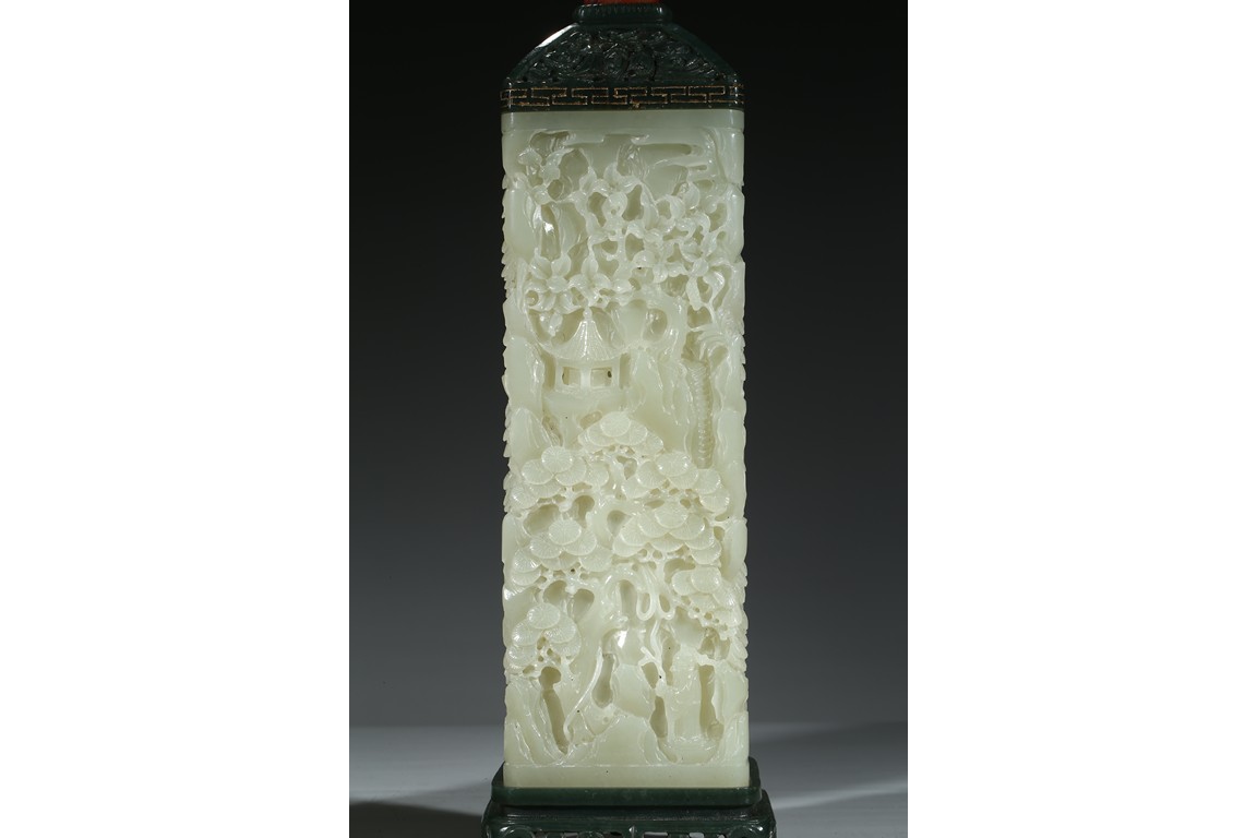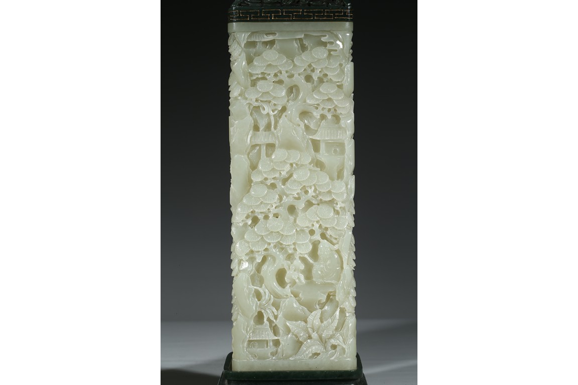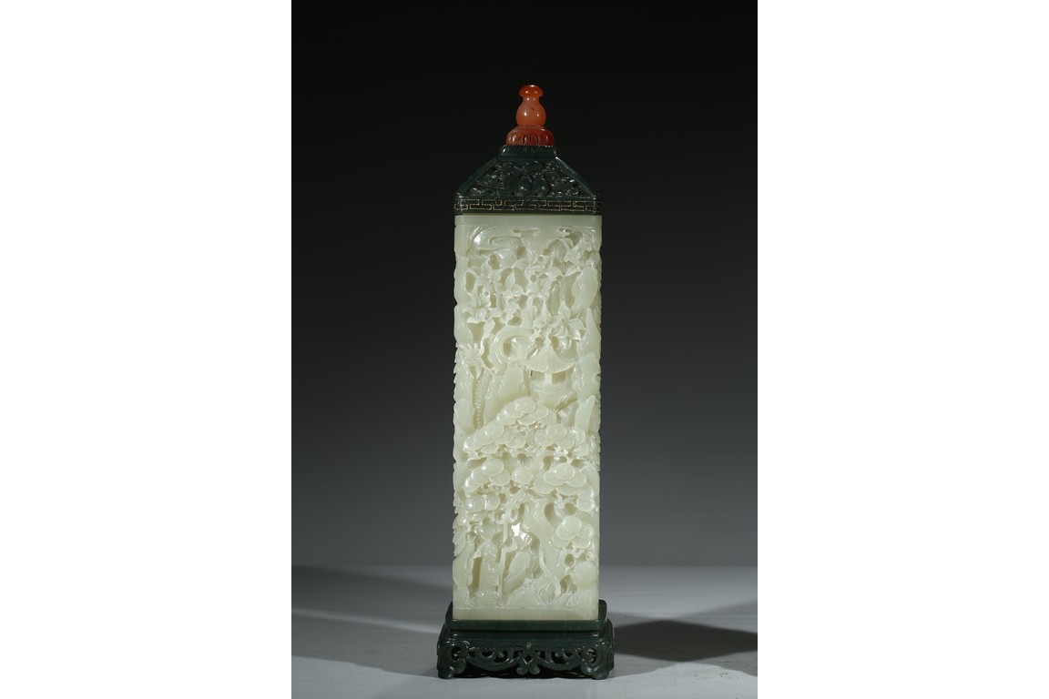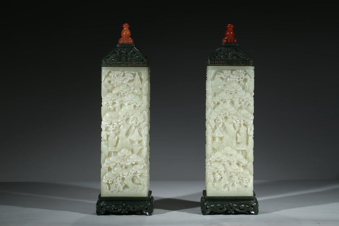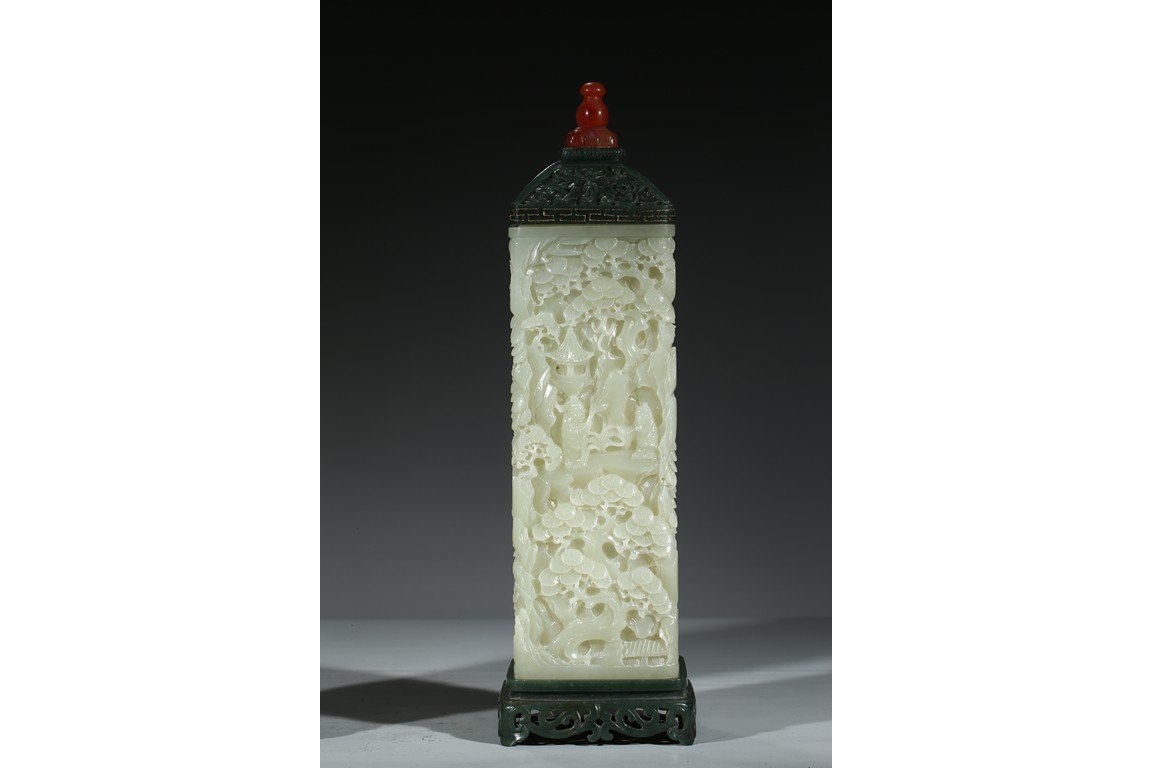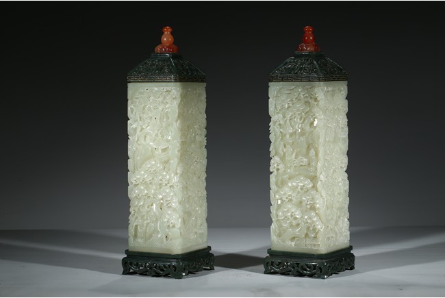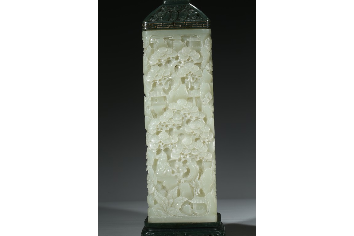 Of square section, each side finely carved and pierced with landscape scene, fitted with spinach green jade cover and stands.