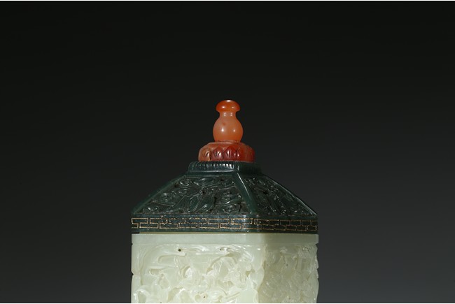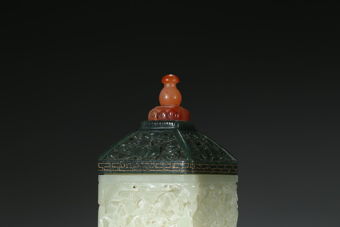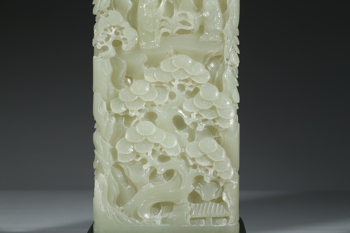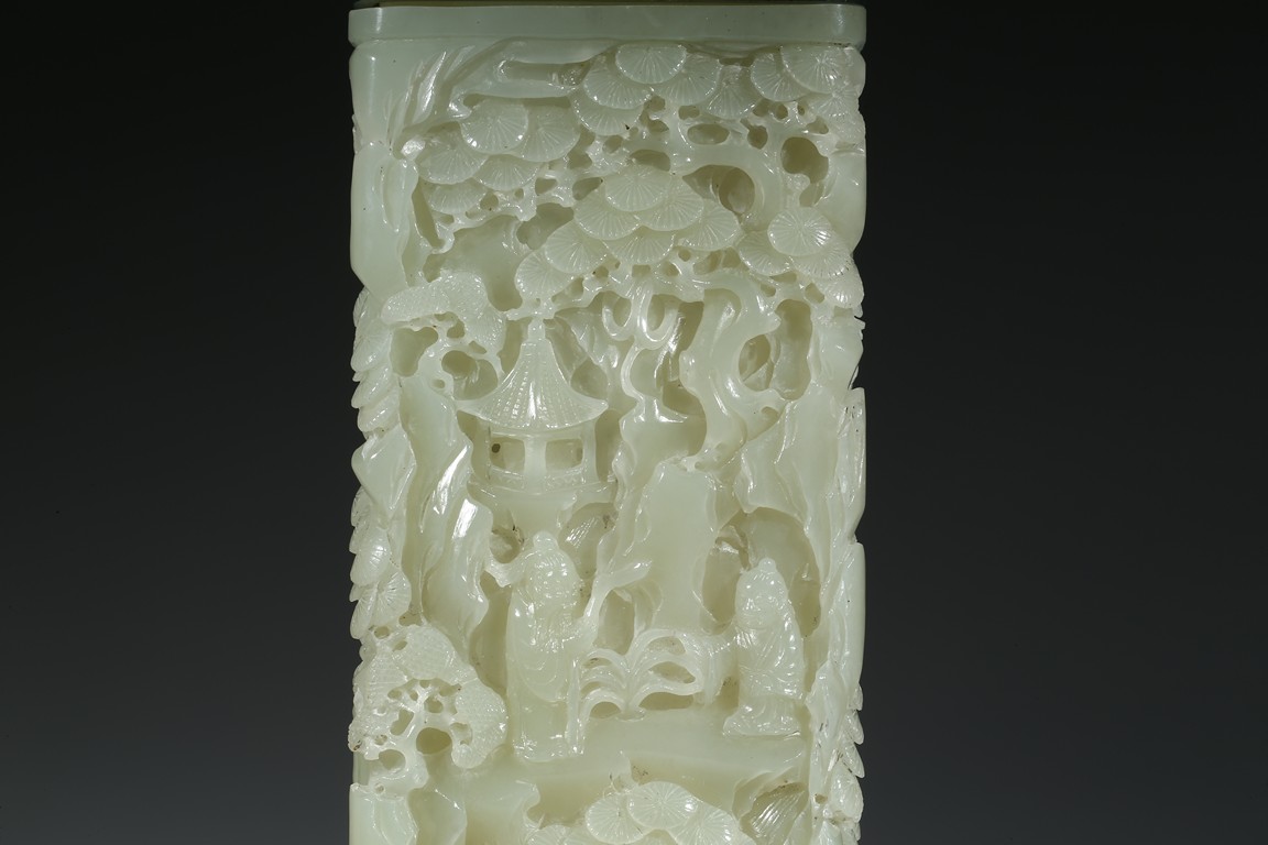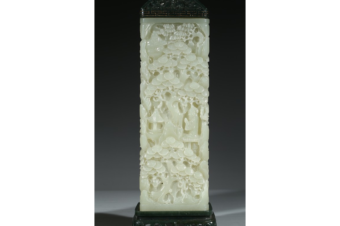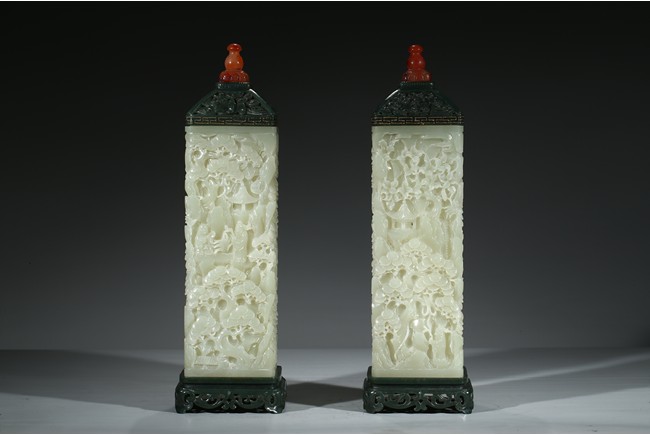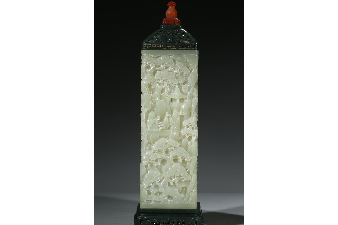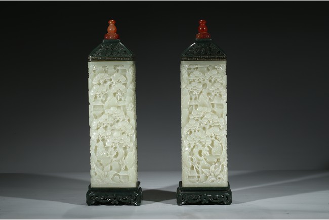 Of square section, each side finely carved and pierced with landscape scene, fitted with spinach green jade cover and stands.