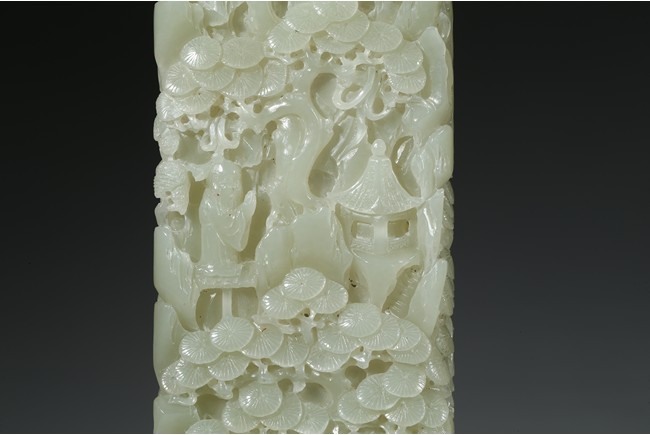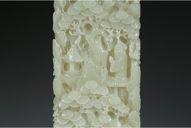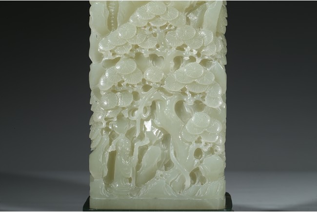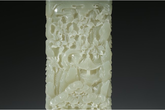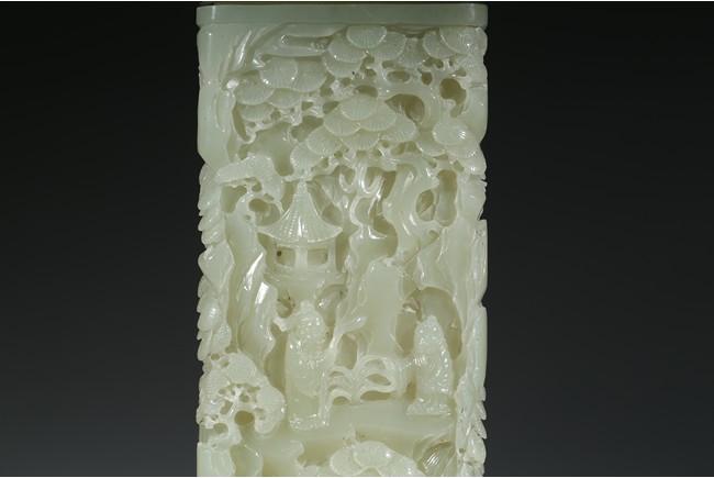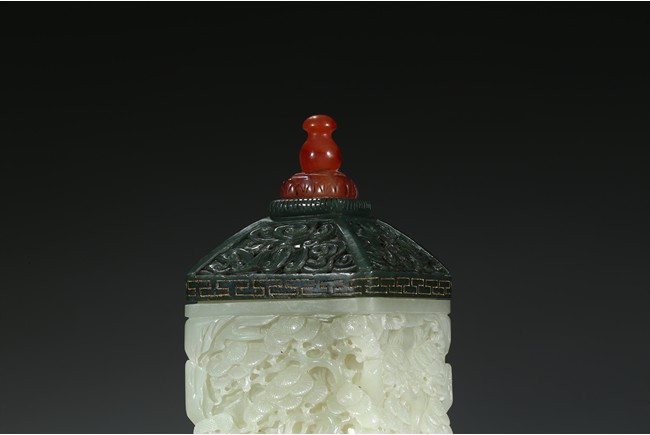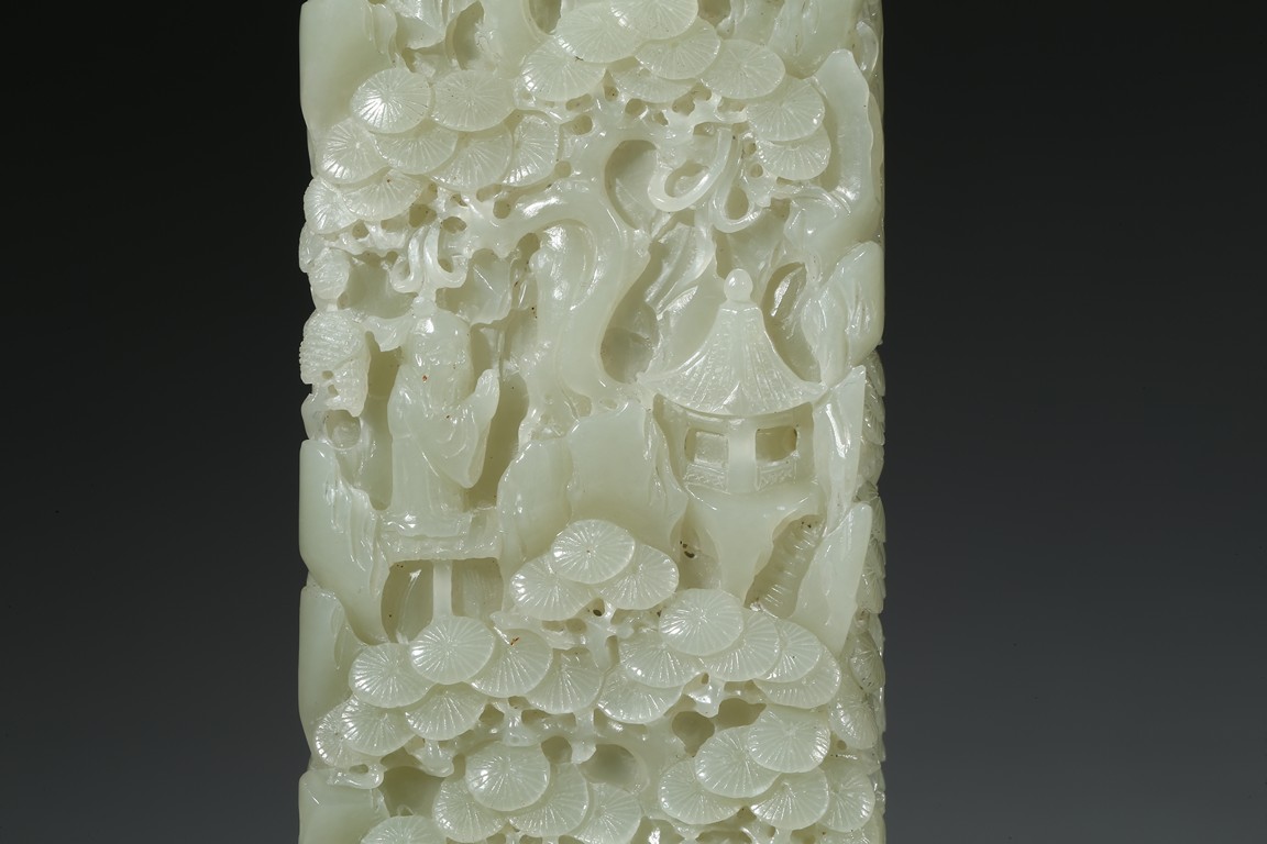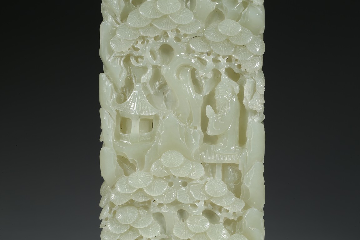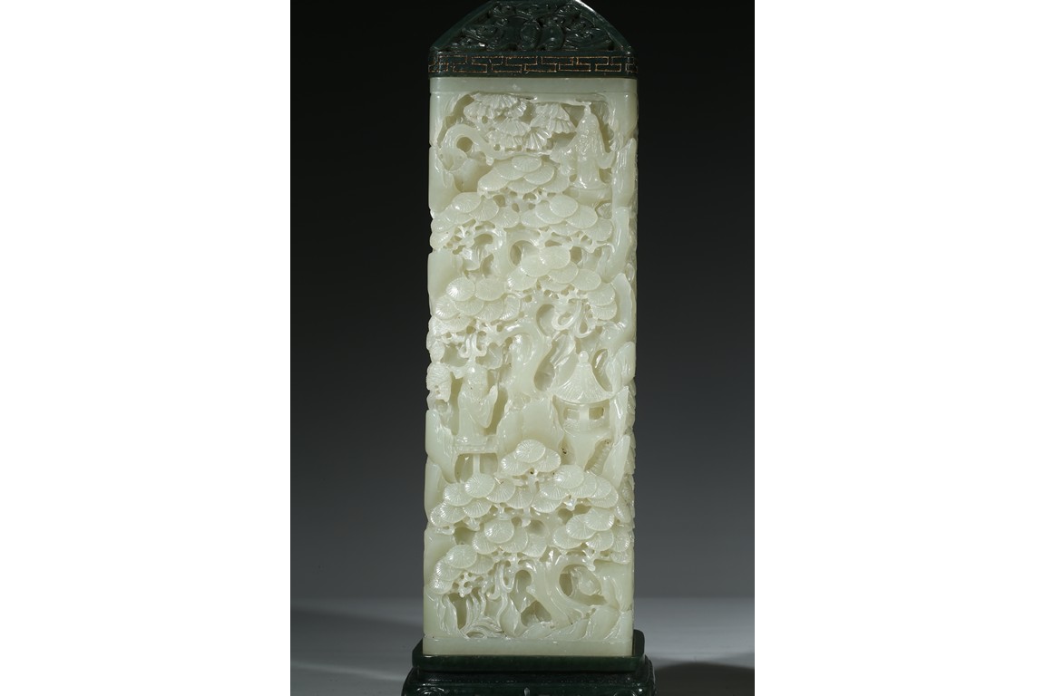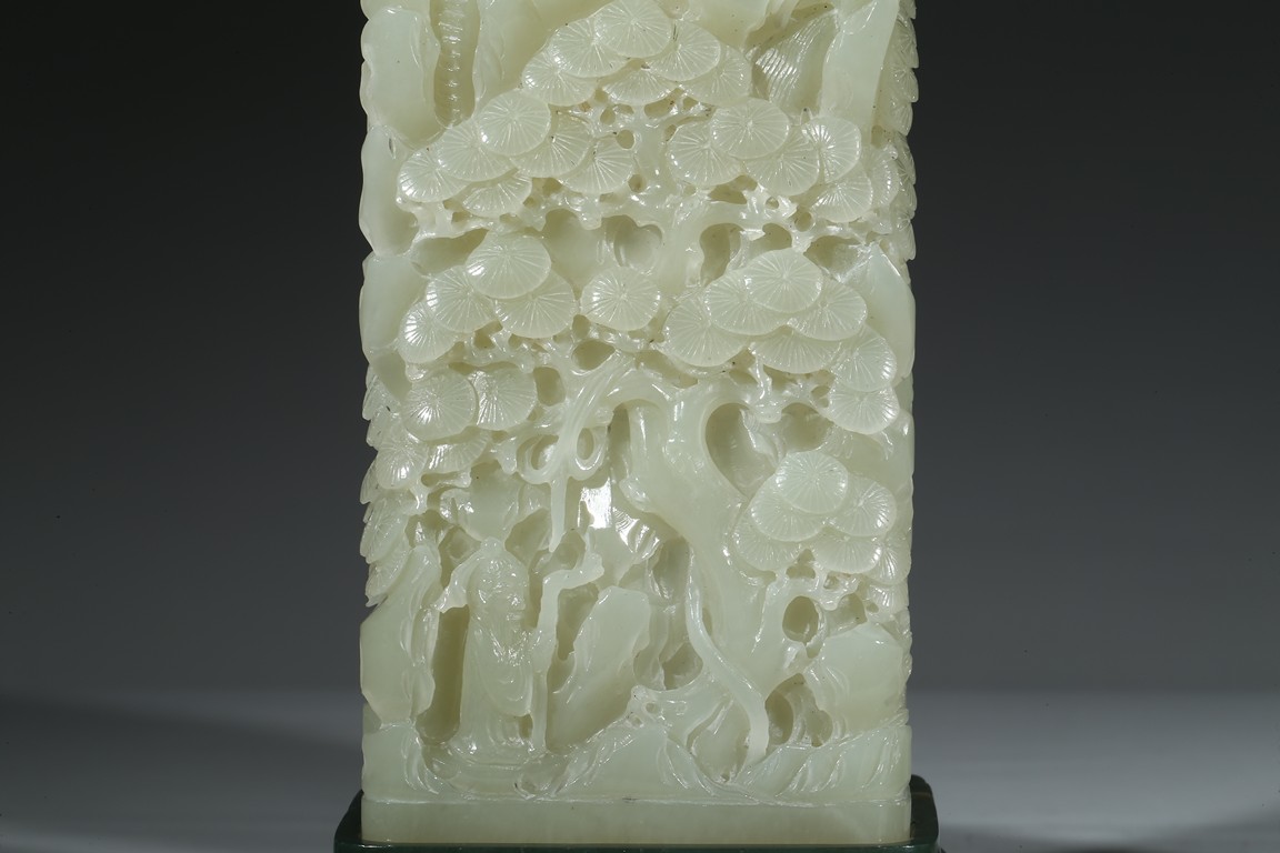 Of square section, each side finely carved and pierced with landscape scene, fitted with spinach green jade cover and stands.