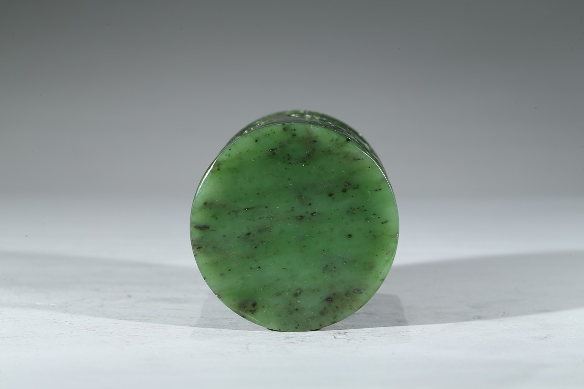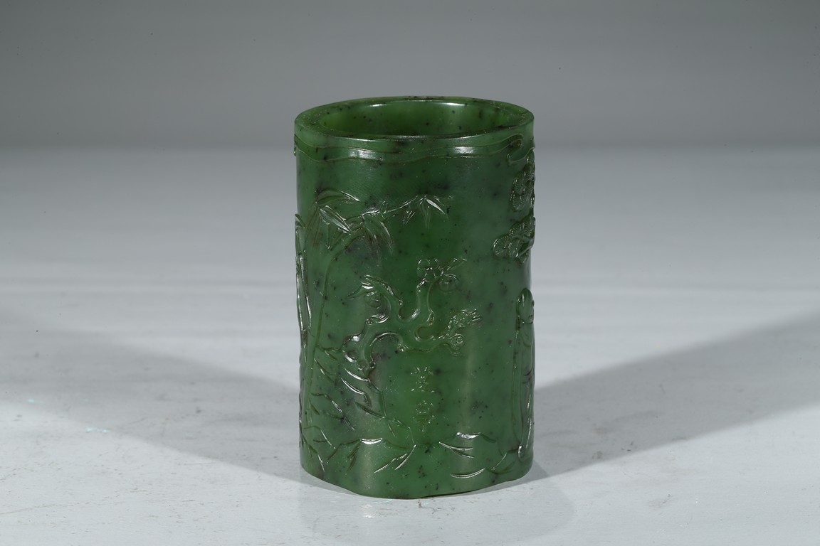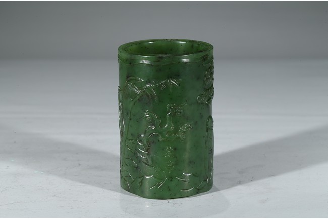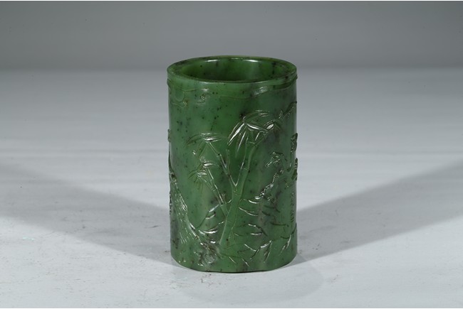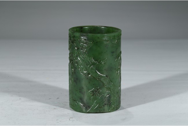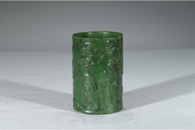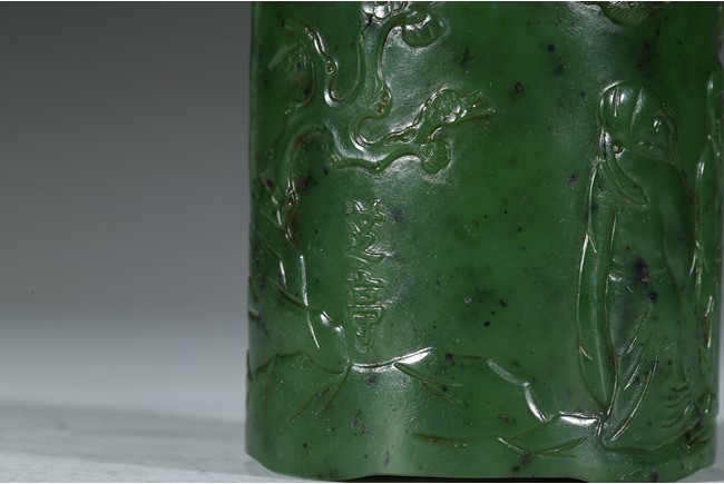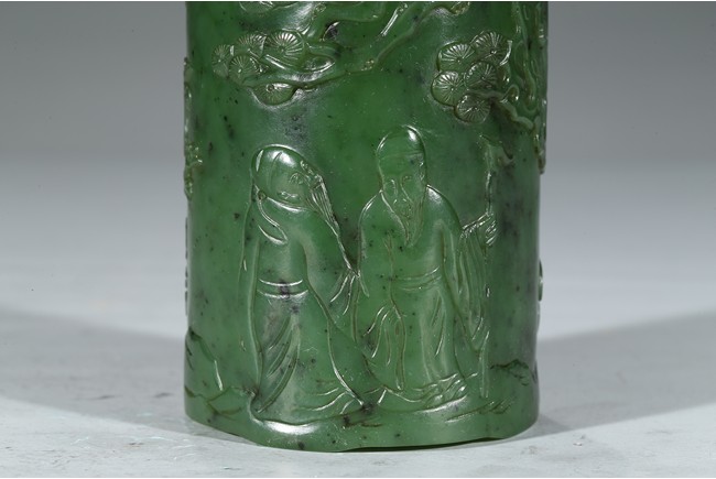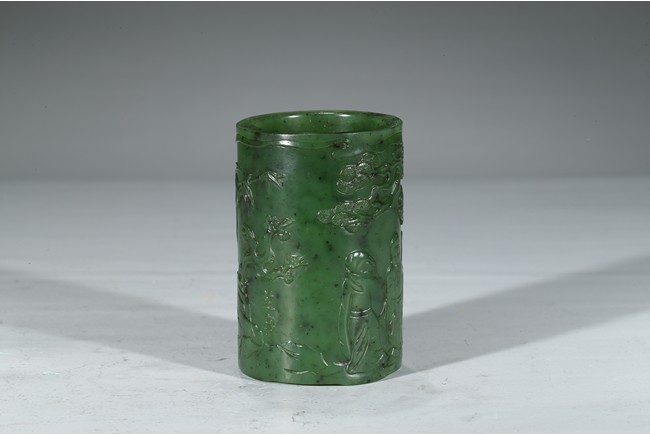 筆筒以精挑細選的和闐碧玉料雕制,圓筒形,厚重,圓口,器壁以浮雕通景琢松下居士仙遊圖,通景圖案的設計佈局、刀法之刻劃表現均是融以畫意,人物傳神,雕琢細膩,刀法嫻熟精湛。 (芝亭,為清初之人,與朱永泰等人共為玉雕大家。是乾隆宮廷玉雕名家,其作品構思巧妙,意境非凡,特別擅長文玩詩文牌、佩的雕琢。雕工刀法嫻熟精湛,細微之處乾淨利落構思巧妙,人物詩文清雅淡趣。書體勁秀文雅,錯落有致,轉折、銜接刀法流暢似為一氣呵成。整體方寸之間詩書畫意盡在其中,傳神寫意小中見大,唯皇宮貴族不可得也。) 來源: 新加坡“德鴻”古美術藏家提供