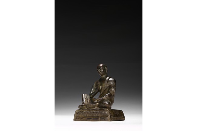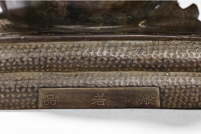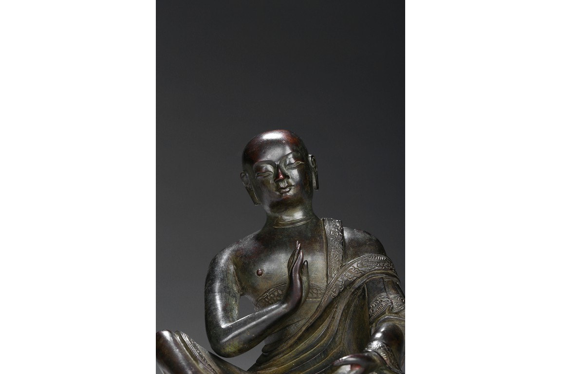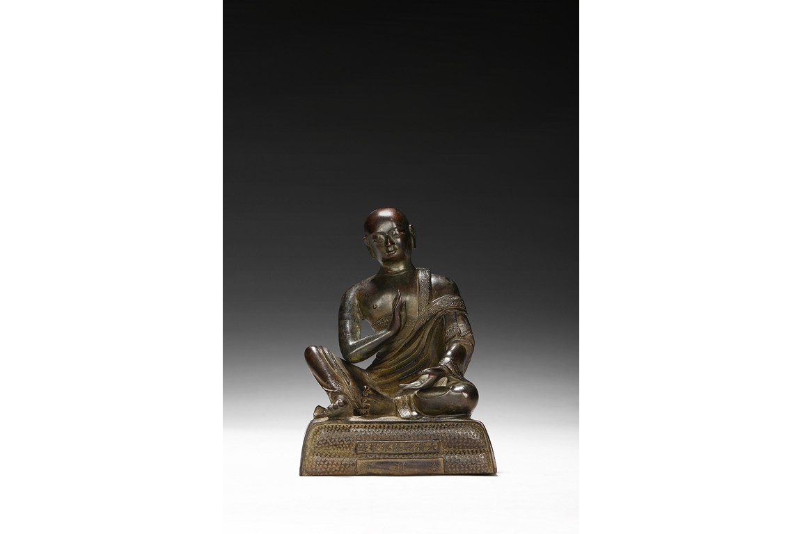 The figure is shown seated on a plinth with inscriptions to the front and back, both hands raised in mutra, wearing a loose dhoti revealing right shoulder, the face in meditative expression. Mid Qing Dynasty period.