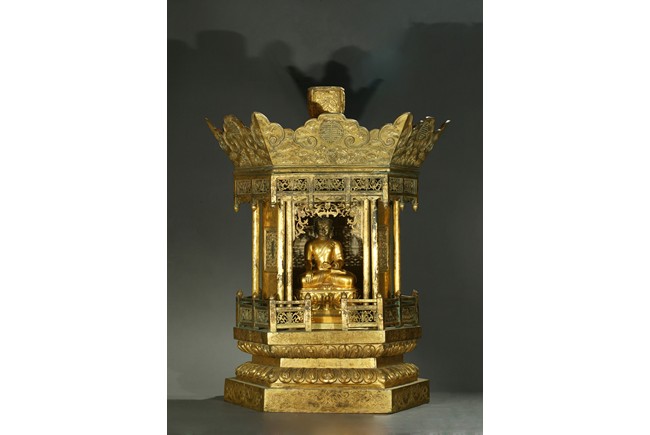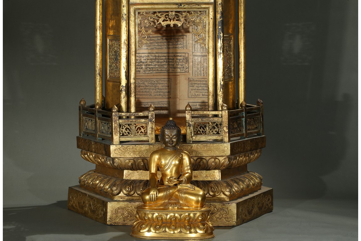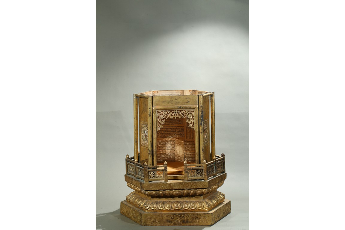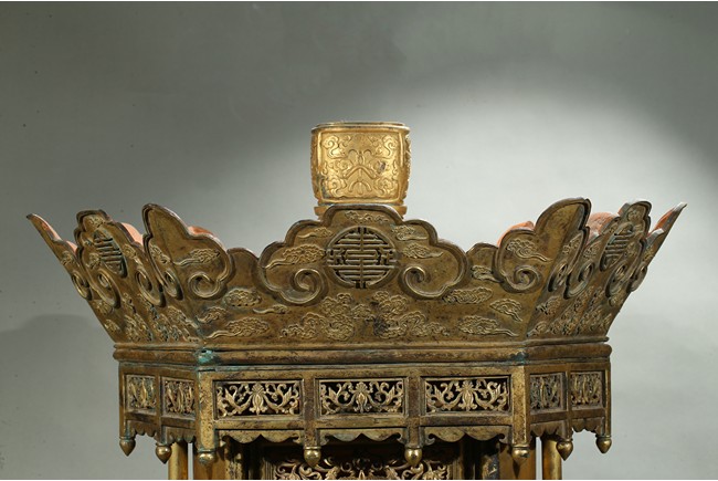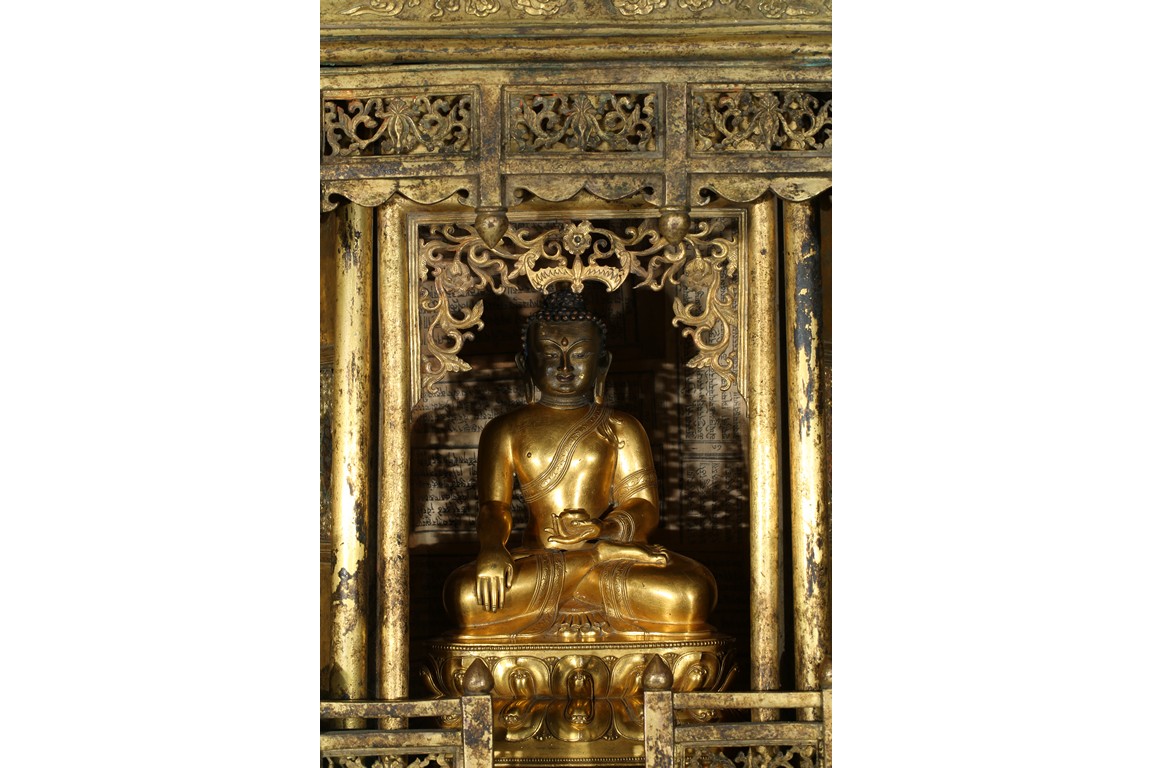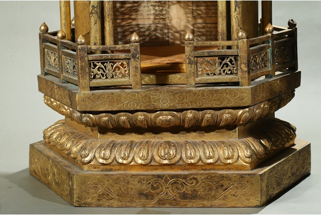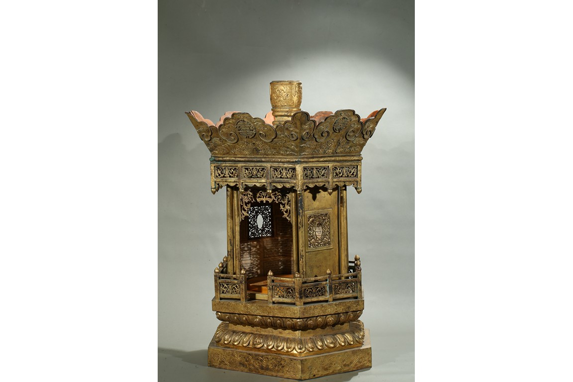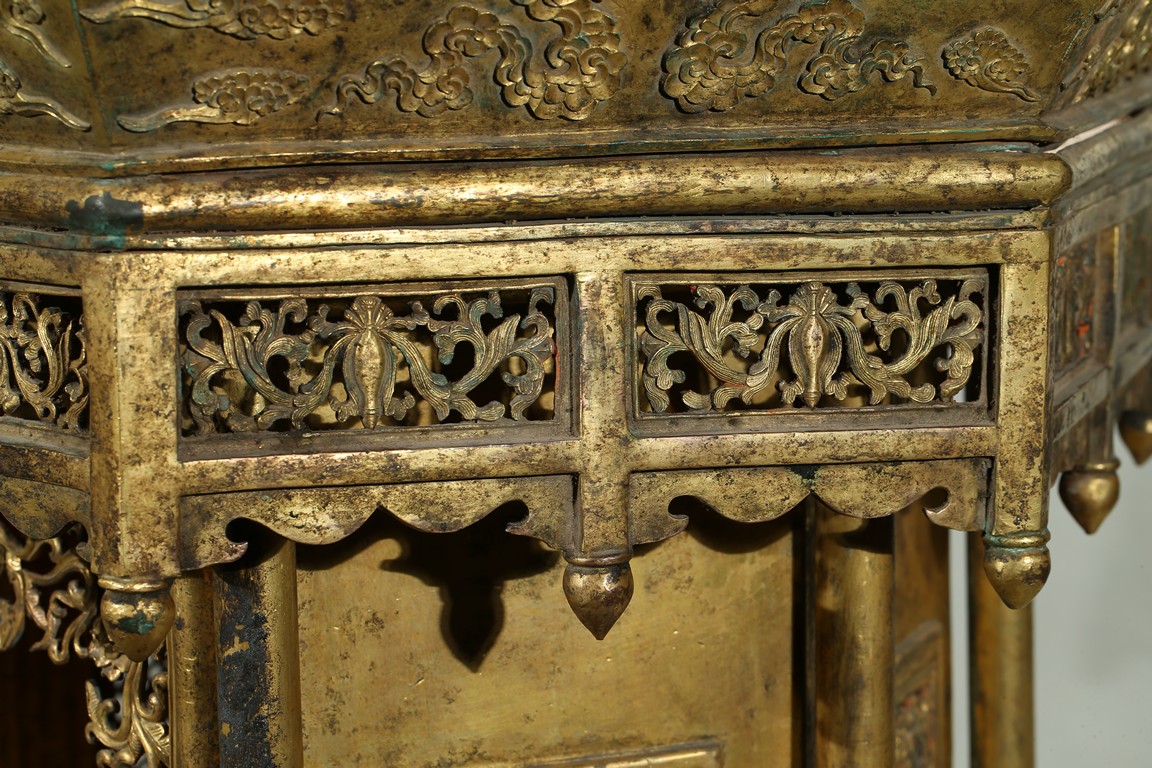 Of architectural pavilion form, the hexagonal pedestal base rising to the central open galleried section, each with cylindrical columns supporting the arched roof and with ornate pierced balustrades, the roof with shou symbols and auspicious clouds decorated in relief, the top surmounted with a rounded finial. The interior with an associated gilt-bronze figure of bodhisattva, the base sealed, seated in dhyanasana upon double lotus throne with right hand resting on leg, left hand holding a bowl in dhyana mudra, wearing loose-fitting robe falling in elegant folds, the serene face with downcast eyes and gentle smile flanked by pendulous earlobes, the head with tall ushnisha with tight curls. Qing Dynasty Qianlong period.