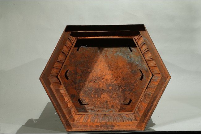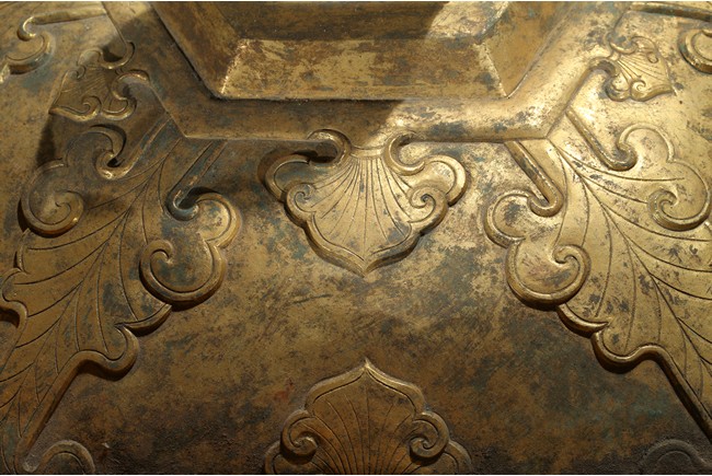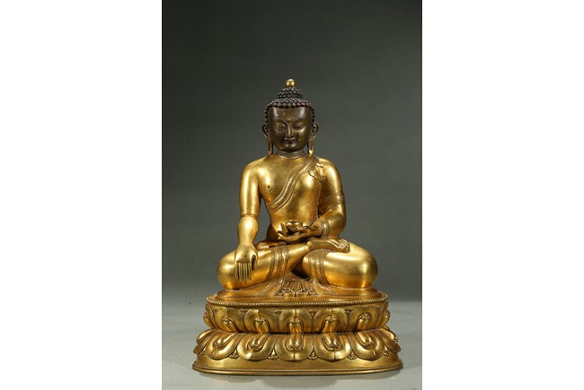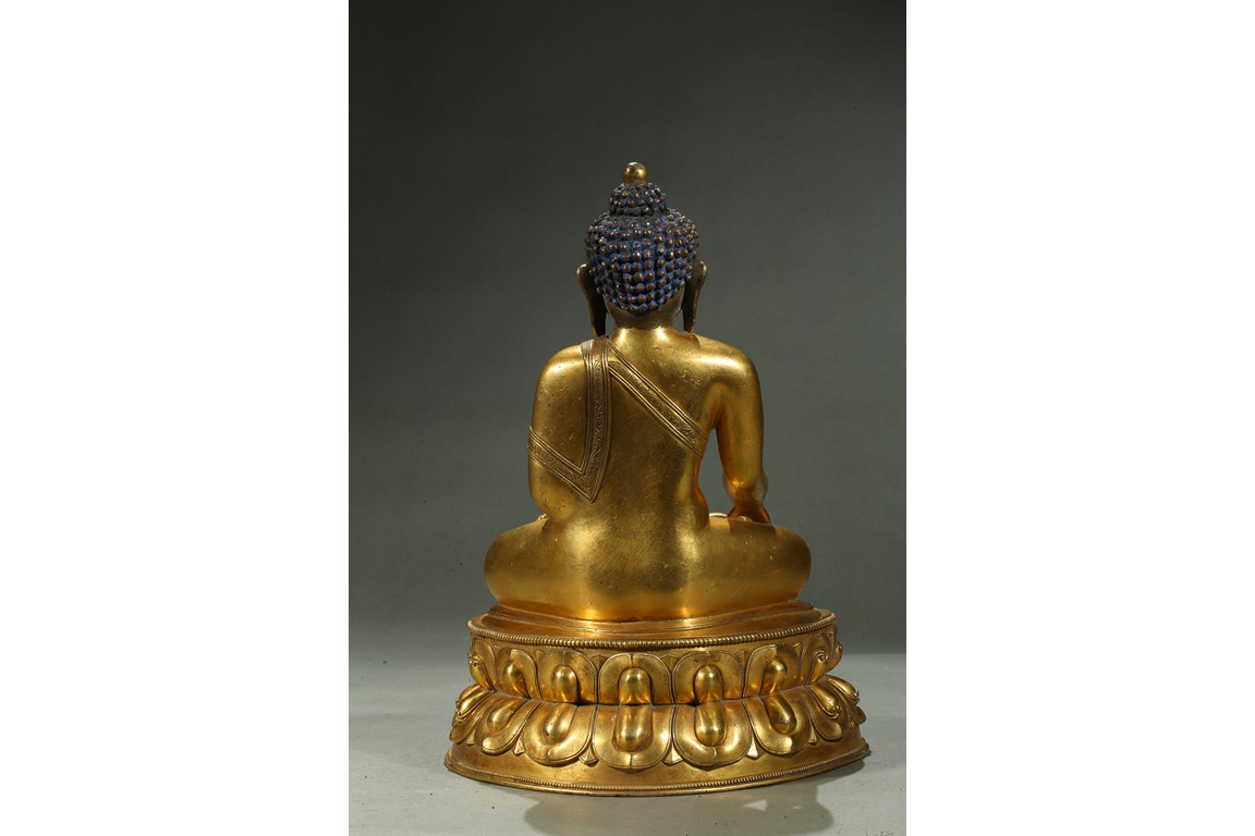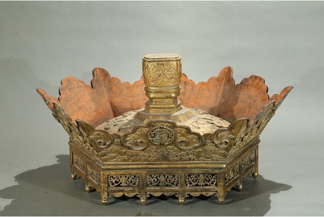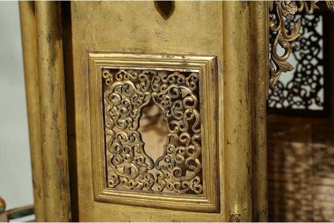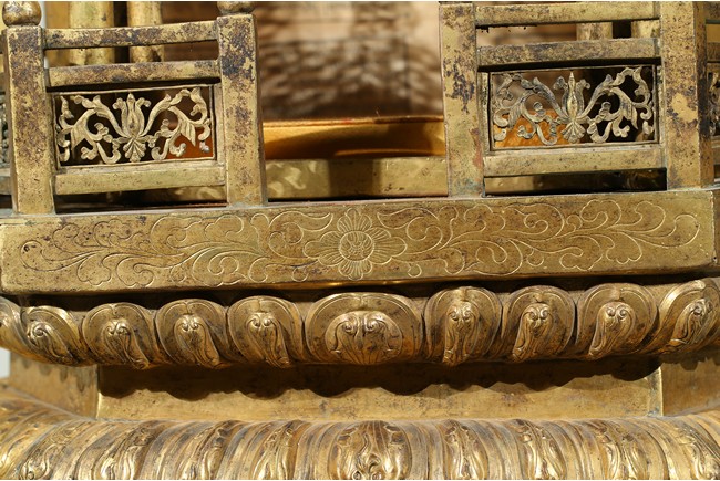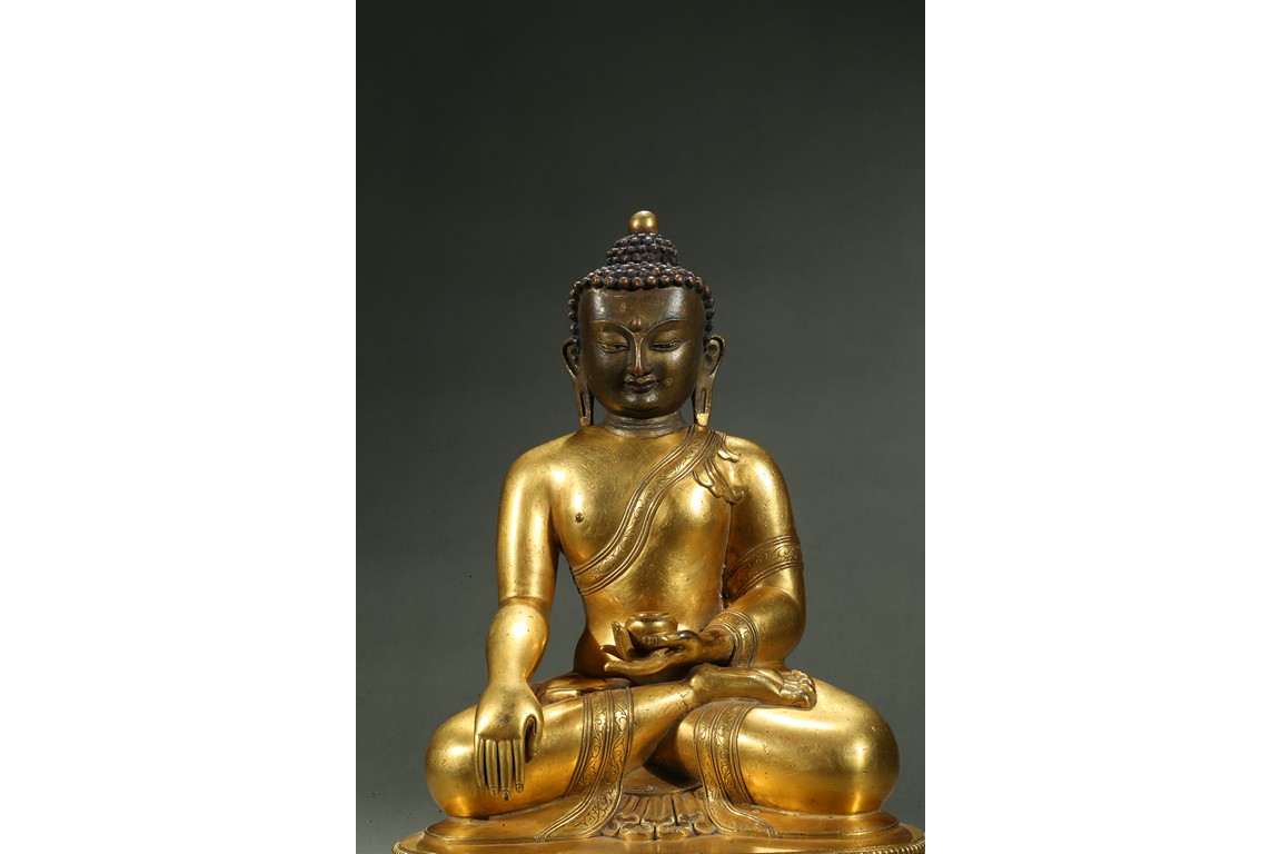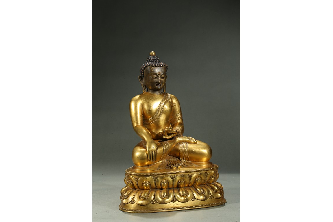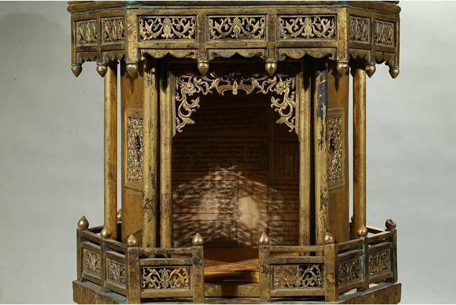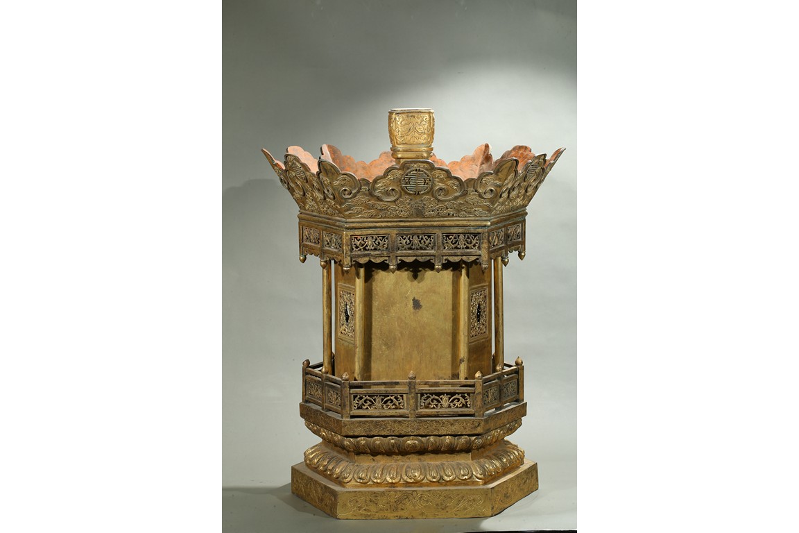 Of architectural pavilion form, the hexagonal pedestal base rising to the central open galleried section, each with cylindrical columns supporting the arched roof and with ornate pierced balustrades, the roof with shou symbols and auspicious clouds decorated in relief, the top surmounted with a rounded finial. The interior with an associated gilt-bronze figure of bodhisattva, the base sealed, seated in dhyanasana upon double lotus throne with right hand resting on leg, left hand holding a bowl in dhyana mudra, wearing loose-fitting robe falling in elegant folds, the serene face with downcast eyes and gentle smile flanked by pendulous earlobes, the head with tall ushnisha with tight curls. Qing Dynasty Qianlong period.