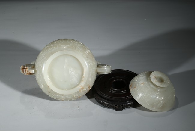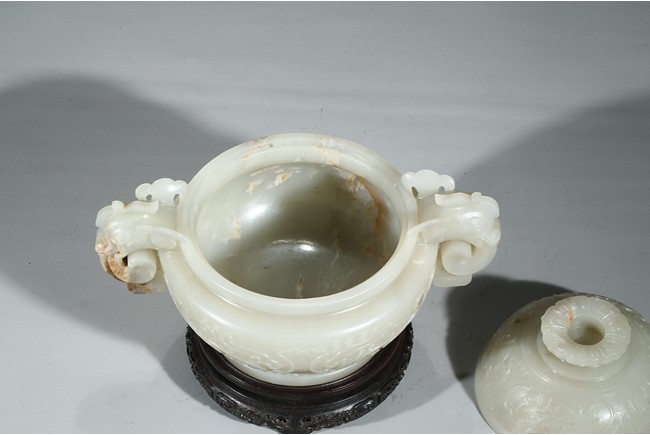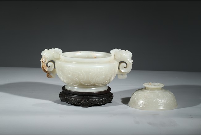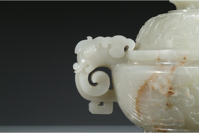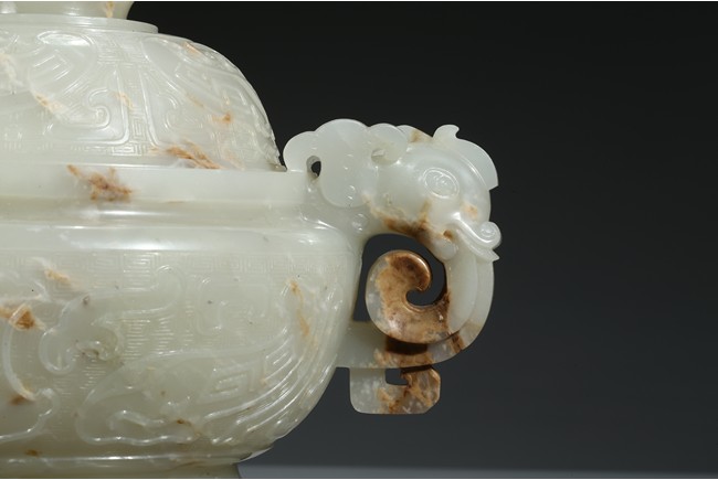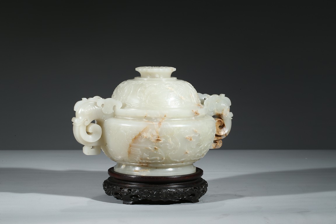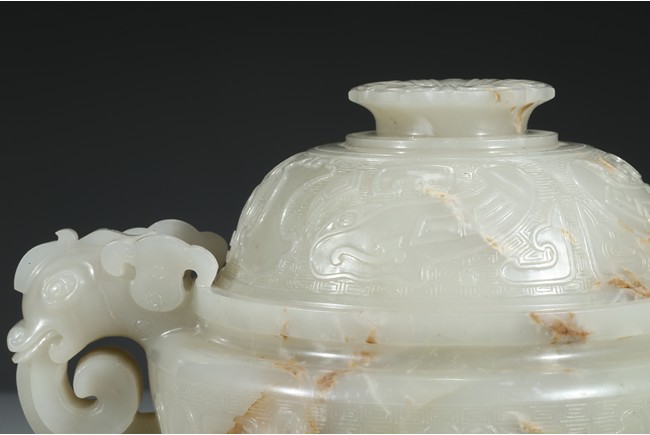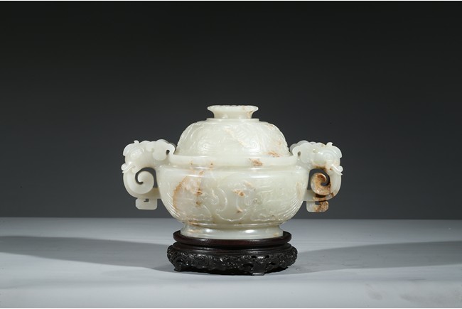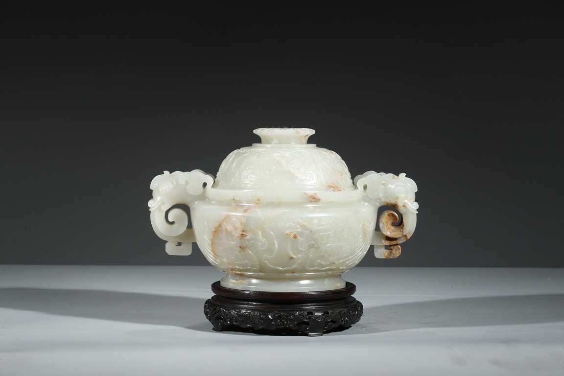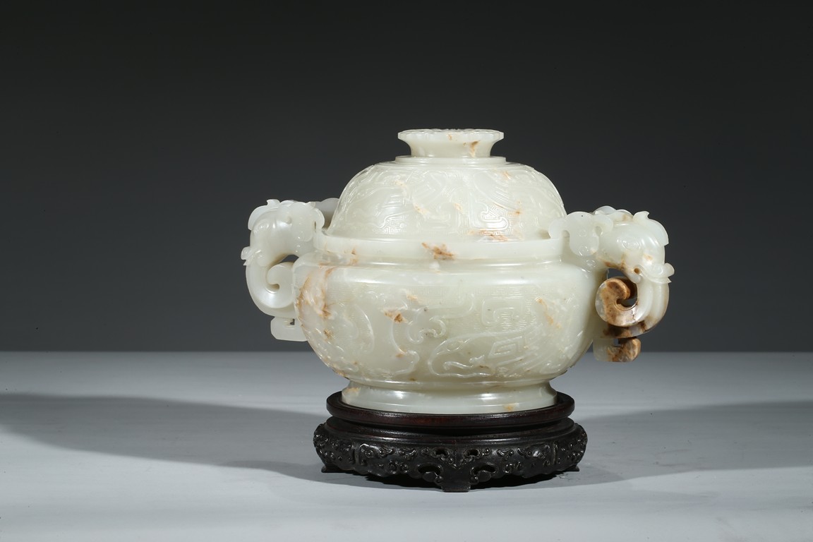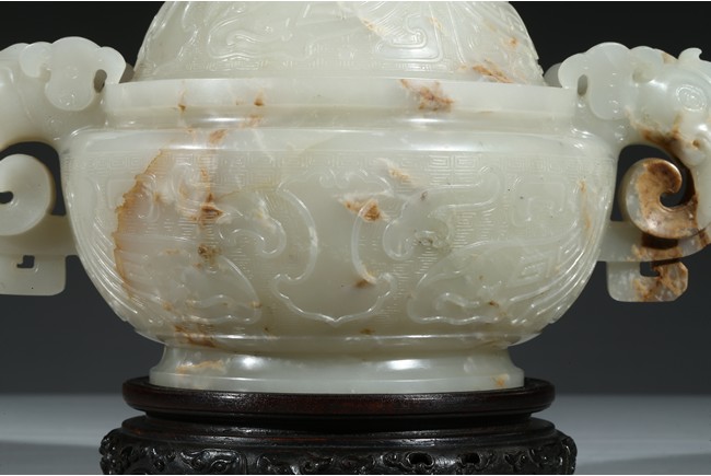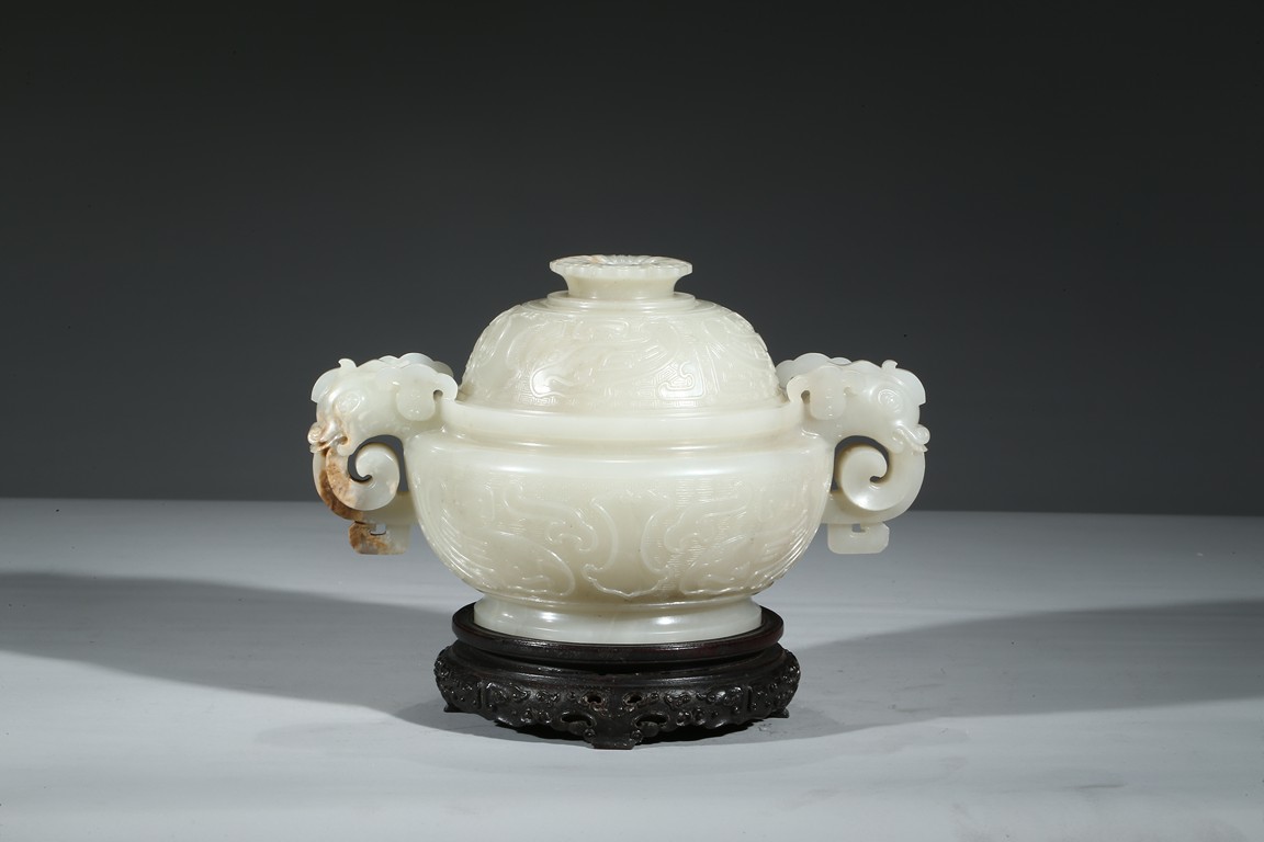 Of compressed globular form, the body carved in shallow relief with taotie mask, flanked by two mythical beast handles, the domed cover carved with archaistic pattern. Qing Dynasty period.