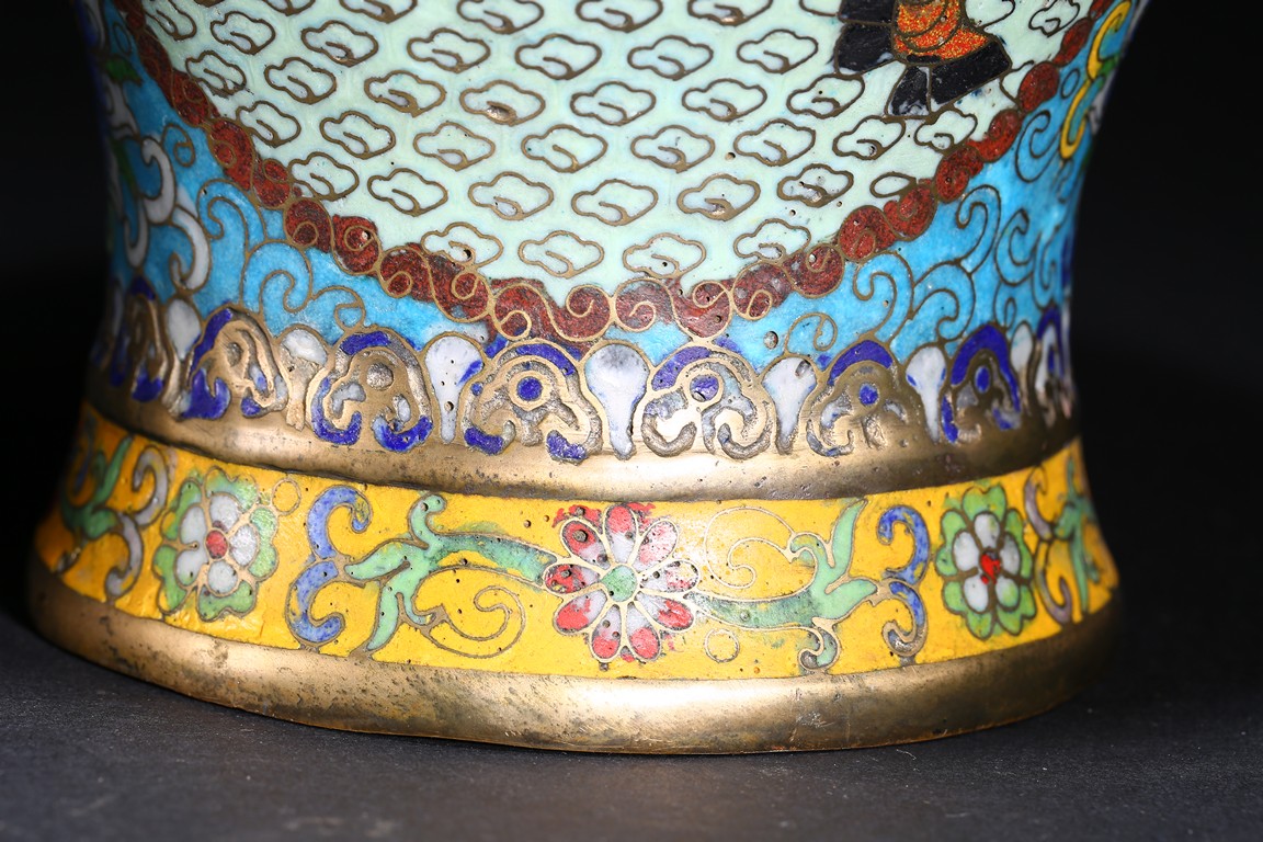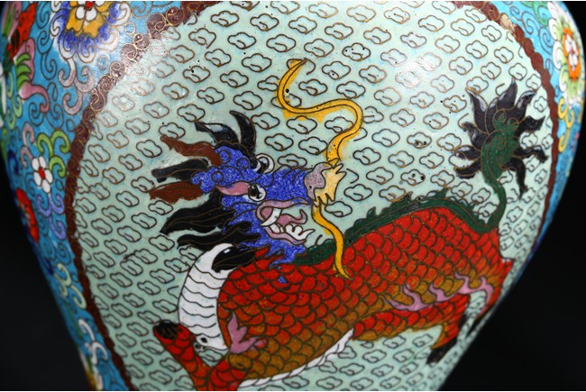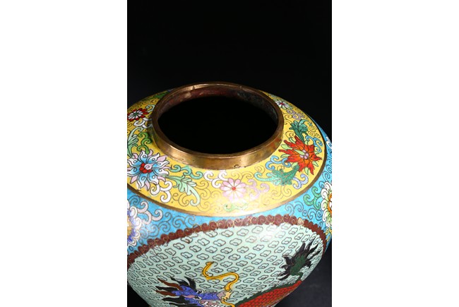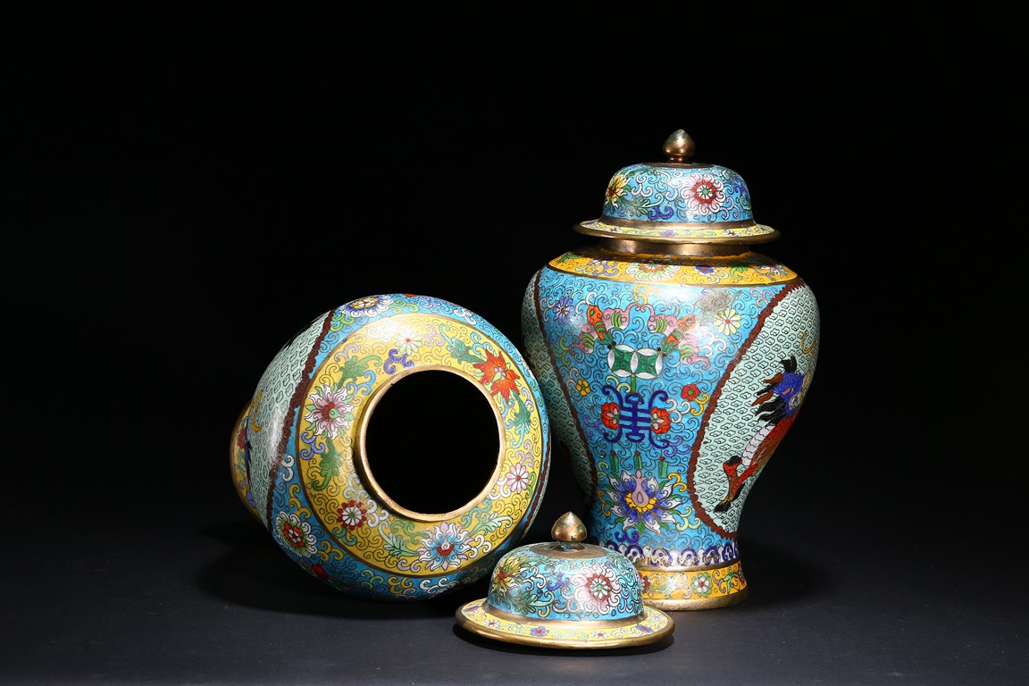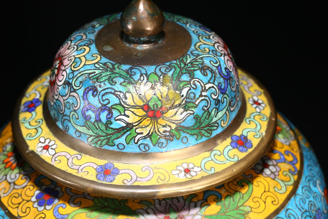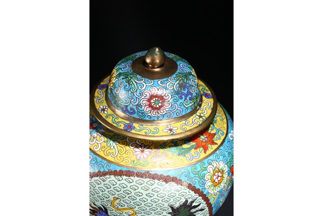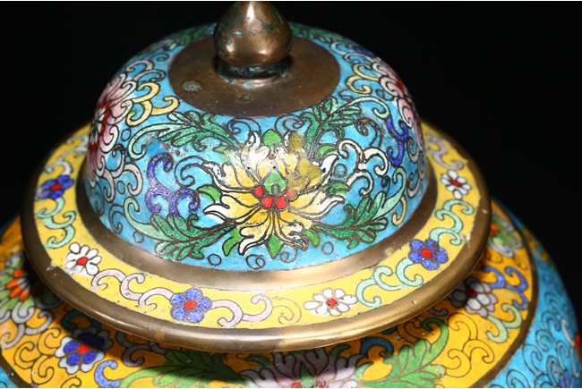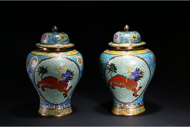 "此銅胎掐絲琺瑯蓋罐表面繪有麒麟、蓮花纏枝圖案,體重、花紋細緻,工藝精巧。 "麒麟騰雲"寓意太平安康,"蓮花纏枝"寓意多子多福,長壽吉祥,是典型的乾隆年間擺飾品。"