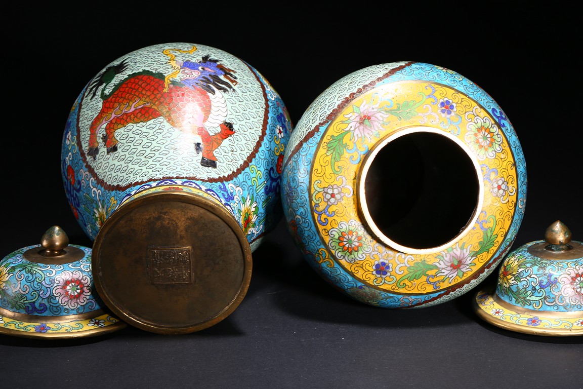 Each jar enamelled to depict a qilin beast on the body, completed with a cover decorated with lotus scrolls. Qing Dynasty period.