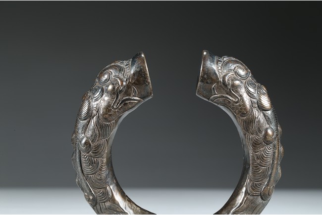 Modelled as an opened circular bangle with two dragon heads at both ends. 17th century.